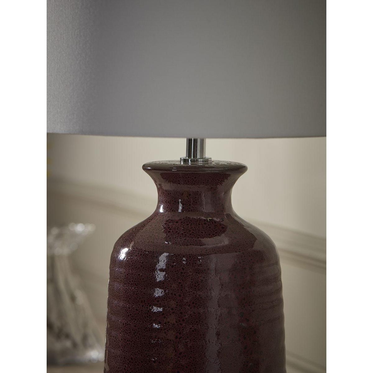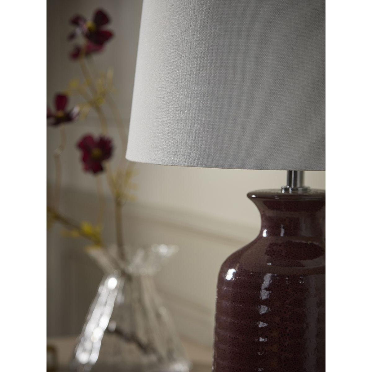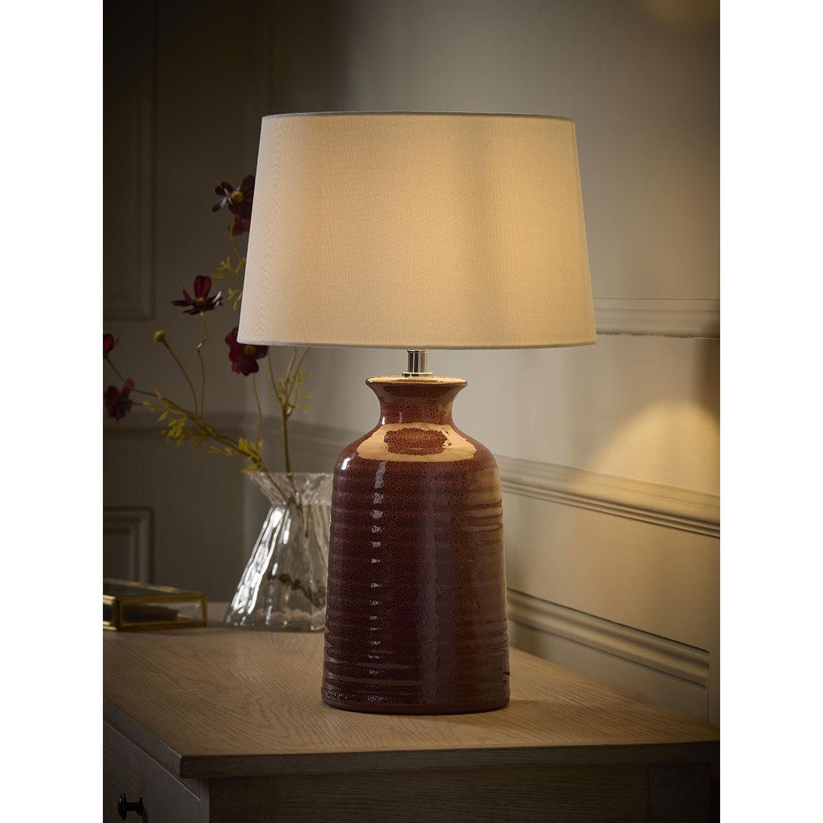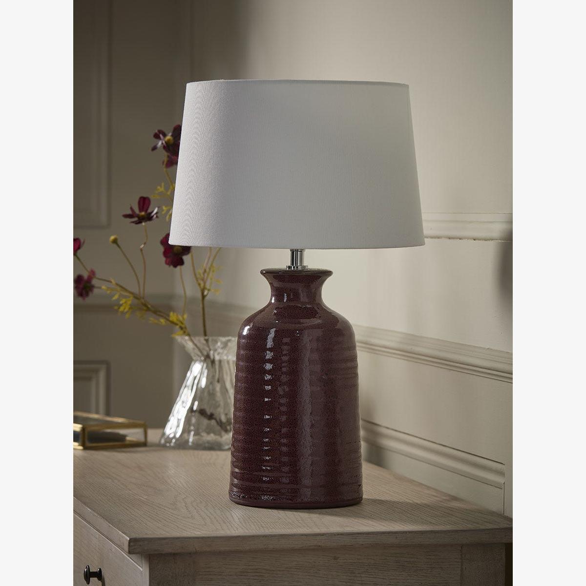 With a glossy bottle shaped design depicting textural rings, this lamp base is the on trend shade for this season's cosy styling.  The reactive glaze of the ceramic base means every lamp is unique. The lamp comes with a simple drum shade in a neutral polycotton fabric.  Discover how to create the perfect lighting scheme for your home using our Lighting Buying Guide.