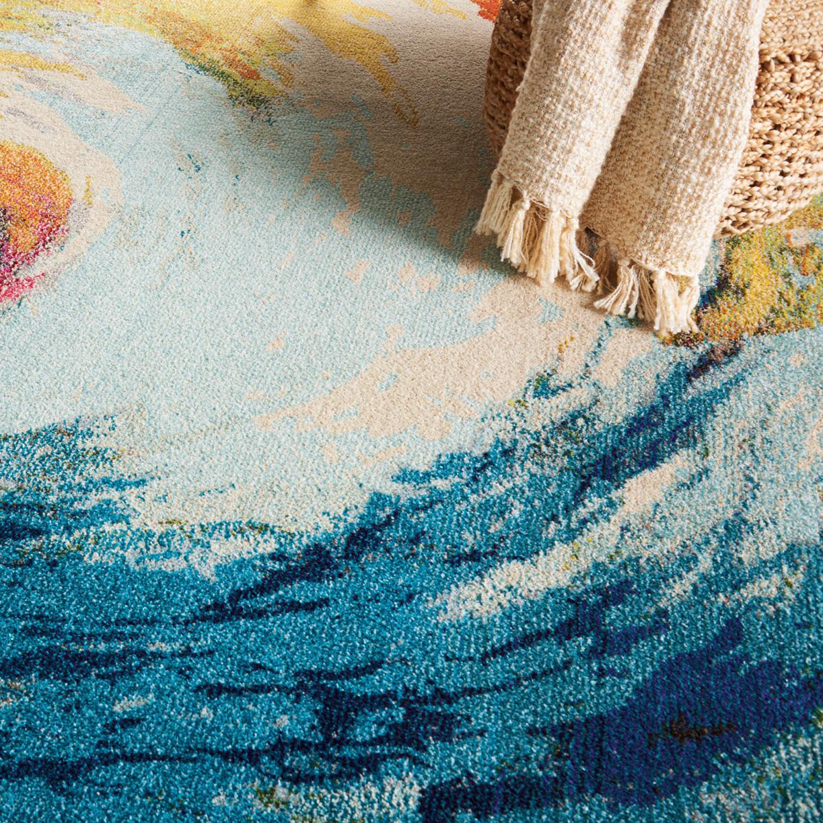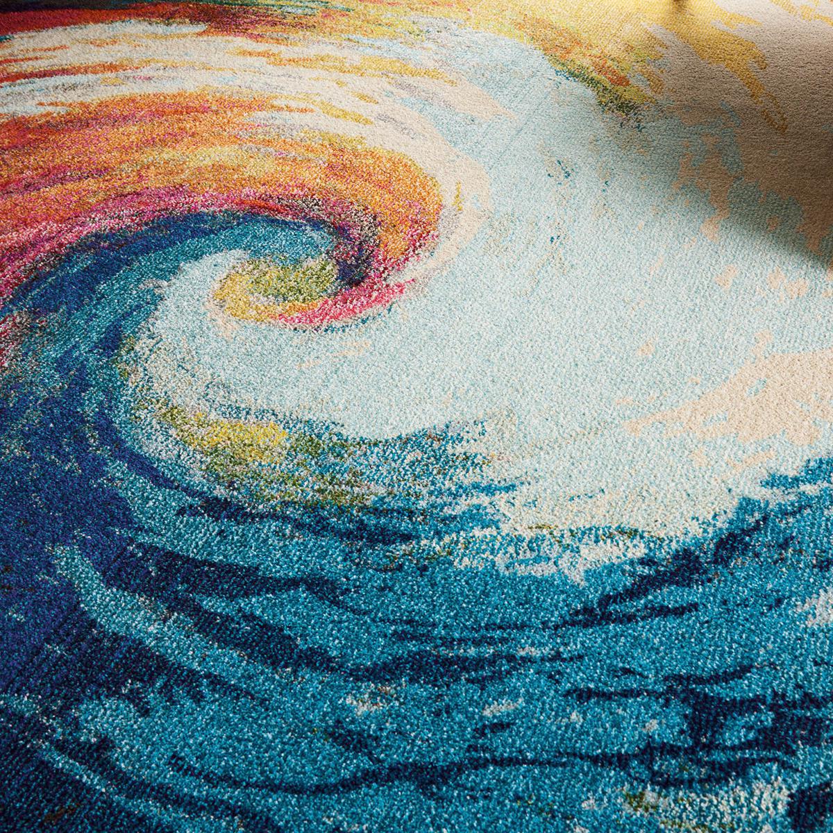 The multi coloured celestial wave rug is a vibrant and dynamic piece that works well in contemporary or eclectic interiors. I love how its lively palette can provide a pop of colour and visual interest to neutral rooms, or complement other colourful elements in a space. It’s particularly effective in living areas or bedrooms where underfoot comfort and a focal point are desired. Practical styling tips include layering it with muted or solid-coloured furnishings to let the rug truly stand out, and pairing it with simple accessories to avoid overwhelming the space. Due to its bold design, it’s best used in well-lit rooms to showcase its full colour spectrum and to prevent the pattern from becoming too busy.