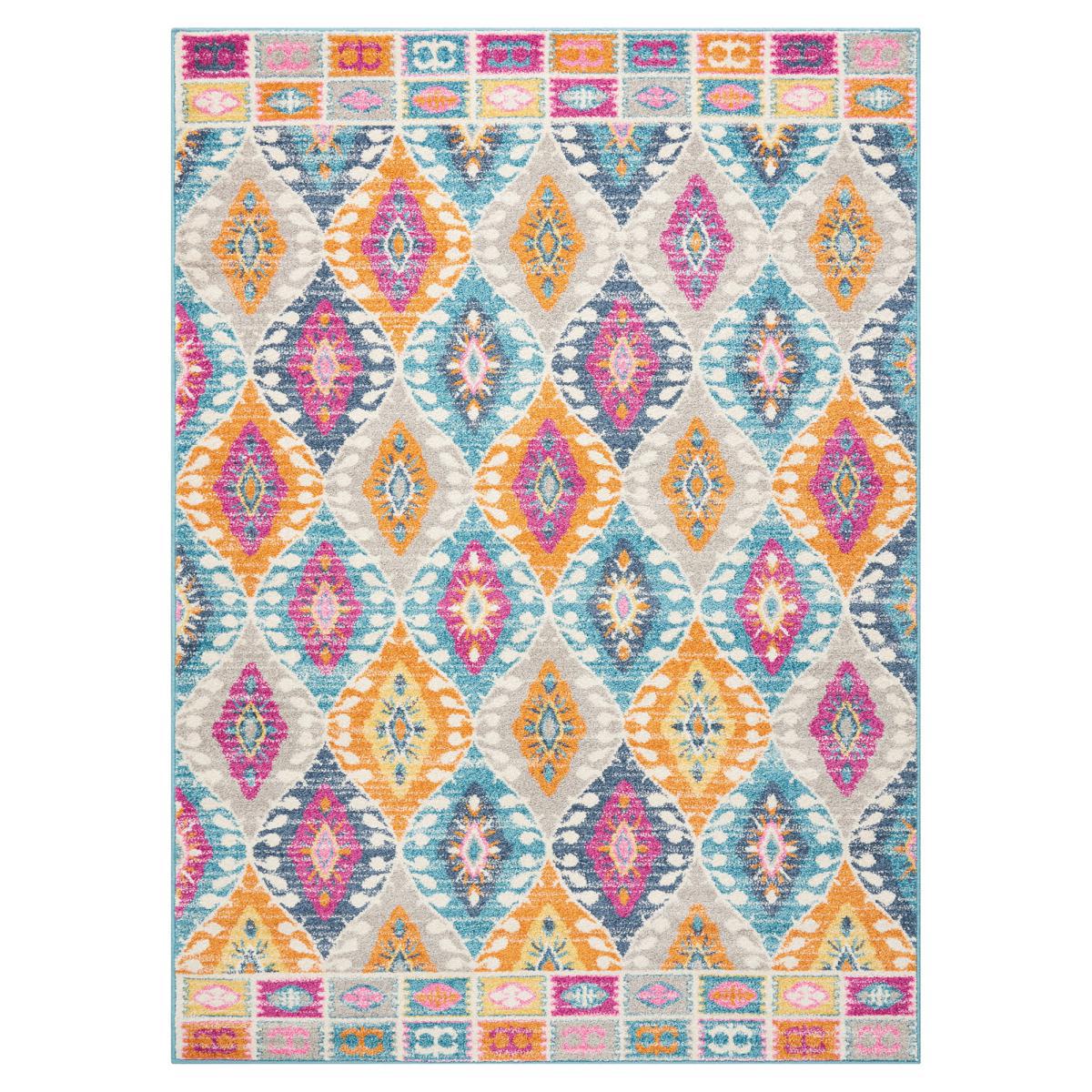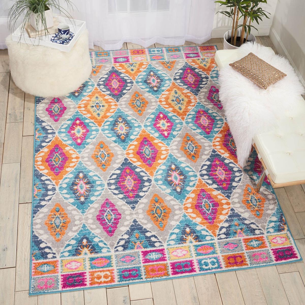 Imaginative flowers in lush and saturated pigments grace this Passion collection of rugs with a beautifully colorful presence. The artful palette mixes fuchsia, petal pink, apricot and lemon on a patinated background of denim blues. These fantastic florals and geometric designs combines hints of Persian antiquity in a modern interpretation to create a stunning and versatile statement piece. Skillfully woven Polypropylene fibers on state-of-the-art power looms combines thick, comfortable pile with an easycare approach. Advanced overdye techniques create an exciting patina effect in shades of pink, blue, and orange. Made from high quality polypropylene, it has been master batch dyed for lasting colour fidelity, expertly woven to Nourison’s superior quality standards on proprietary powerlooms, and finished with a practical jute and latex backing. To ensure your rug lasts, gently vacuum on a weekly basis to remove surface dust and dirt. Do not pull any loose threads, cut carefully with scissors to remove. Occasionally rotate the rug to equalise wear and avoid prolonged exposure to direct sunlight. Clean spills immediately by blotting with a clean cloth. Do not rub. If stain persists, seek professional cleaning. Please note, unfortunately we cannot deliver this item to the Channel Islands. Don’t forget to buy our anti-slip mat. Here. , available in a choice of sizes.