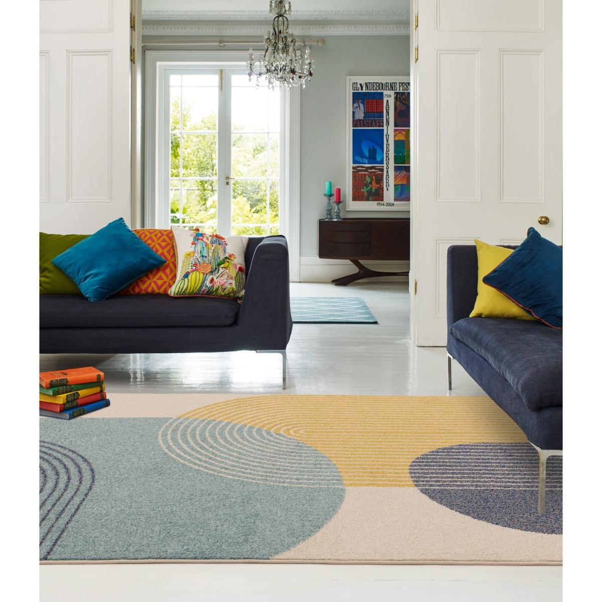 Bring your home to life with the Muse rug. The retro geometric pattern in on trend blues and yellows give this rug a large personality, perfect for your living space. The nature of the material, polypropylene, ensures the rug is practical as well as boldly stylish.