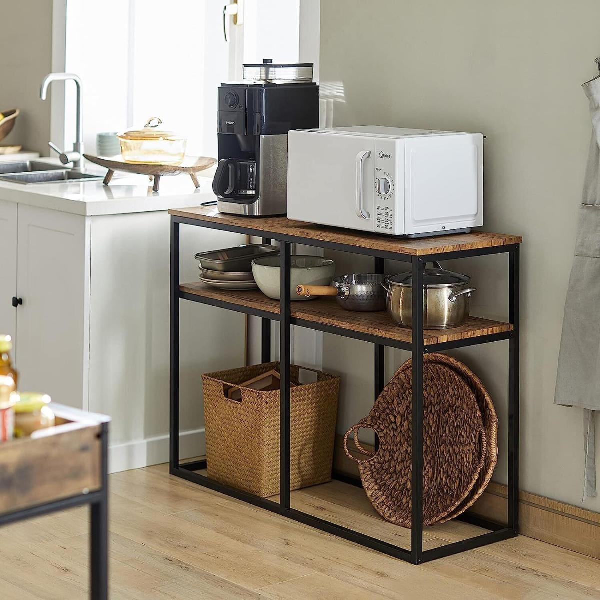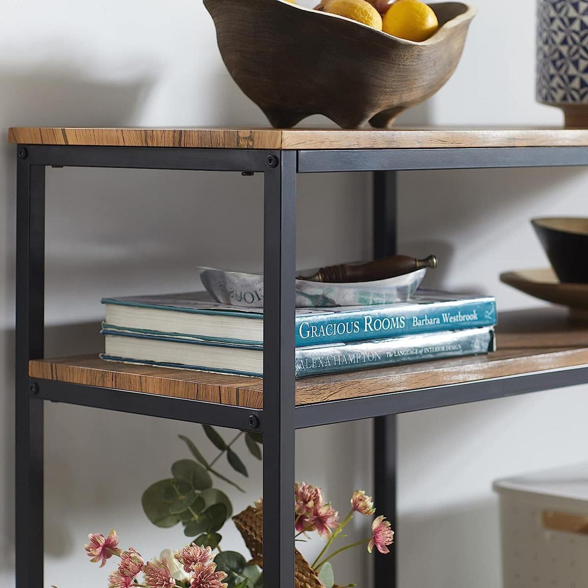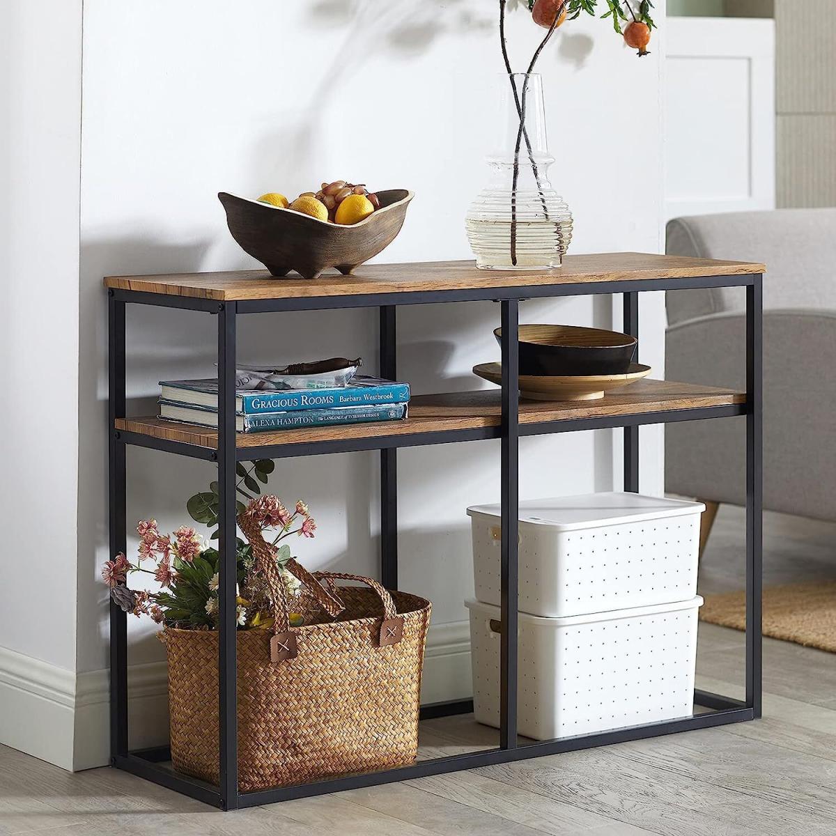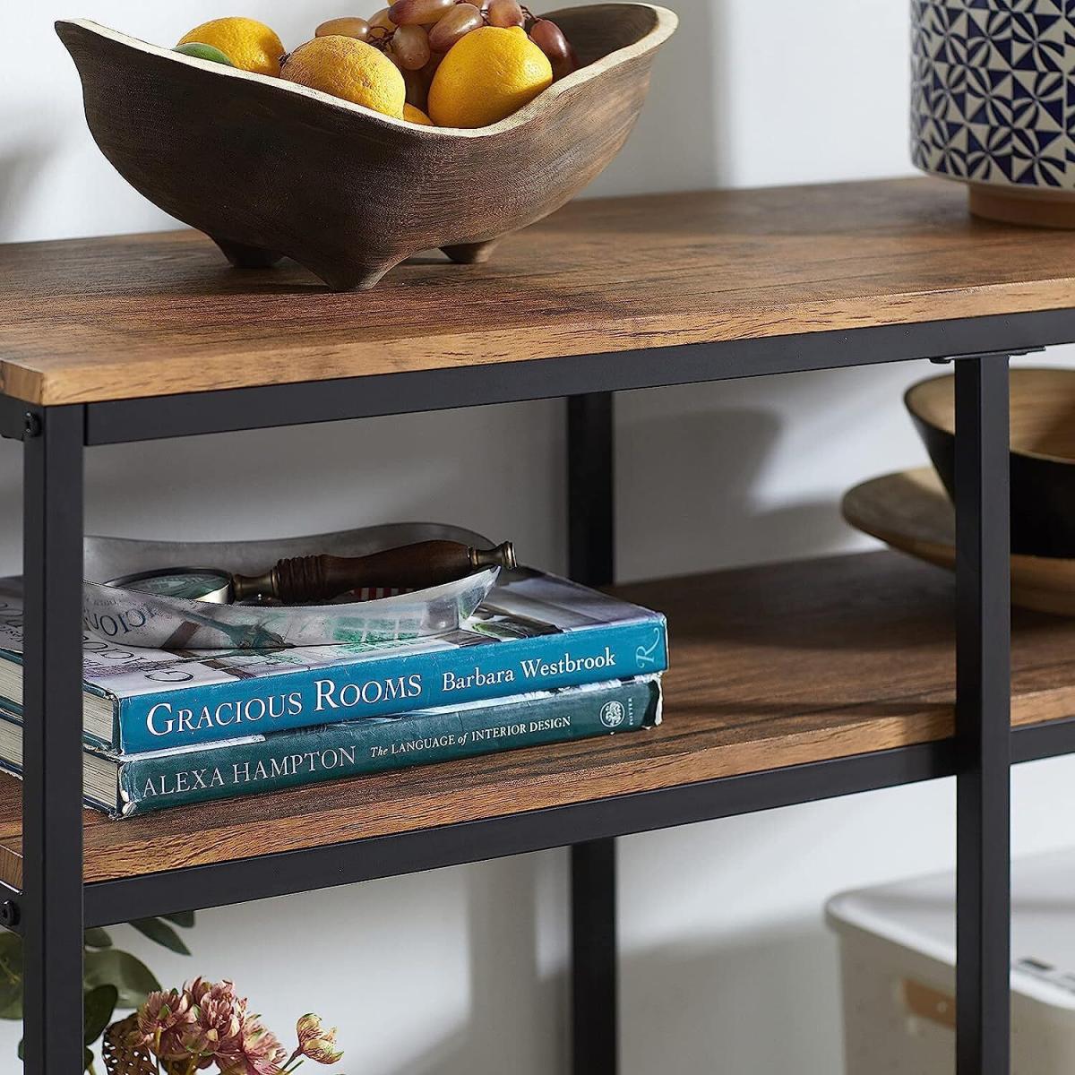 A diverse and contemporary product, would be suitable for a variety of locations, like hallway, living room, dining room and office.2 shelves provide plenty of storage and display space for you. The space beneath the shelf offer additional large storage and display space for you. Made of high quality MDF with wooden effect and black powder coated steel frame. Stable and durable. It is very multi-functional due to the slender and clean design yet practical feature. The simple lines and subtle industrial style will give a contemporary twist to the focal point of any living room.