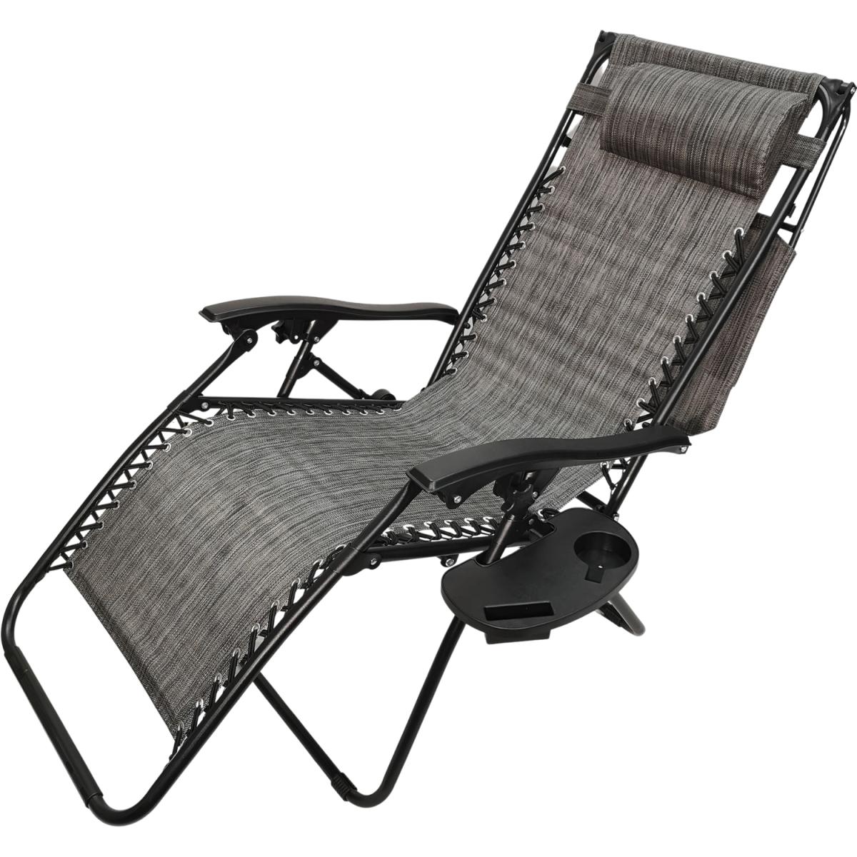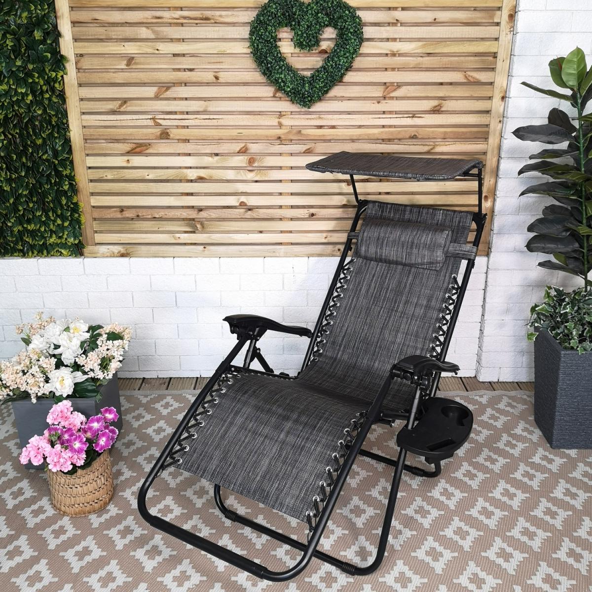 Lie back and relax in your garden this year with this multi position zero gravity chair. Perfect for the garden or patio this reclining chair lounger is made with a sturdy powder coated Black metal frame with a durable Grey textoline fabric. The chair lounger features a removable pillow on the headrest for extra support and a canopy that is manoeuvrable. The design is operated by weight alone, simply take a seat and lie back as the back lowers your feet will raise and lift you into a comfortable reclining position and the natural movement of sitting up will prompt the chair to move with you. The chair also features a detachable cup holder tray that fixes onto the side. When not in use this chair is easily folded down to a compact size to be stored away. Max weight 120kgs Fully reclined Dimensions H: 110cm L: 160cm W: 64cm Folded down H: 90cm L: 67cm W: 15cm