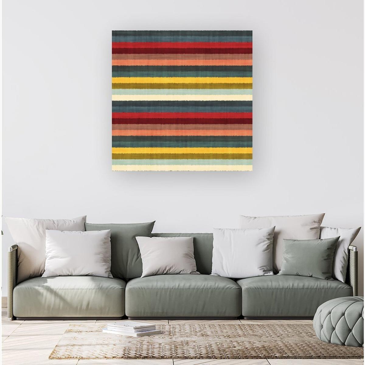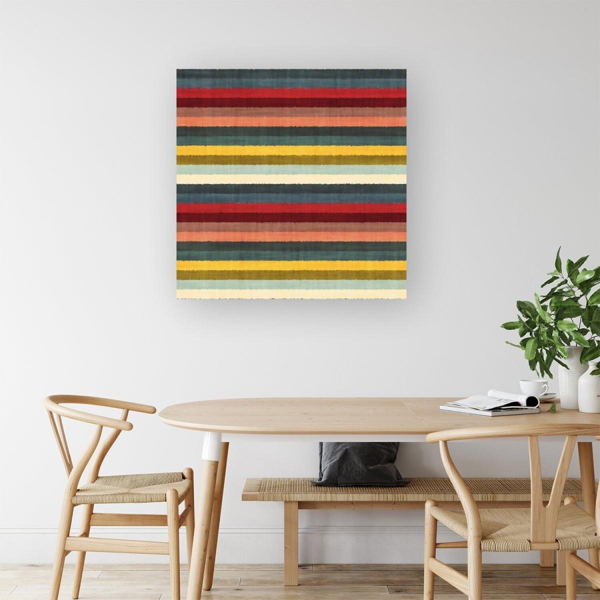 I love this piece for its bold, multicolour stripe design with a sophisticated grey background, making it versatile for various interiors. It works particularly well in contemporary or modern spaces where you want a pop of colour without overwhelming the room. It’s perfect as a statement piece above a neutral sofa, like in the photo, or in a minimalist setting to add visual interest. Practical styling tips include balancing the boldness of the print with softer accessories-think neutral cushions or understated furniture. Also, its large size makes it an ideal focal point, so consider pairing it with simpler surroundings to really let it shine.