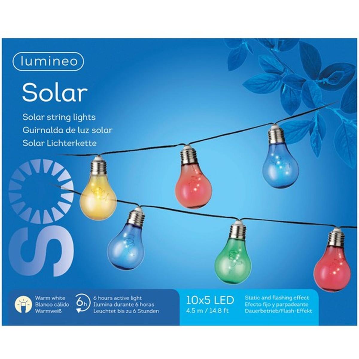 Lumineo set of 10 coloured solar powered globe lights. Create the perfect party atmosphere with this set of solar powered colourful globe string lights. Featuring 10 multicoloured bulb shaped lights lay out along a black lead cable. Each 10cm colourful plastic bulb includes 5 warm white LEDs on a coiled wire which gives off a welcoming warm glow when illuminated. The solar power feature gives up to 6 hours of light once charged, automatically lighting up at dusk. The lights also have a function setting so you can choose a twinkle effect or a simple static effect. With a 4.5m lit length and a 5m lead cable from the solar charging unit, this set of lights is perfect for placing around your garden, whether its along a fence or pergola or a garden gazebo, they are an ideal lighting solution for your outdoor space to be enjoyed by all of your family and friends.