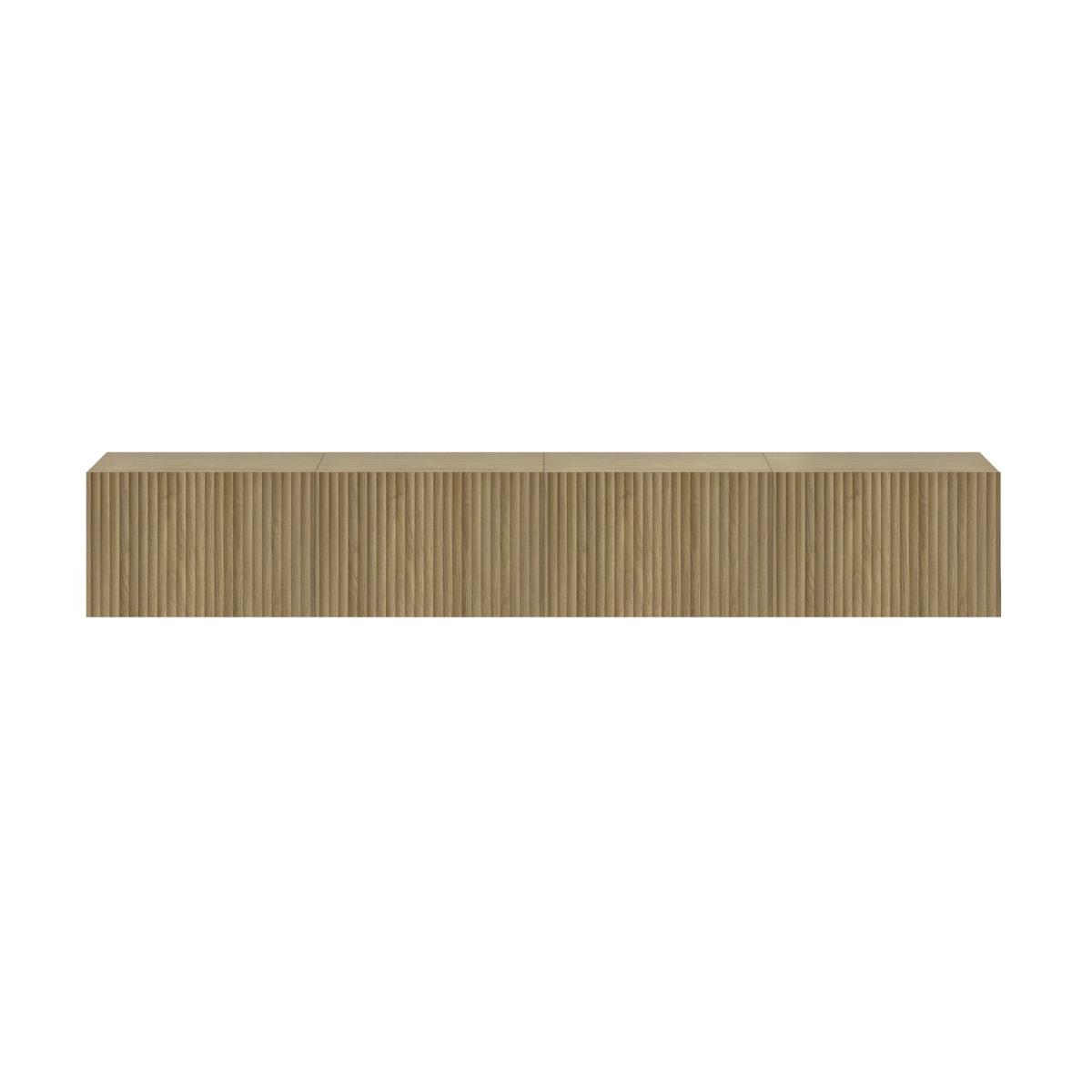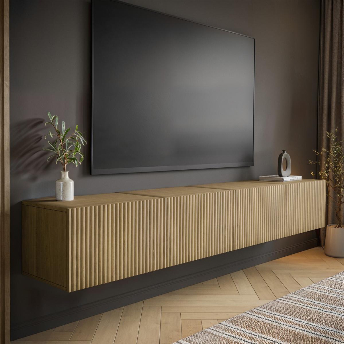 Wall Mounted Option This wall-mounted TV stand offers a space-saving, minimalist design by securely attaching your unit to the wall, freeing up floor space and creating a sleek, modern aesthetic that’s perfect for all living rooms and contemporary spaces. Freestanding Option The additional chunky feet provide a stable, versatile base for your TV, combining functionality with classic furniture design that sits firmly on the floor, offering storage and style without the need for wall installation. Fluted Effect Doors Featuring a textured, fluted exterior, this TV stand blends effortlessly with modern or minimalist decor. Soft Close Doors Featuring soft close doors with a push catch mechanism, this TV unit has ample storage space with the addition of a cable hole to keep all your wires tidy. Choose between a wall-mounted floating design for a clean, contemporary look or the freestanding option, complete with sturdy, removable feet for extra stability. Each cupboard includes a built-in cable management hole, ensuring a neat, clutter-free appearance by keeping wires organized and hidden. The smooth push-to-open mechanism on the cupboard doors eliminates the need for visible handles, maintaining the clean aesthetic and ensuring easy access to your stored items. Realistic wood-grain finish offering a warm and authentic look and enhances the cosiness of your space. Featuring a textured, fluted exterior, this TV stand blends effortlessly with modern, transitional, or minimalist decor. Spacious design accommodates TVs up to 85 inches, making it the perfect centrepiece for expansive living rooms or home theatres. Upgrade your living room with this stylish and practical modern TV stand, designed to transform your home entertainment setup with a clean, minimalist aesthetic. Perfect for large TVs up to 85 inches, this unit is ideal for spacious rooms and impressive setups, providing ample storage. Its versatile design lets you choose between a wall-mounted floating TV unit or a bold freestanding TV cabinet with optional feet, offering ultimate flexibility. The Hazel TV unit with storage is the perfect choice for a modern living room upgrade, seamlessly blending functionality with contemporary style.