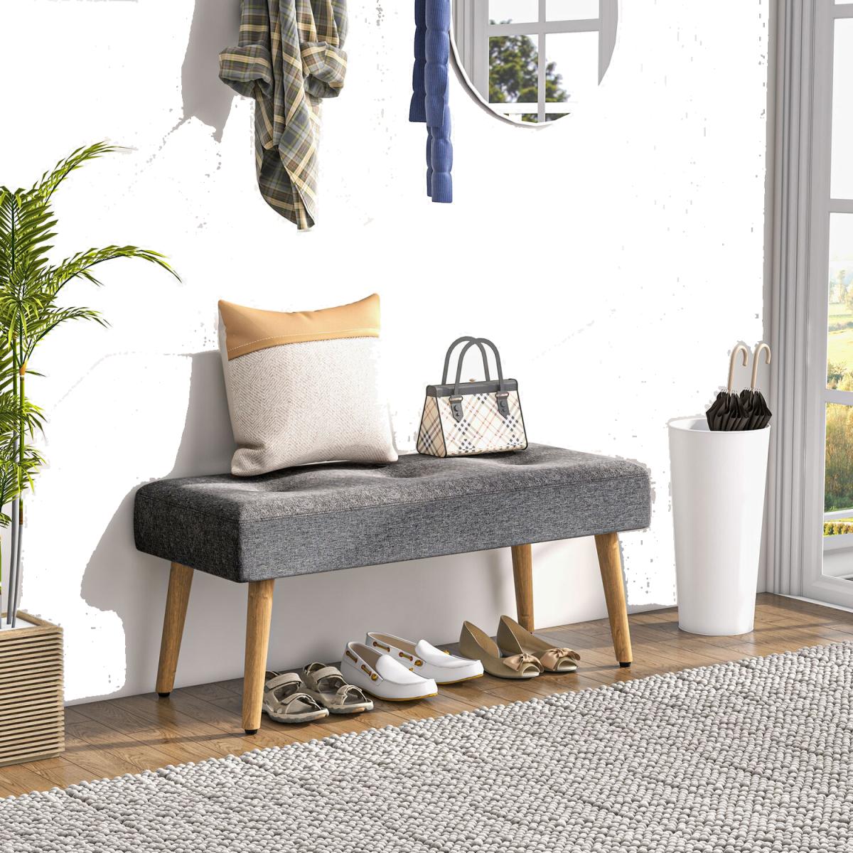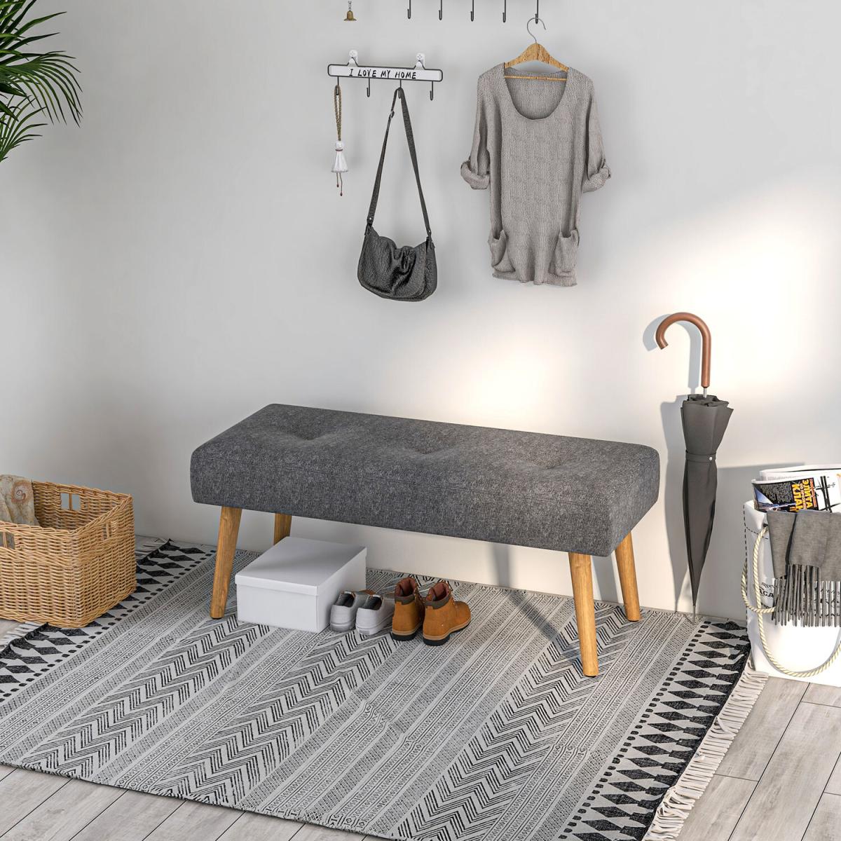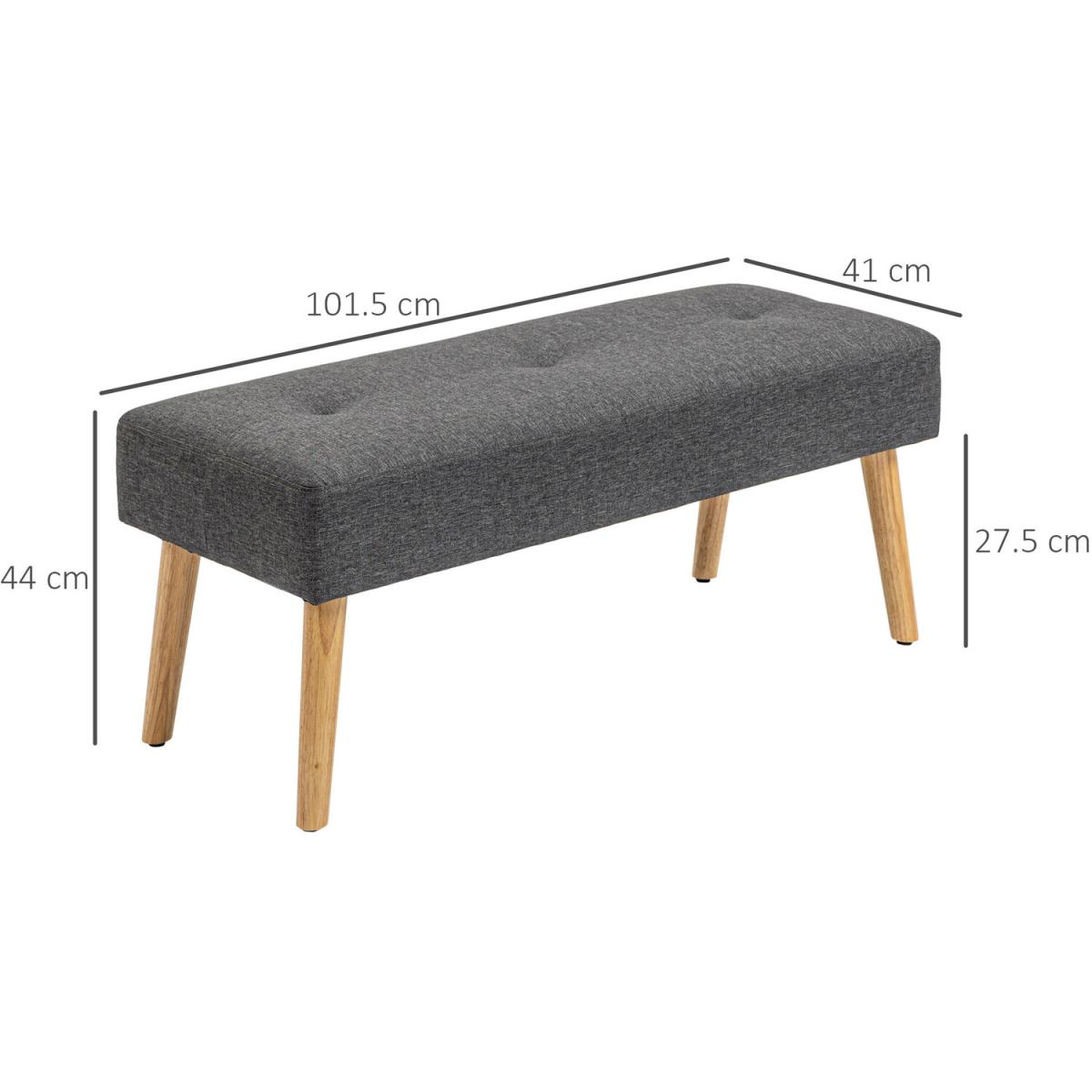 Smart and versatile, this HOMCOM side bench is one to use all over the home, however you want. The grey seat and natural finish of the wood make it a simple design. A padded seat to keep you comfortable the linen upholstery is smooth on the skin. It comes with a wooden frame and legs for full support, complete with foot pads to gently protect your floor.