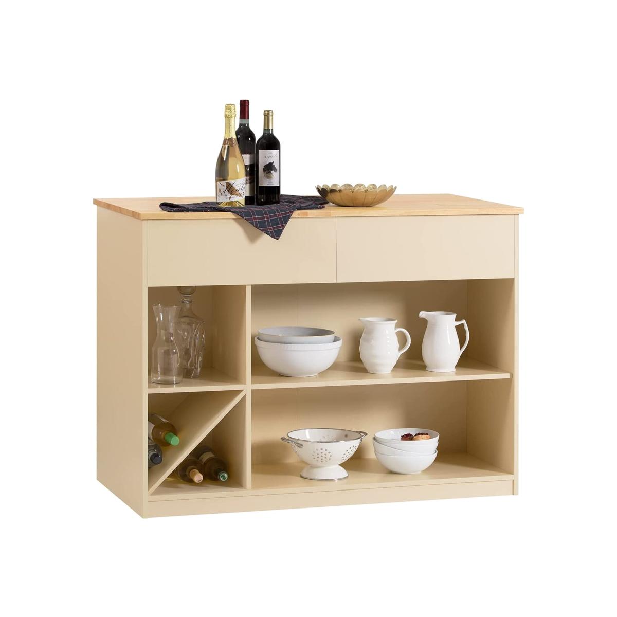 This modern design kitchen island cabinet sideboard is designed for various storage space and durable usage. The worktop made of solid rubber wood provides plenty of space to store and prepare food. There are 2 slide-out drawers, 2 large open storage compartments and 2 small open storage compartments, offering you various storage needs. The small compartment on the lower left corner is divided into 2 parts due to the diagonal panel, ideal for storing wine bottles. It can be perfectly used as a dining table or bar table if you sit at the back of the cabinet. Convenient and practical. Multifunctional as well as fashionable it can be used as a storage island in the kitchen, sideboard in the dining room, and storage display cabinet in the living room. With this cabinet, your home would be more stylish and spacious. It will fit perfectly with any style of decor. The 2 in 1 design (storage cabinet and bar table) is space-saving for your home and great value for money.