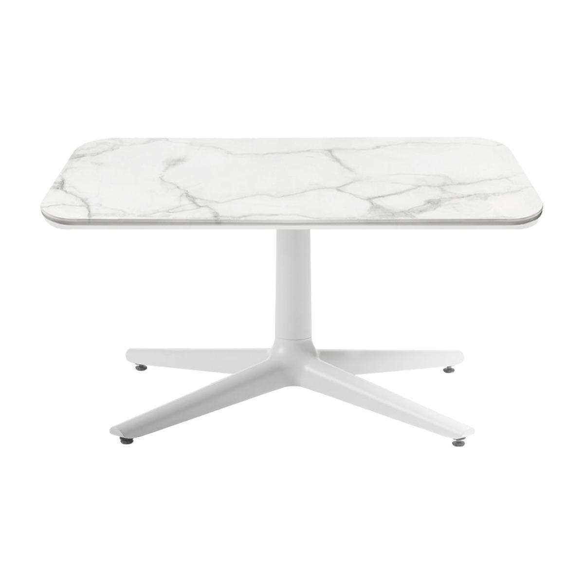 This large coffee table is both sophisticated and modern, it stands out due to its superb white marble effect top. It is made from stoneware: this type of ceramic very realistically imitates marble, both to the eye and touch. The illusion is perfect and there is no tedious cleaning! It is lighter and easier to maintain than marble, and the stoneware top perfectly imitates white marble delicately veined with grey. Noble and refined, the top with rounded angles contrasts with the modern slender metal base. This table has a central 4 branch base. This large coffee table majestically inhabits large spaces. The XXL top enables several to eat around it, to serve large cocktail dinners and even work at it. This coffee table can be used inside and outside.