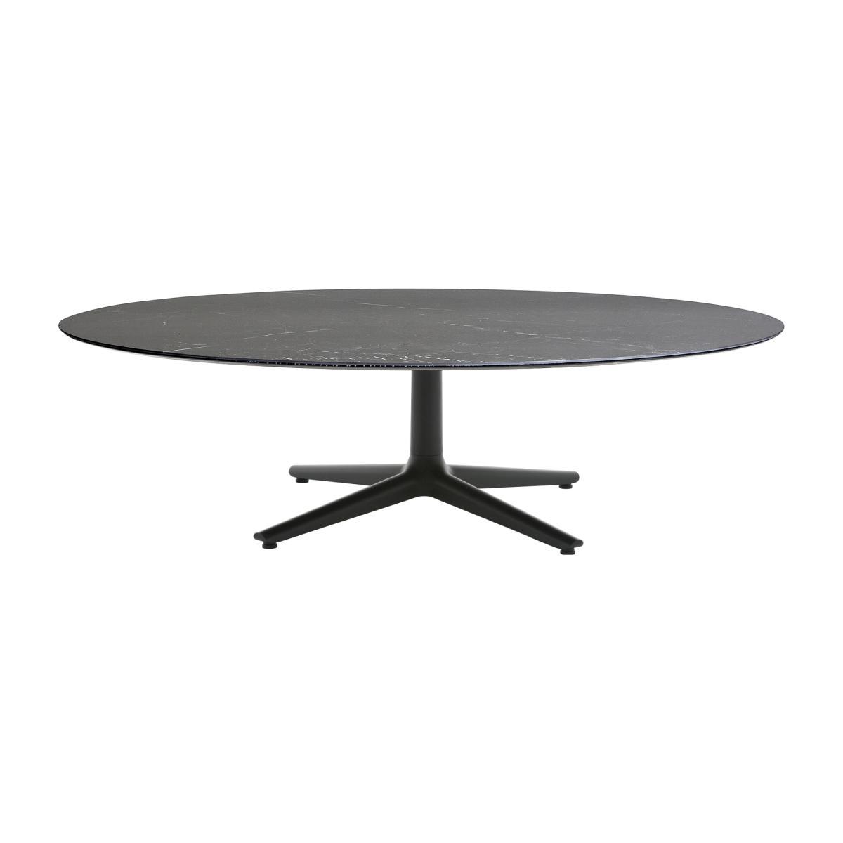 This large coffee table is both sophisticated and modern, it stands out due to its superb veined black marble effect top. It is made from stoneware: this type of ceramic very realistically imitates marble, both to the eye and touch. The illusion is perfect and there is no tedious cleaning! It is lighter and easier to maintain than marble, and the stoneware top perfectly imitates black marble delicately veined with white. Noble and refined, the top contrasts with the modern metal base. The central foot has a 4 branch base. This coffee table can be used indoors and outdoors.