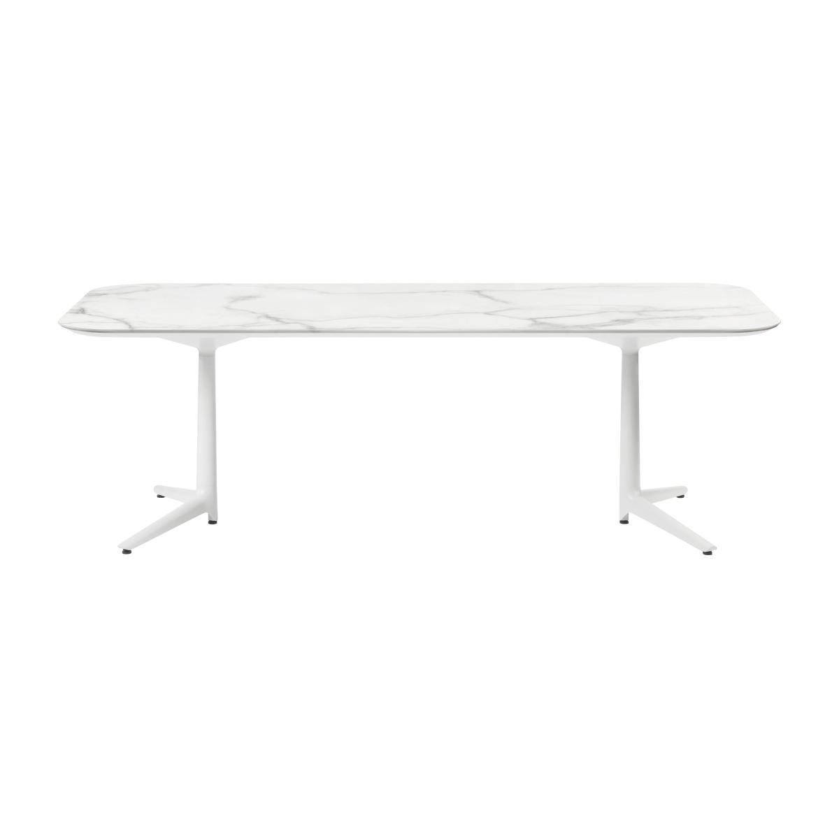 This table that is distinguished by its white marble effect superb tray has a character that is both sophisticated and modern at the same time. It is made from stoneware: this ceramic imitates marble in a very realistic way both to the eye and by touching. The illusion is perfect and without tedious maintenance! While being lighter and easier to maintain than marble, the stoneware perfectly imitates white marble criss-crossed with delicate grey veins. The noble and refined rounded angle tray contrasts with the contemporary style of the slender, metal base. This table has two two-legged legs. This table can be used inside as well as outside.