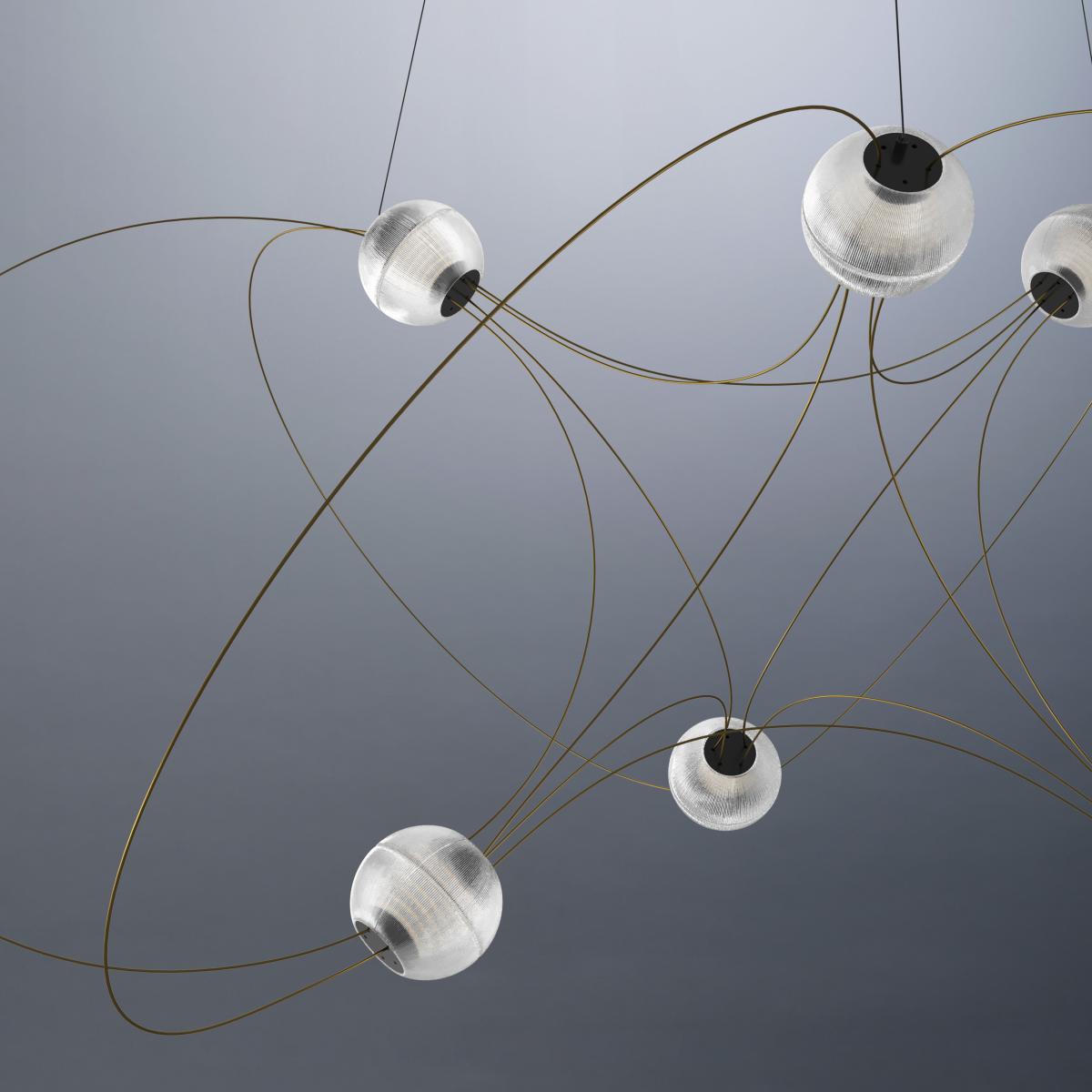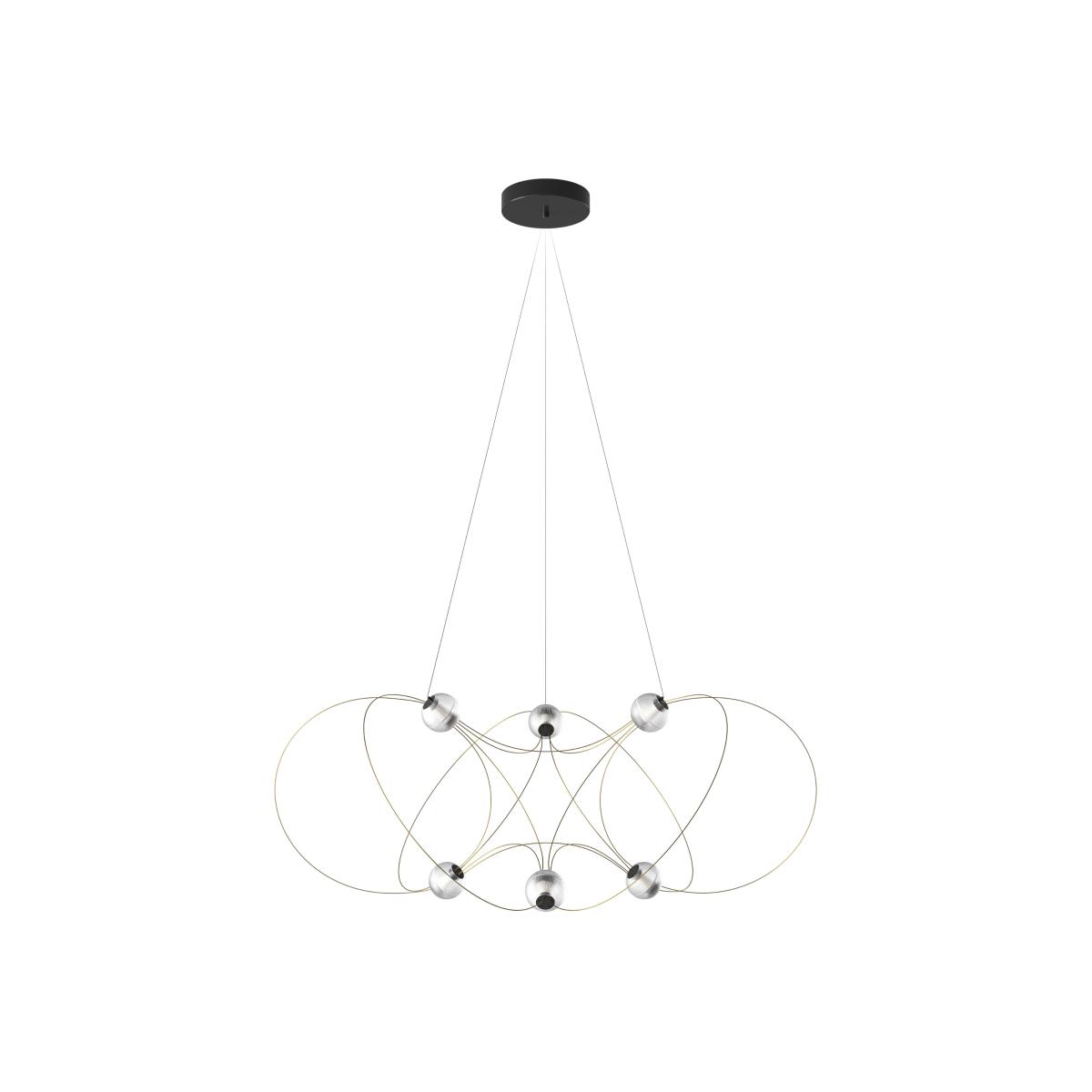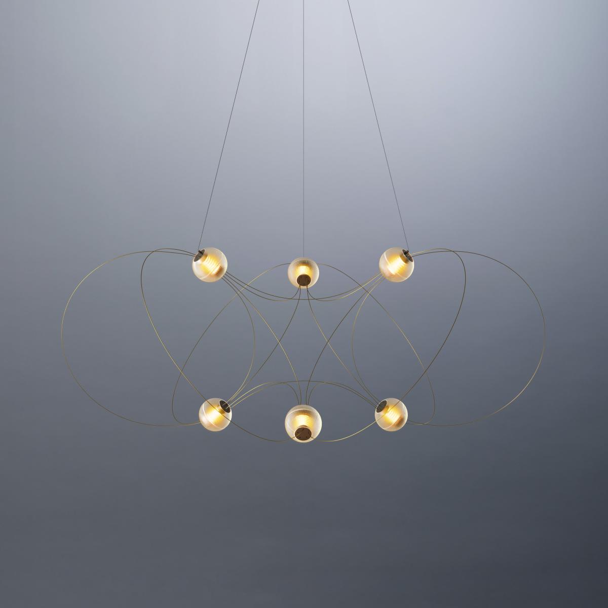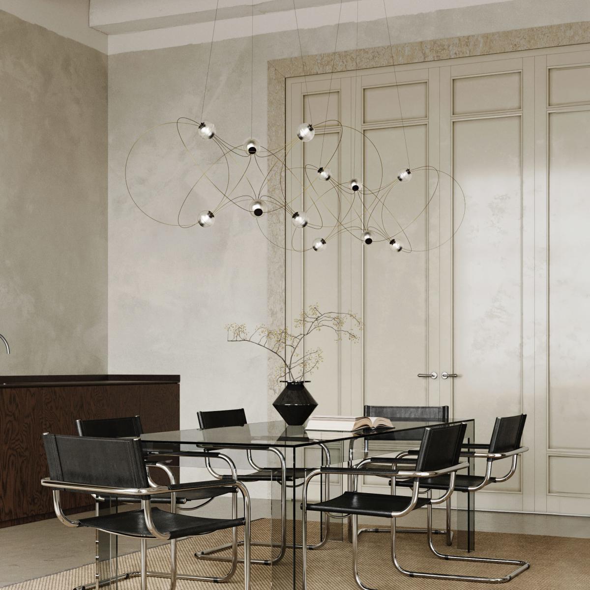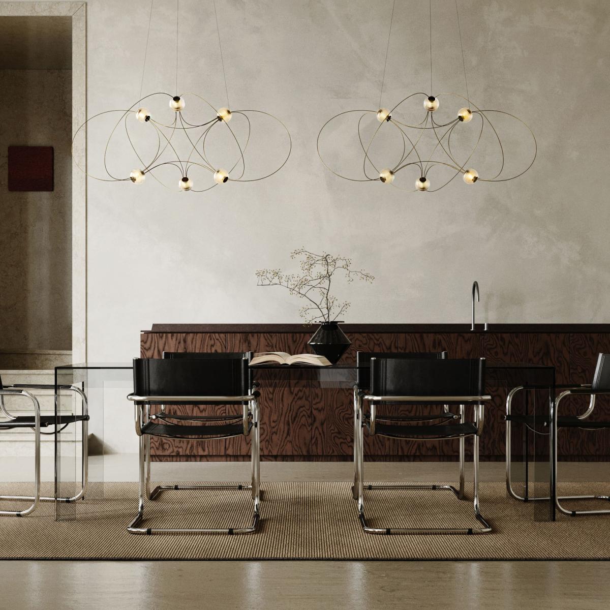 A light, graphic pendant, reminiscent of a magnetic vortex emitting powerful light, but as light as a dream... Signed by Portuguese designer Lutz Pankow, this luminous constellation is highly evocative. Some see in it a flight of butterflies, a set of luminous atoms in gravitation, an elliptical choreography of planets, a scientific Toy... A music lover might hear a silent symphony conducted with a wand by the electricity fairy.