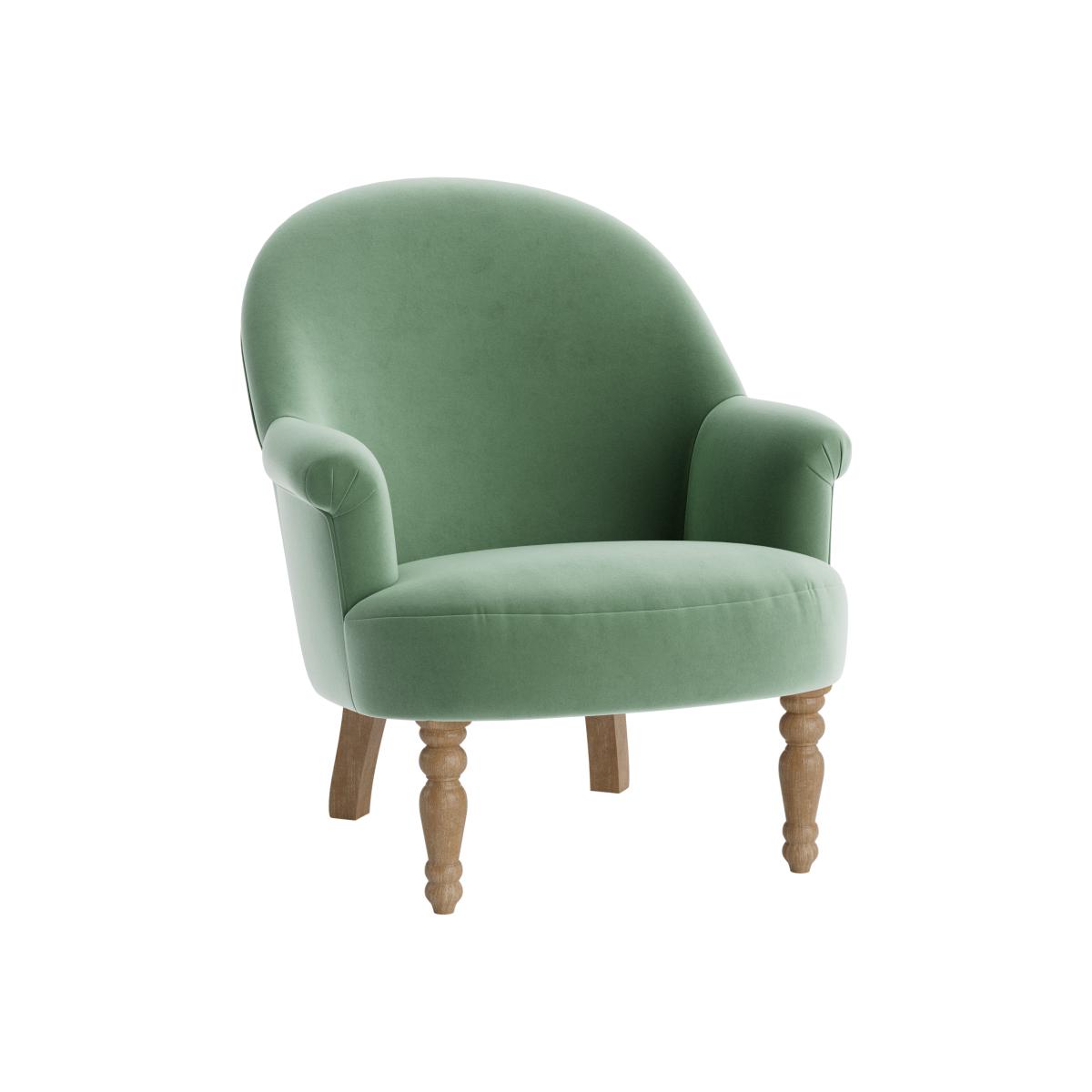 I love this little armchair for its inviting shape and soft green velvet finish, making it a versatile option for adding colour and texture to a variety of interiors. It works particularly well in cosy living rooms, reading nooks, or as an accent piece in bedrooms. Its curved back and armrests create a welcoming silhouette, while the wooden legs add a touch of warmth. Practical styling tips include pairing it with contrasting cushions or throws to personalise your space, and placing it near a side table or beside larger seating to encourage conversation. Its compact size makes it ideal for smaller spaces, without compromising on comfort or style.