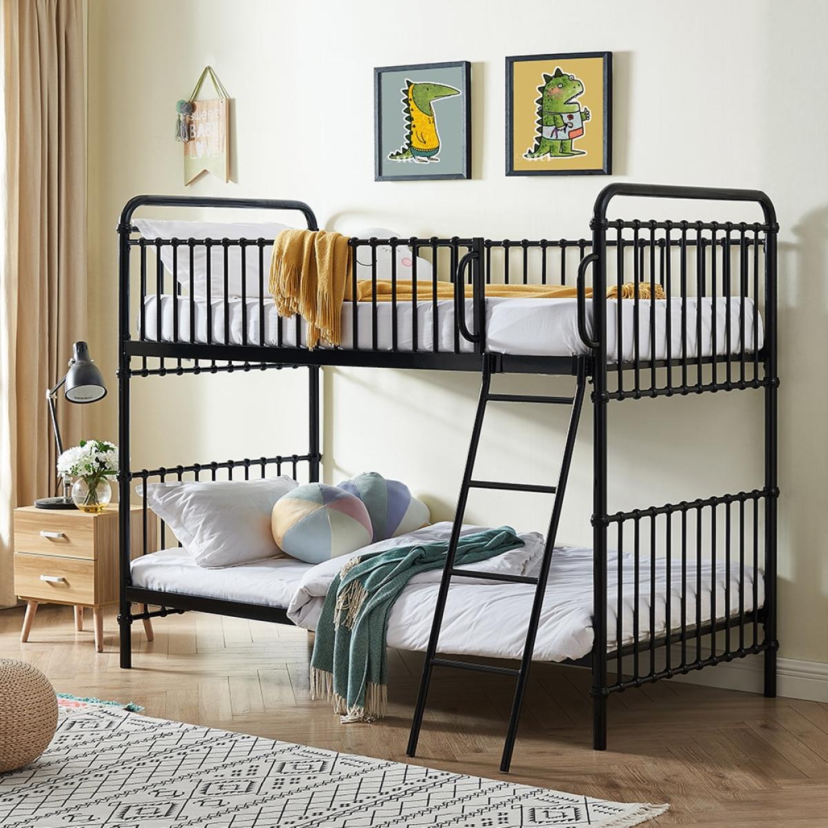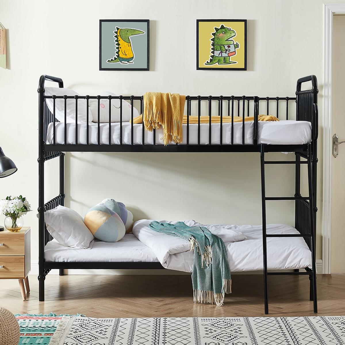 The Mungo Metal Bunk Bed in black is a sleek and versatile choice that works well in both modern and industrial-style interiors. Its minimalist metal frame lends an airy feel, making it perfect for smaller bedrooms or shared spaces. I love how it can be styled easily with colourful bedding or patterned cushions to add personality, or kept with neutral tones for a more understated look. Practical styling tips include adding a cosy nook underneath with a small rug and storage for toys or books, or hanging some wall art to give the room a playful vibe. Its sturdy construction makes it a practical option that pairs well with a variety of decor schemes, making it a timeless piece for any child's room.