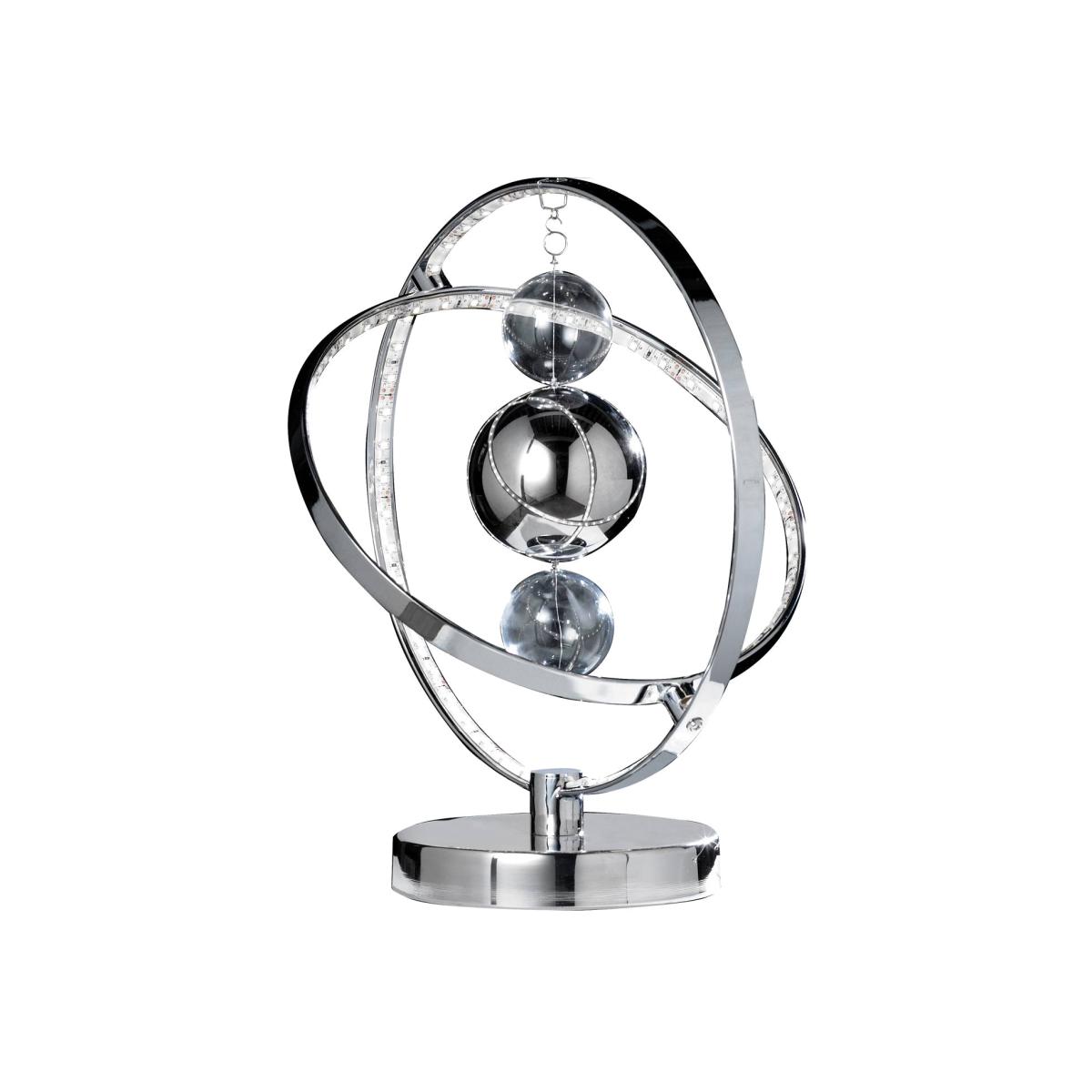 The Muni Table Lamp from PAGAZZI Lighting is a stunning statement piece with a modern polished chrome finish. The table lamp has a spherical frame with overlapping rings which are supported by a circular base. Polished chrome baubles suspend in the centre of the lamp, giving a focal point. The rings are lined with a total of 99 tiny LED lights which reflect off the central baubles to create a beautiful effect. This lamp measures a height of 325mm and is 280mm in diameter. Comes complete with fitted LED bulbs. Product Code: MUNI-TLCH The Muni Table Lamp from PAGAZZI Lighting is a stunning statement piece with a modern polished chrome finish. The table lamp has a spherical frame with overlapping rings which are supported by a circular base. Polished chrome baubles suspend in the centre of the lamp, giving a focal point. The rings are lined with a total of 99 tiny LED lights which reflect off the central baubles to create a beautiful effect. This lamp measures a height of 325mm and is 280mm in diameter. Comes complete with fitted LED bulbs. Product Code: MUNI-TLCH