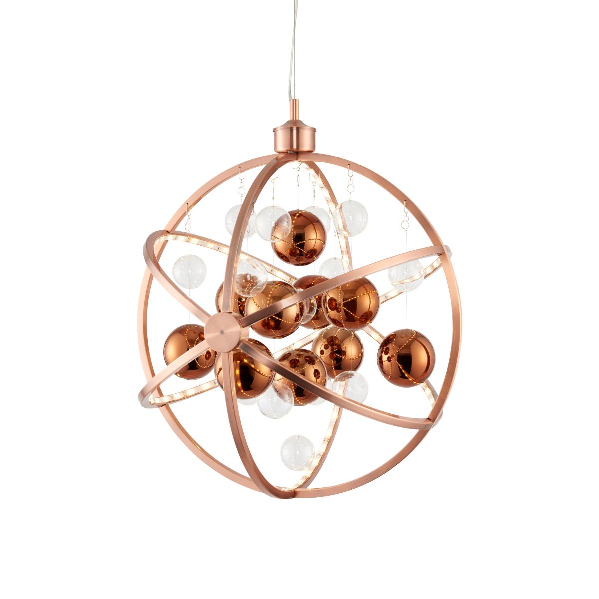 An LED pendant with a polished copper finish. A mix of clear and copper plated balls hang at various heights from the two crossing horizontal hoops. Height adjustable at time of fitting. Also available in a chrome finish.