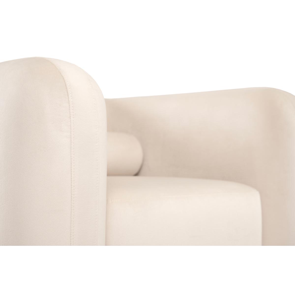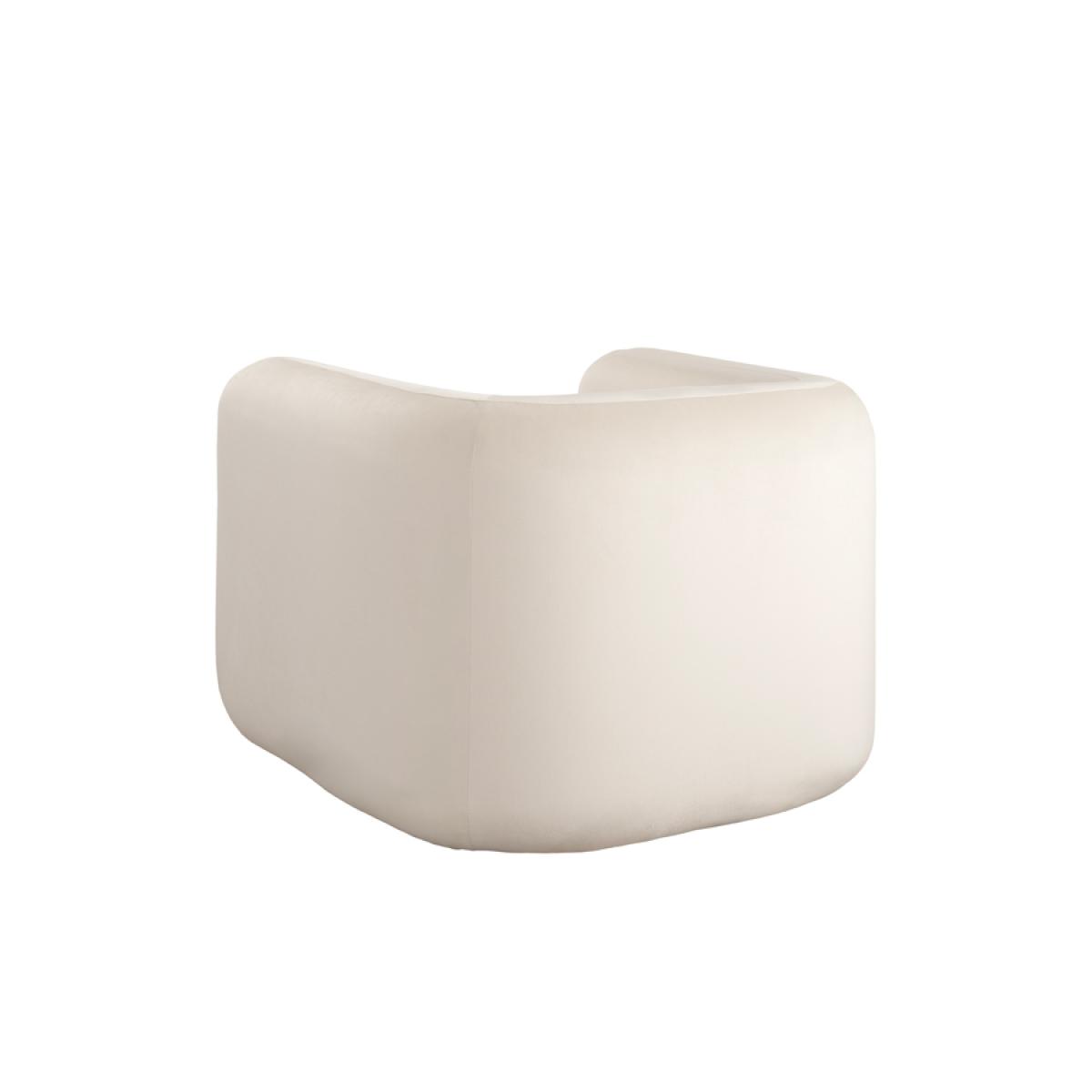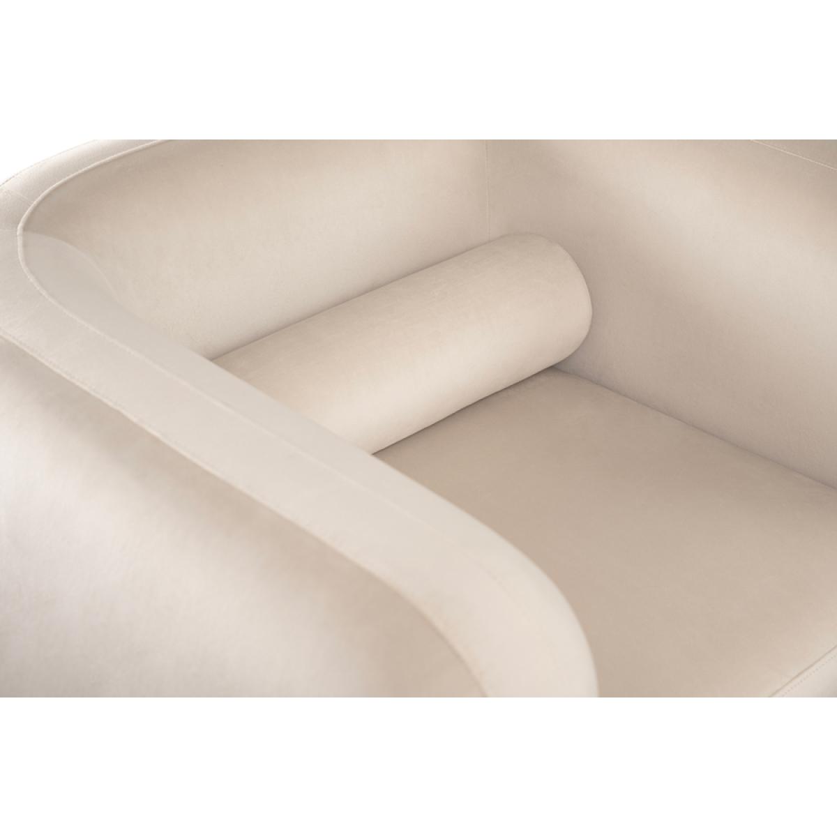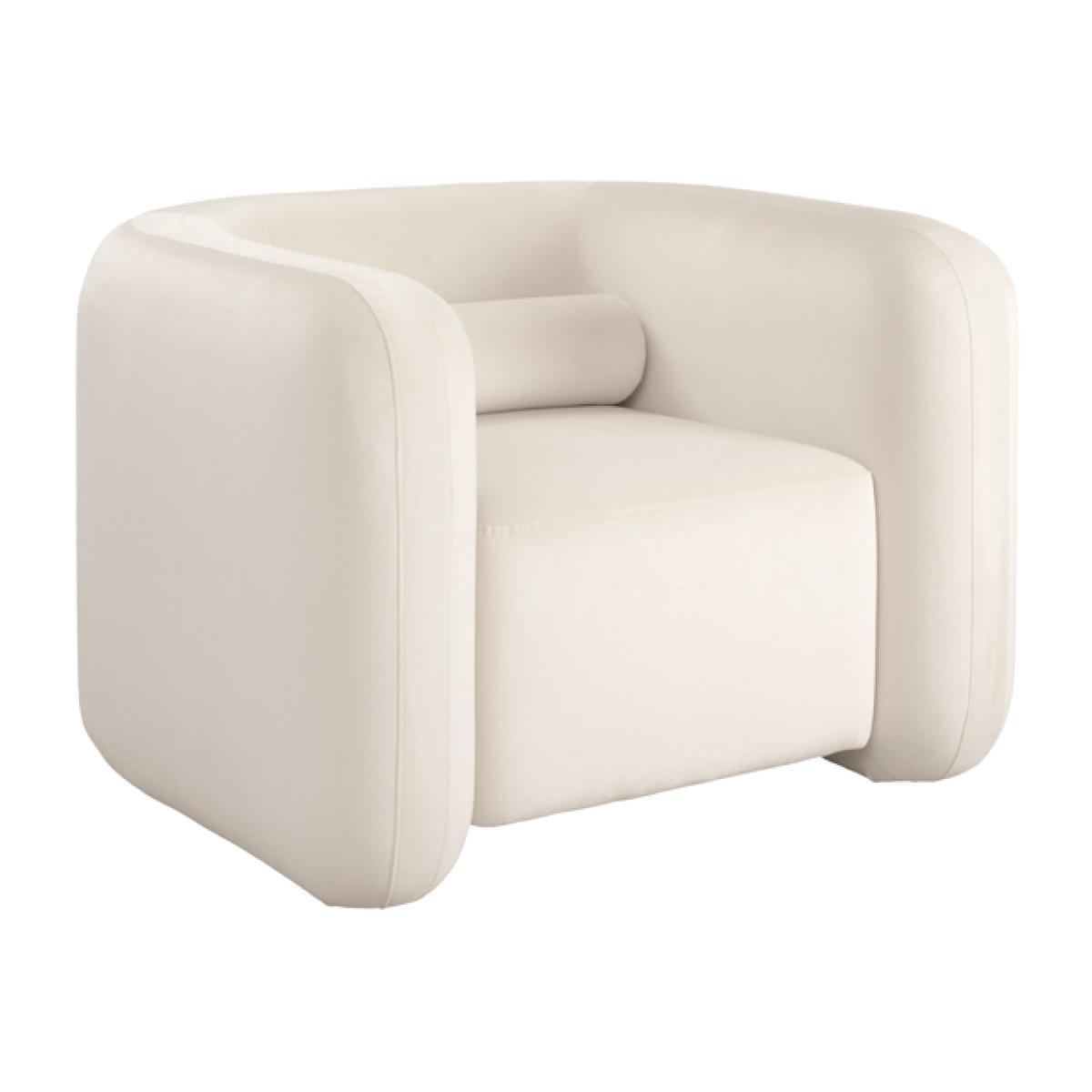 A sculptural contemporary armchair featuring flowing curvaceous lines. Comfortable sprung seat and back with generous deep foam and fibre filling. Velvet upholstery fabric. Foam and fibre-filled bolster cushion.