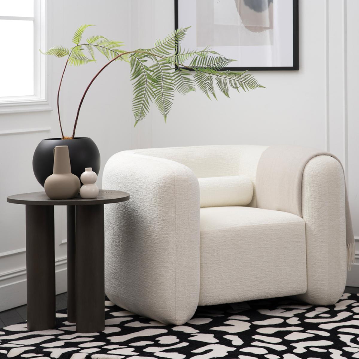 I’m a fan of this Munich chair for its clean, rounded silhouette and the tactile appeal of the ivory chenille cover. It slots effortlessly into minimalist, Scandi or modern-contemporary schemes, and also brings a soft counterpoint to darker, moodier rooms. For styling, pair it with a slim-lined side table and a floor lamp to create a cosy reading corner, then layer in a contrasting cushion or lightweight throw to introduce colour and depth. It looks equally good on a natural-fibre rug for warmth or against a charcoal accent wall to make that creamy upholstery pop.