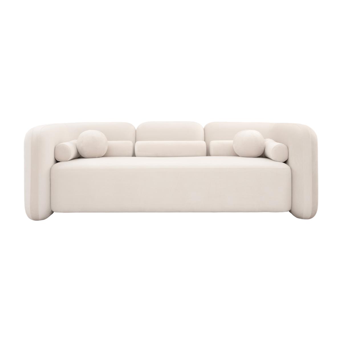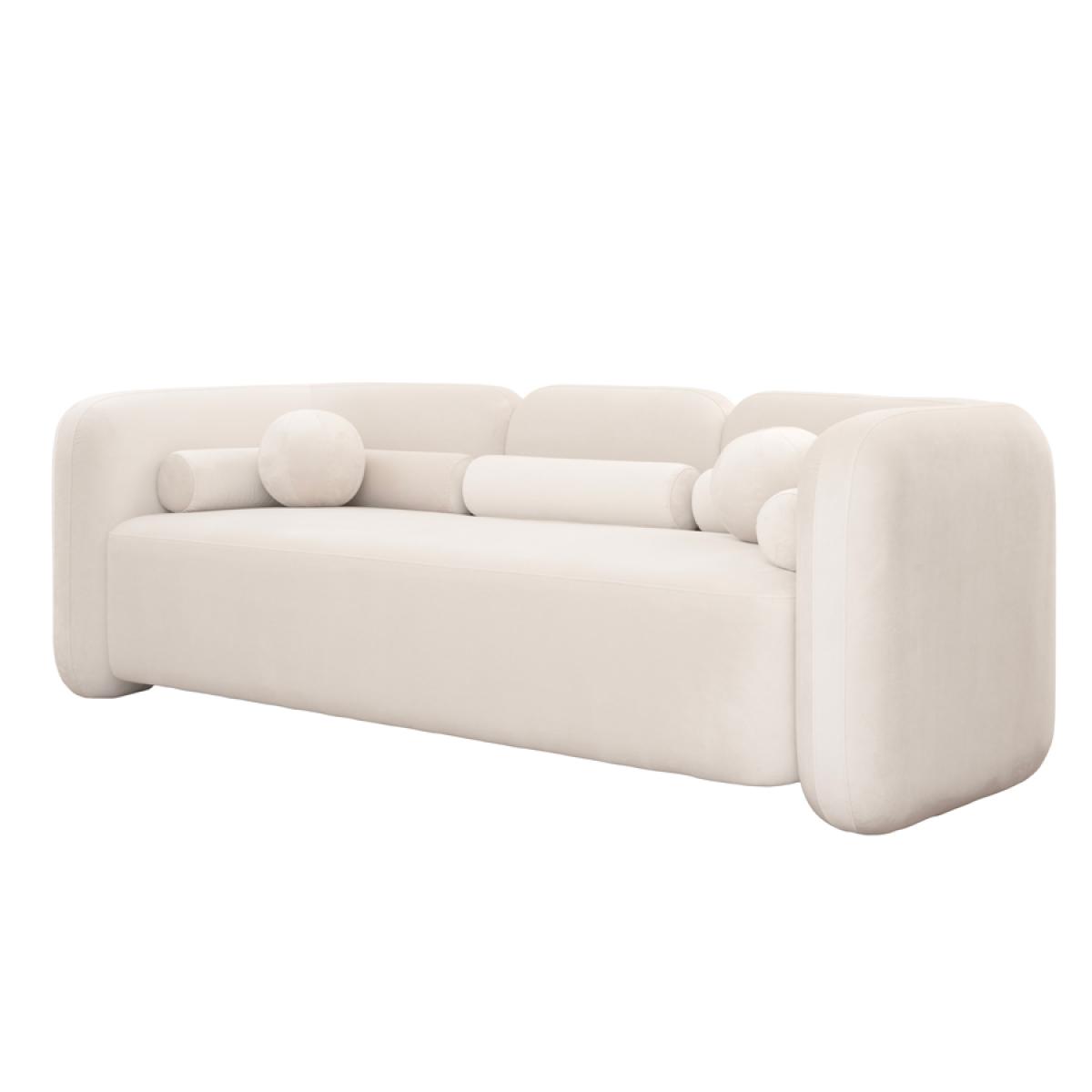 A sculptural contemporary sofa featuring flowing curvaceous lines. Comfortable sprung seat and back with generous deep foam and fibre filling. Velvet upholstery fabric. Foam and fibre-filled ball and bolster cushions. In the unlikely event that you are dissatisfied with your sofa let us know (within 7 days) and we will happily collect it and fully refund you, including the return shipping cost.