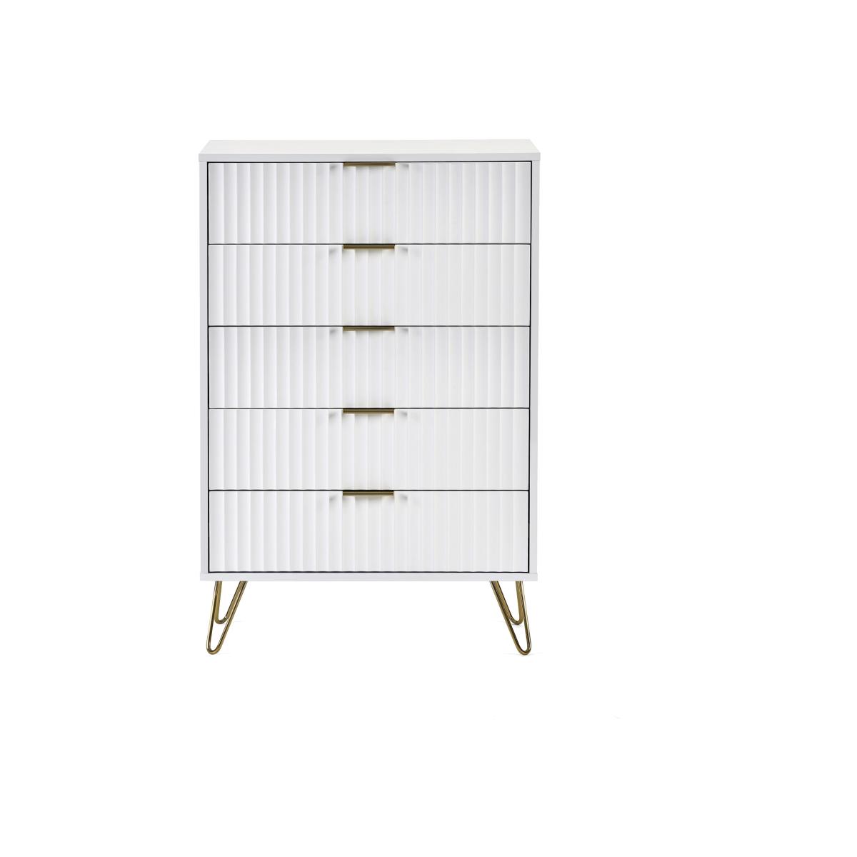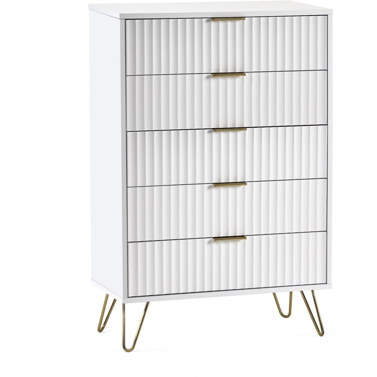 I’m a fan of this white five-drawer chest for its clean fluted fronts and slim brass legs - it brings just enough texture without dominating a room. Its neutral finish makes it a natural fit in Scandi, modern-classic or minimalist interiors, while the mid-century inspired hairpin legs add a subtle nod to retro style. Styling-wise, keep the top simple by pairing a round mirror or slim table lamp with a small cluster of books and a ceramic vase. Inside the drawers you can mix in woven organisers to keep linens or accessories neat, and the elevated base makes it easy to slip in a slim basket or two underneath for extra storage.