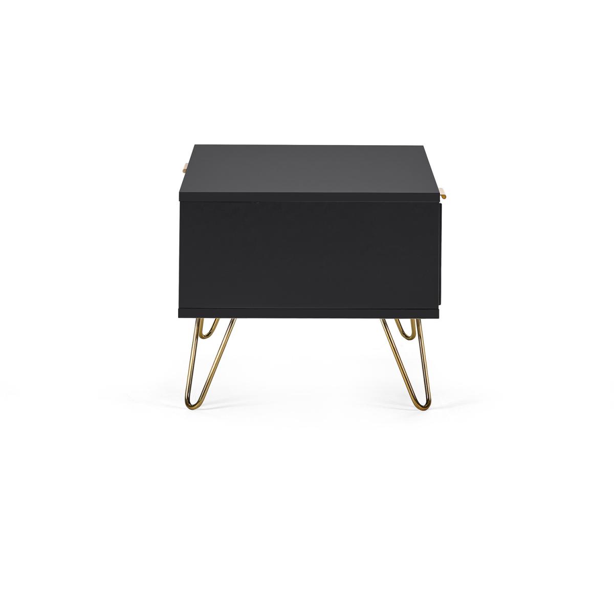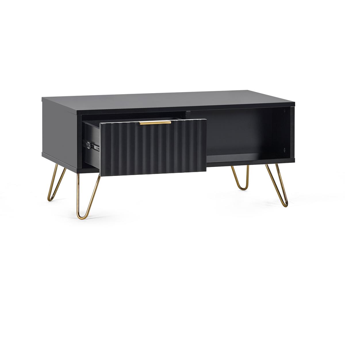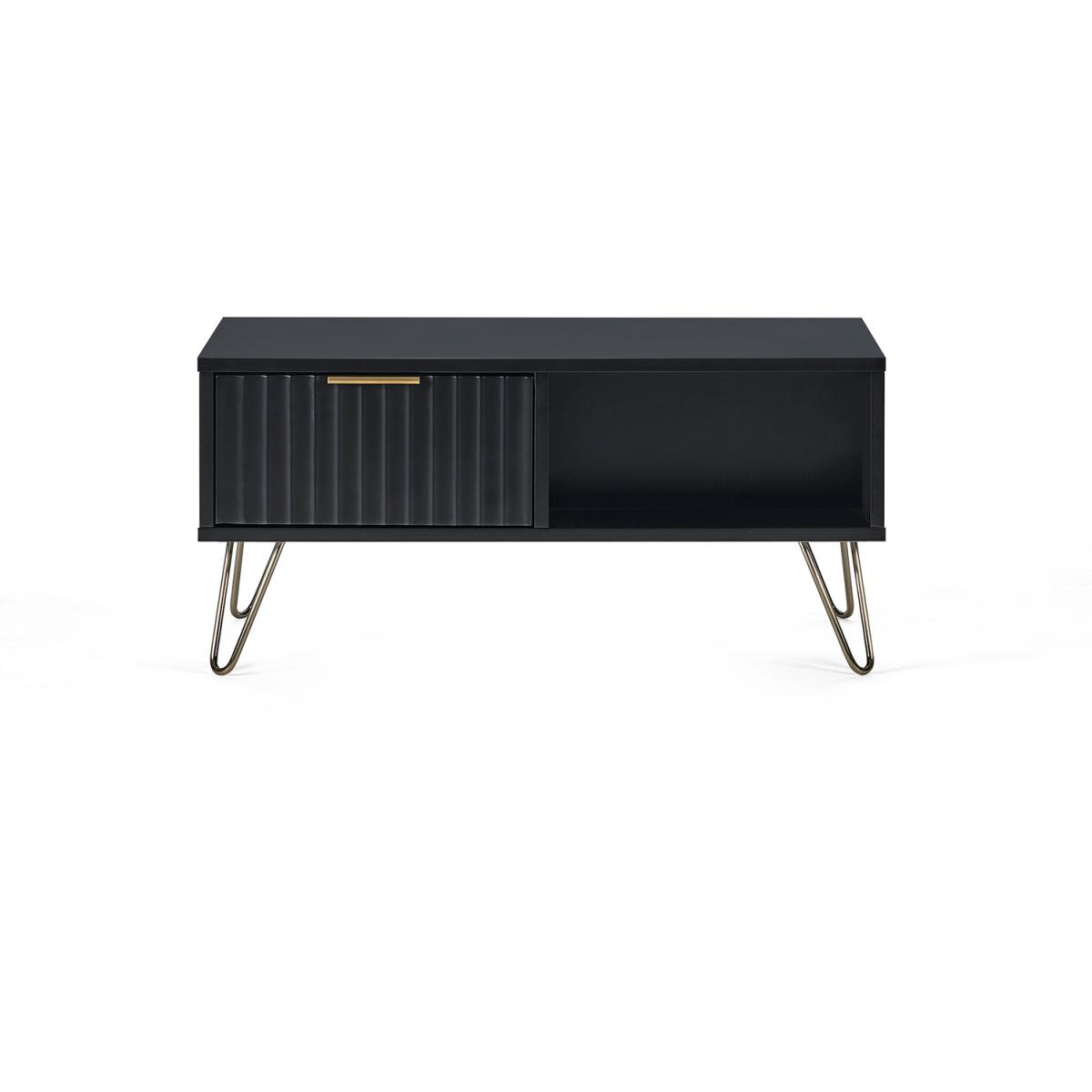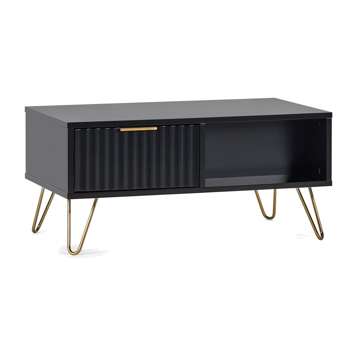 The black Murano coffee table is a versatile piece that works particularly well in modern and contemporary interiors, adding a sleek, sophisticated touch. I love its clean lines and the mix of matte finishes with the subtle gold detail, which brings a bit of understated glamour. It’s great paired with plush textiles or layered with books and decorative objects to create a lived-in yet polished look. For practical styling, consider keeping surfaces uncluttered to showcase its design, and use it in combination with other neutral or monochrome furniture for a cohesive scheme, or add some colour accents nearby for visual interest. The leg design adds a touch of retro charm, making it suitable for a variety of space styles, from minimalist to eclectic.