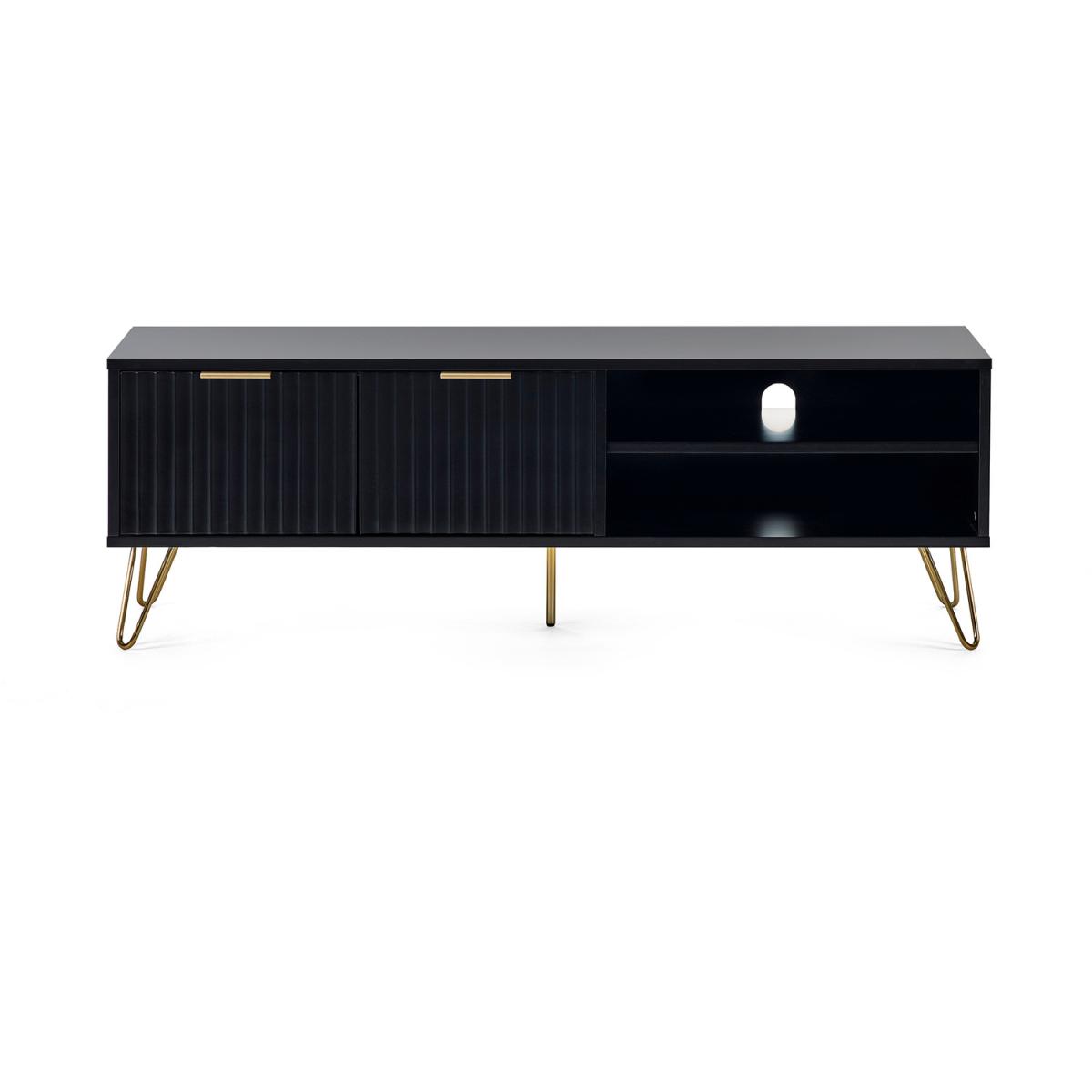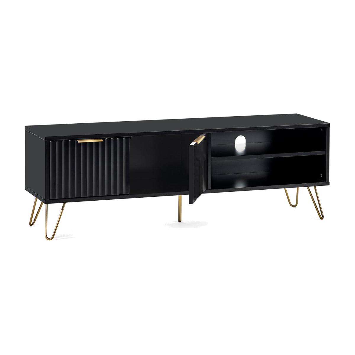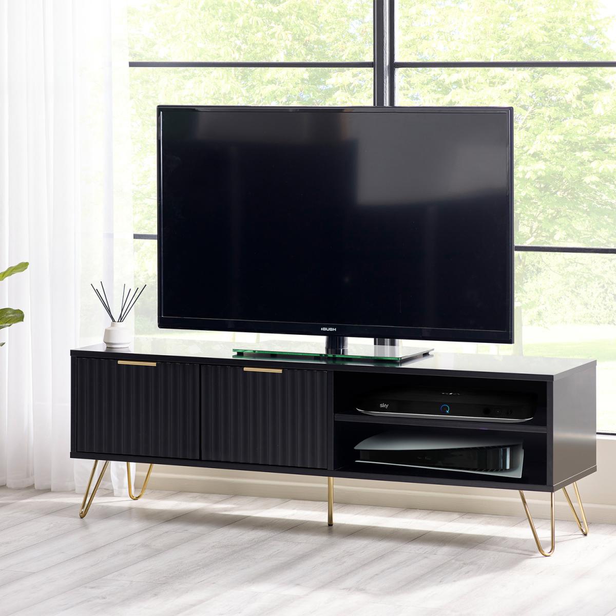 I love this black TV unit for its clean lines and brass-tone legs - it feels right at home in contemporary, Scandi-inspired or even industrial schemes. The mix of a slatted door and open shelves makes it simple to hide game consoles and cables while still showing off a favourite book or vase. For styling, keep accessories low and streamlined: a couple of potted plants, a neat stack of books and a slim lamp work well. Match a rug or scatter cushions to the leg finish, and hang art or a mirror above at eye level to complete the look.