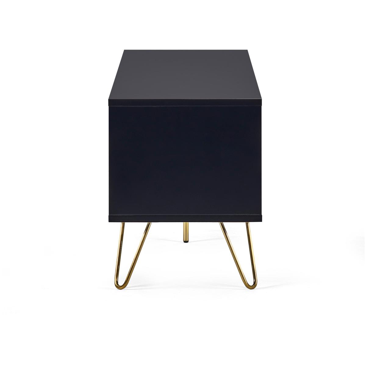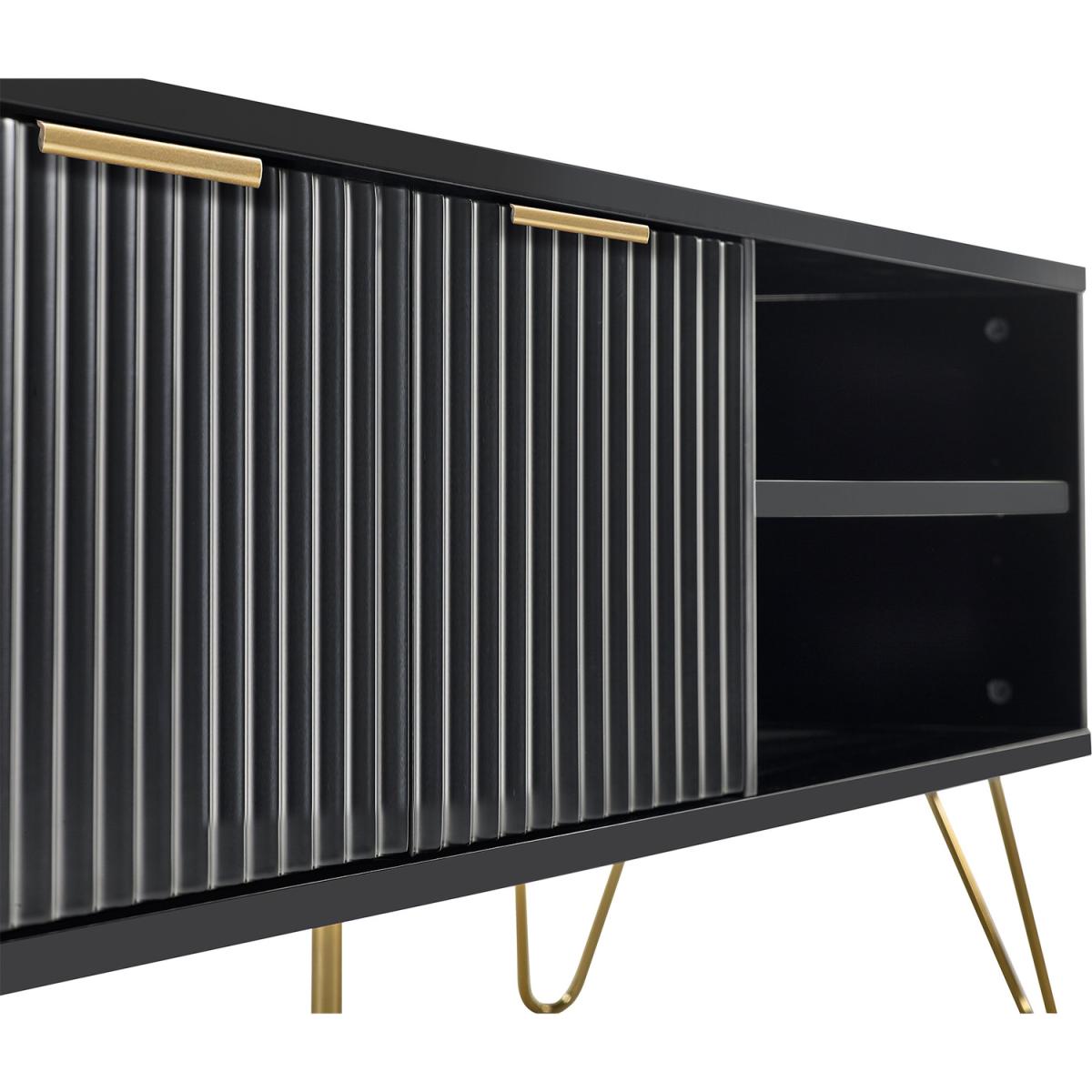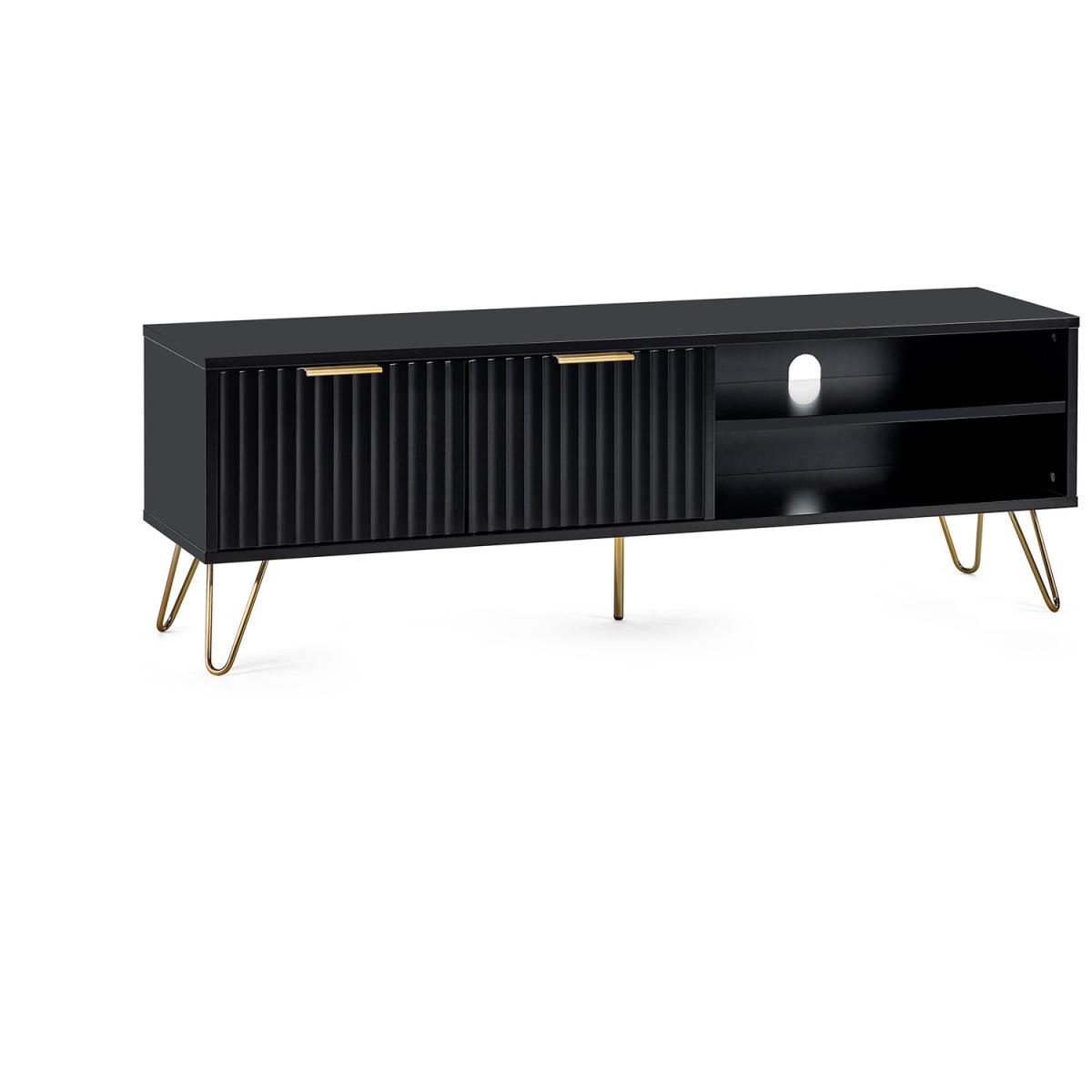 I love this black TV unit for its clean lines and brass-tone legs - it feels right at home in contemporary, Scandi-inspired or even industrial schemes. The mix of a slatted door and open shelves makes it simple to hide game consoles and cables while still showing off a favourite book or vase. For styling, keep accessories low and streamlined: a couple of potted plants, a neat stack of books and a slim lamp work well. Match a rug or scatter cushions to the leg finish, and hang art or a mirror above at eye level to complete the look.