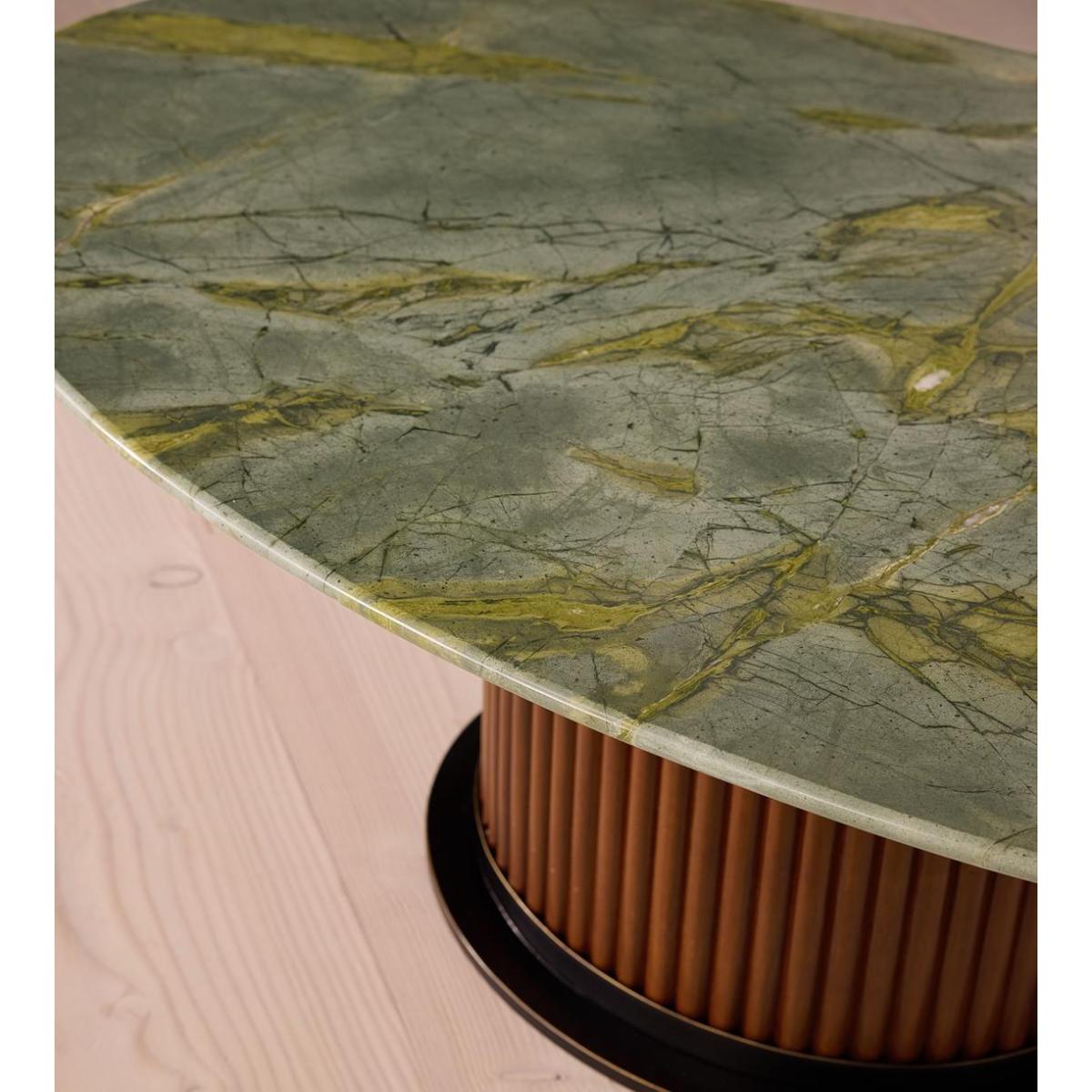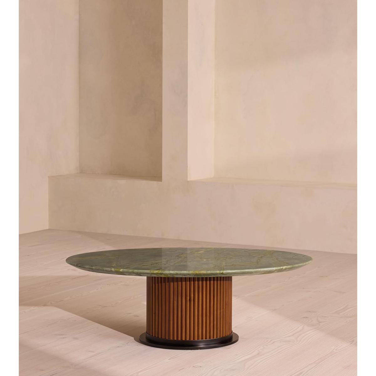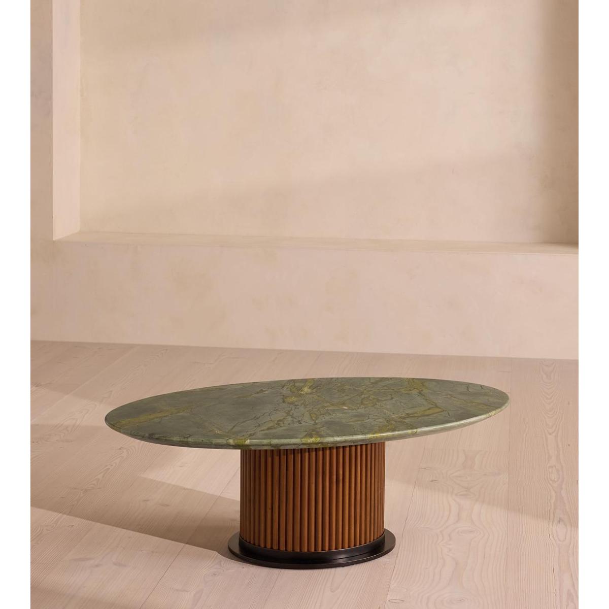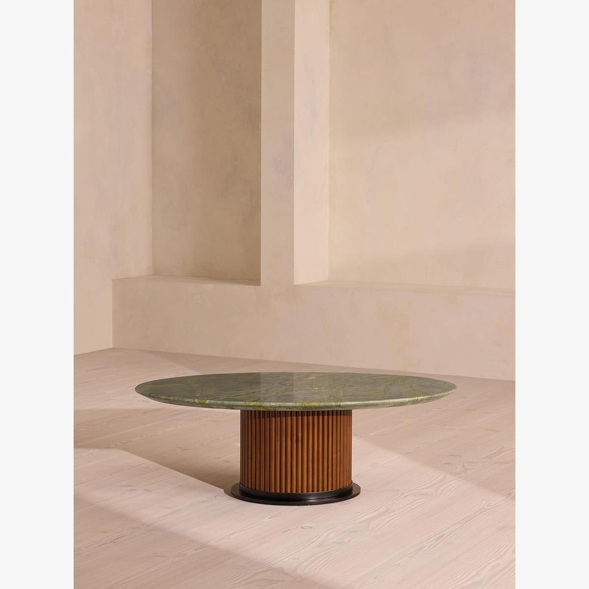Characterised by tonal veining and natural fissures, Brazilian green marble creates a striking oval top. The Murcell coffee table brings the design of our best-selling dining table into your living space. Inspired by the tones seen in Soho House Rome, its elongated oval top is carved from Brazilian green marble and secured on a walnut-clad steel pedestal base.