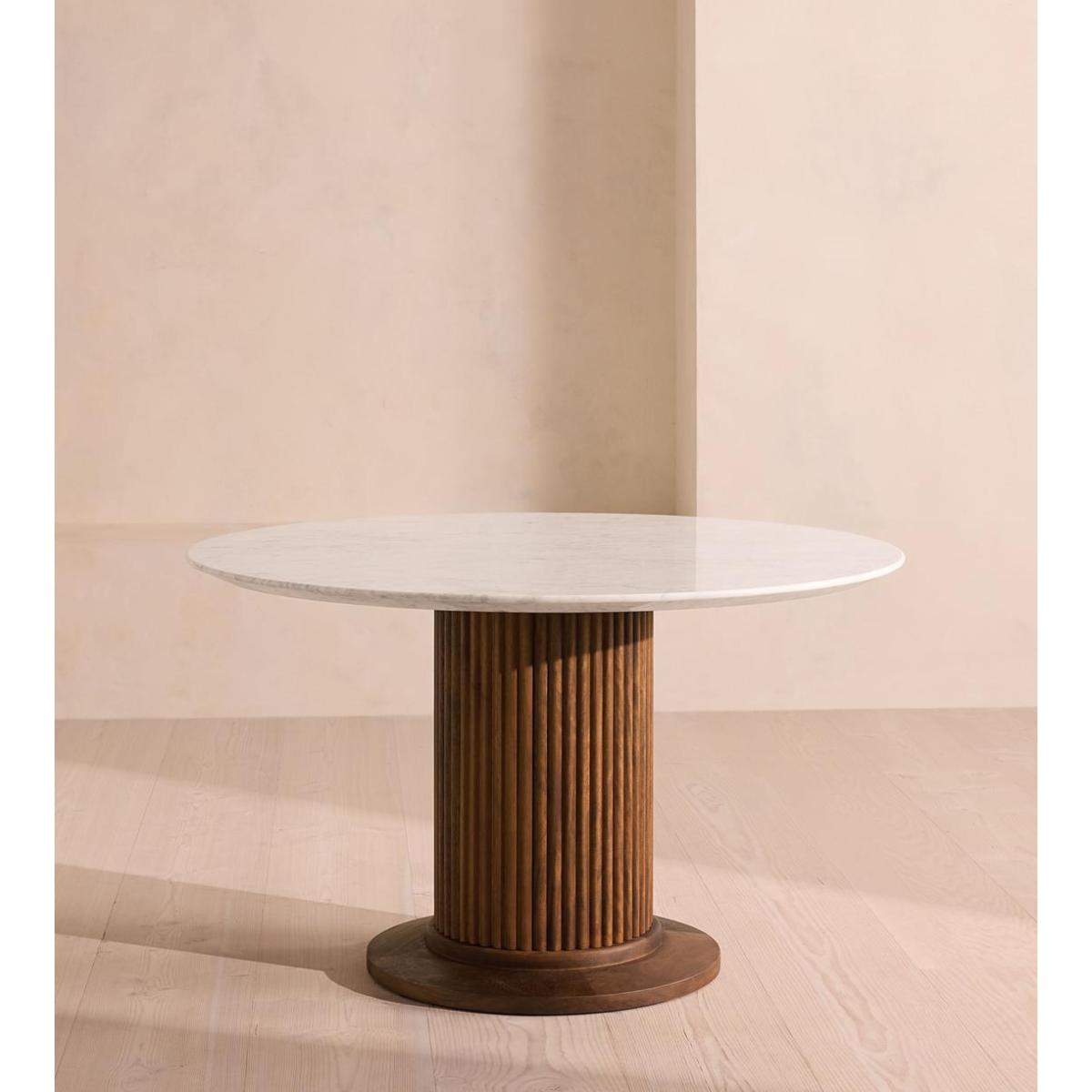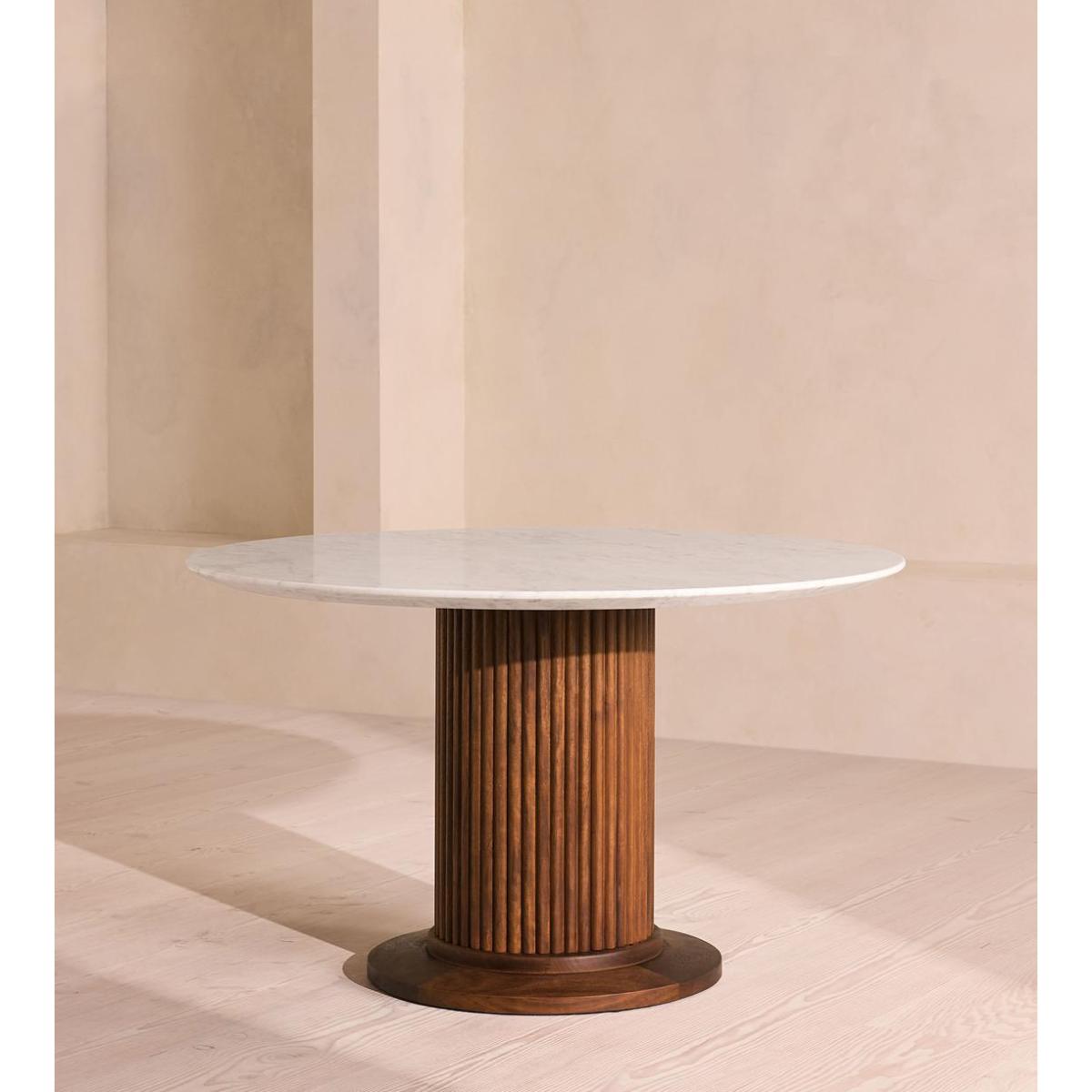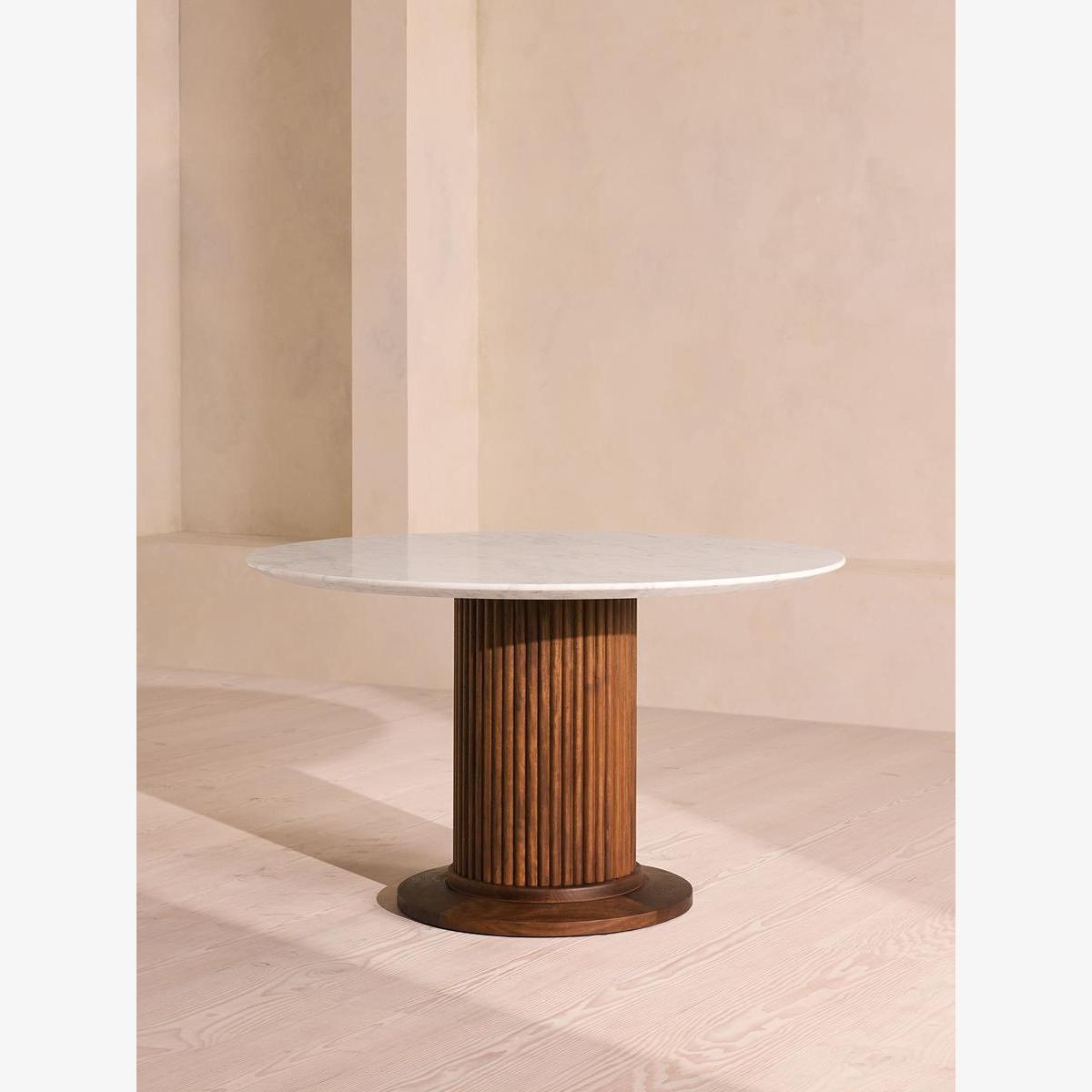 This four to 4-5 seater table has been reimagined for outdoor dining, mixing an iroko wood base with a Carrara marble top. An extension of the Murcell dining room range, this table is designed for use outdoors. Referencing the marble pieces seen in Soho House Rome, a large round top that's designed to seat up to six people is carved from a polished, creamy Carrara stone, while the pedestal base is now crafted from a durable iroko wood with reeded detailing.
