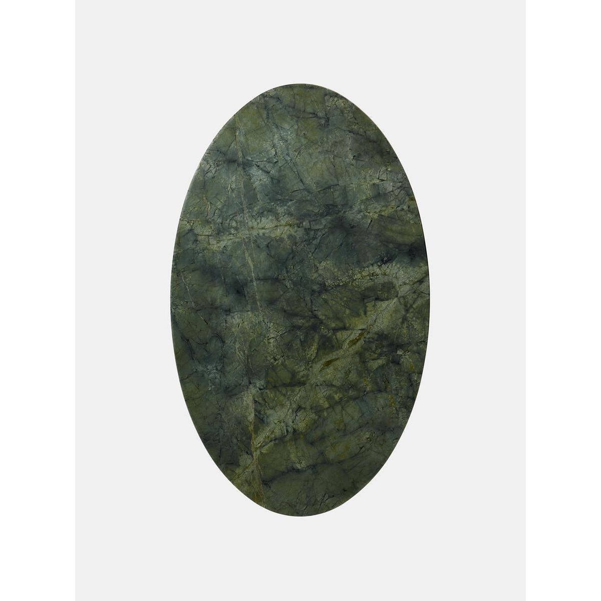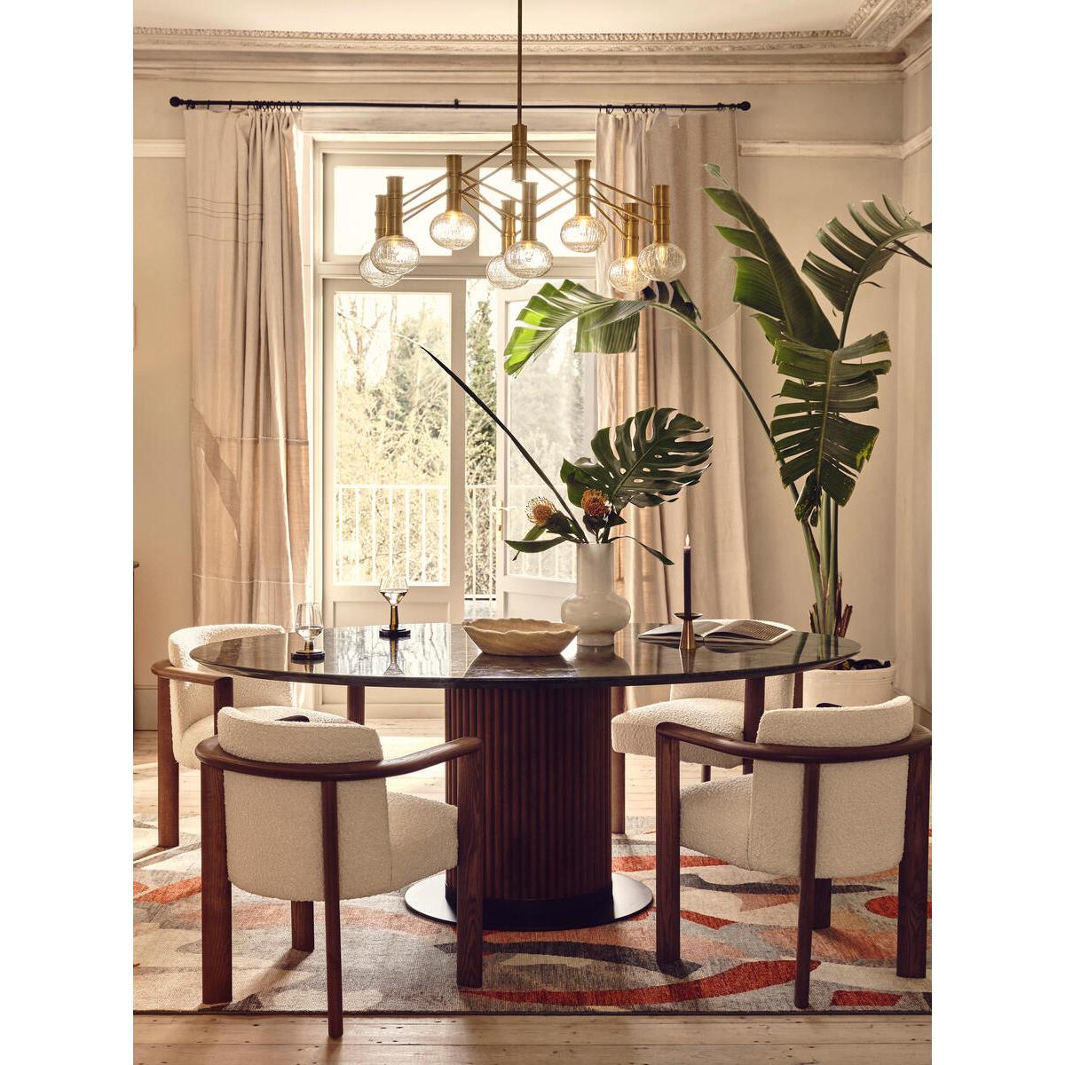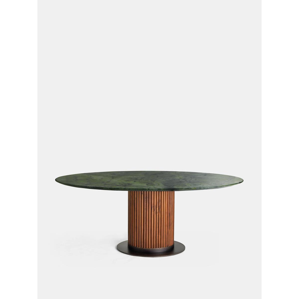 Referencing the marble pieces seen throughout Soho House Rome, this sleek dining table is constructed from polished green marble sourced from Brazil with intricate grey veining and crystallised accents. Offset with a solid-oak-clad pillar base, the table counterbalances clean lines with warm tones. Make it the focal point of your dining room. Solid walnut and marble oval dining table Green marble top sourced from Brazil Intricate veining and crystallised accents Wooden cylinder base Variations in the marble make each piece unique Seats six to eight people Marble sourced from Italy Inspired by Soho House Rome