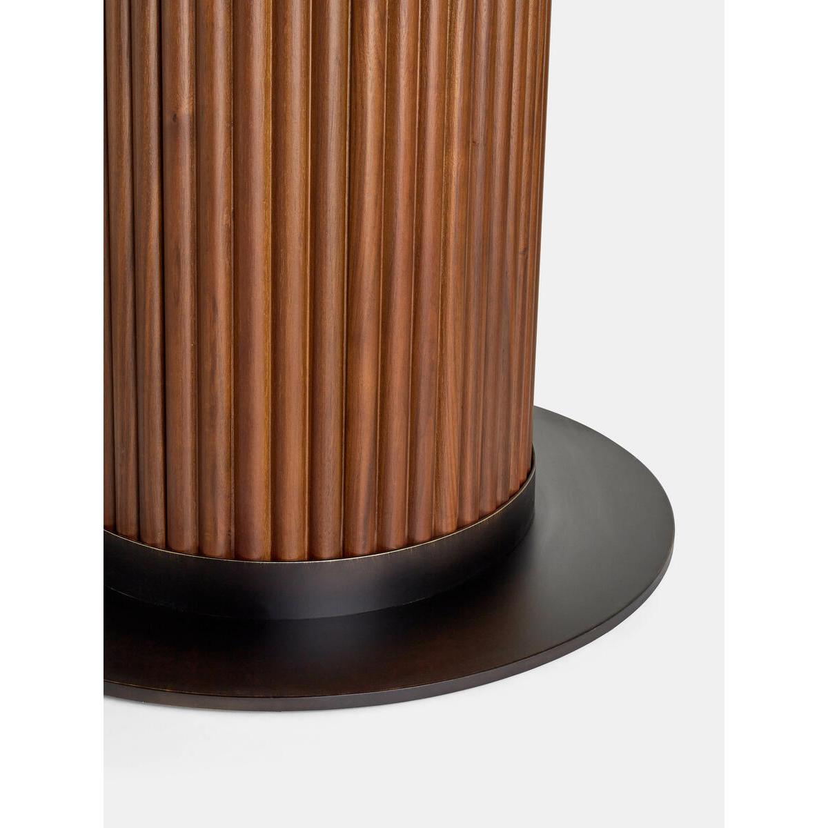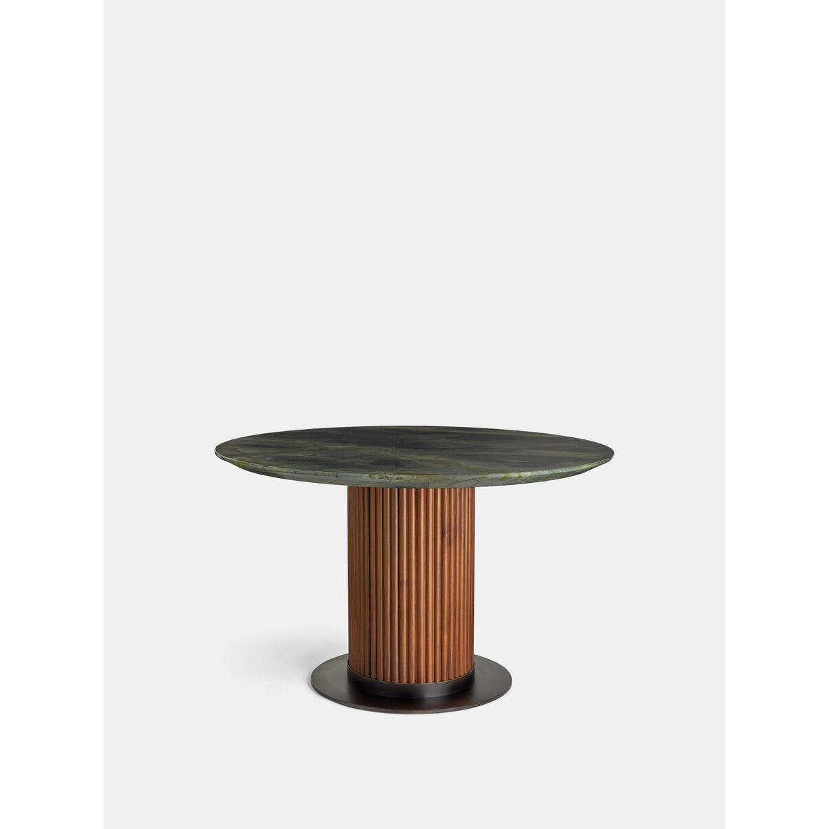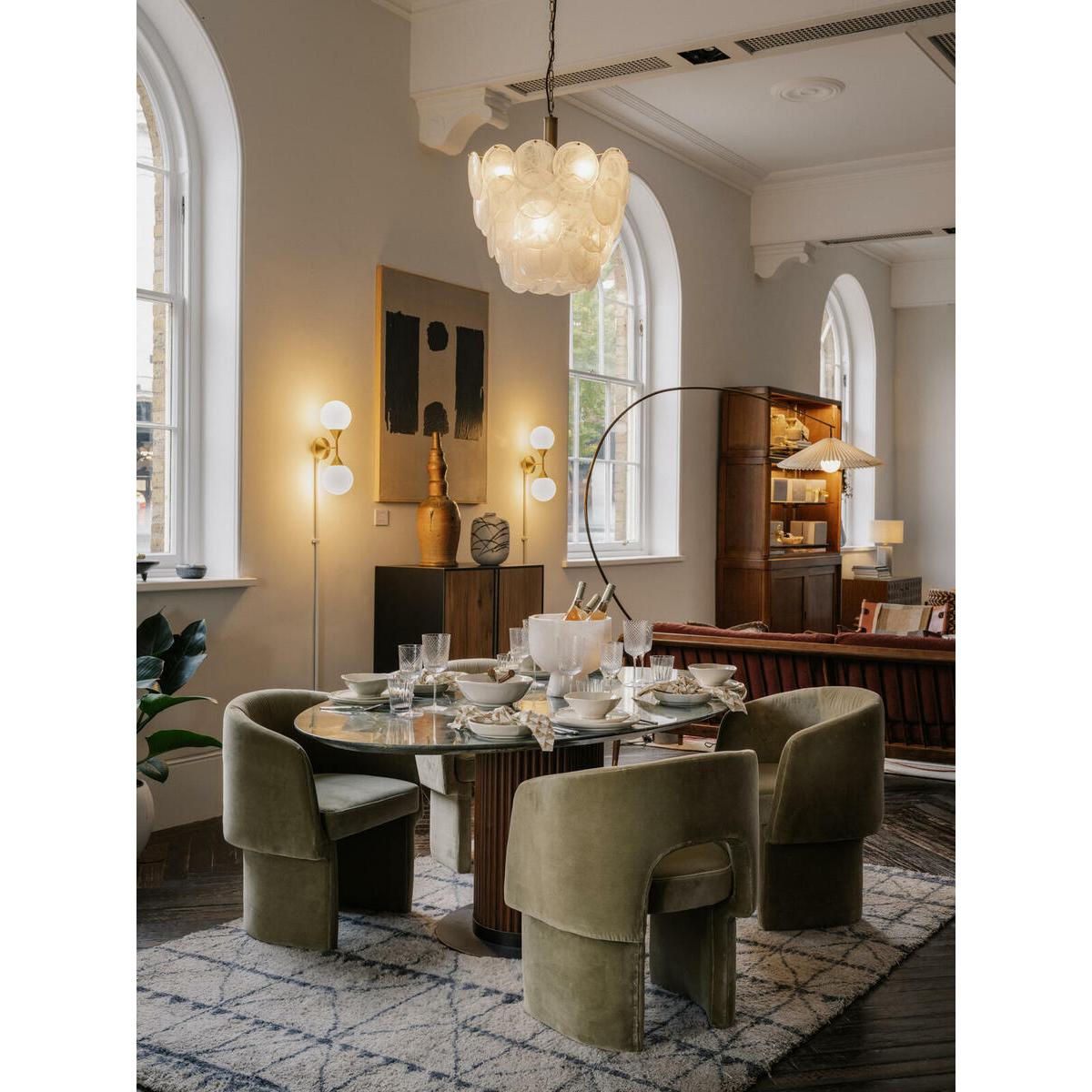 Referencing the marble pieces seen throughout Soho House Rome, this sleek dining table is constructed from polished green marble sourced from Brazil with intricate grey veining and crystallised accents. Offset with a solid-oak-clad pillar base, the table counterbalances clean lines with warm tones. Make it the focal point of your dining room. Solid walnut and marble oval dining table Green marble top sourced from Brazil Intricate veining and crystallised accents Wooden cylinder base Variations in the marble make each piece unique Seats six to eight people Marble sourced from Italy Inspired by Soho House Rome