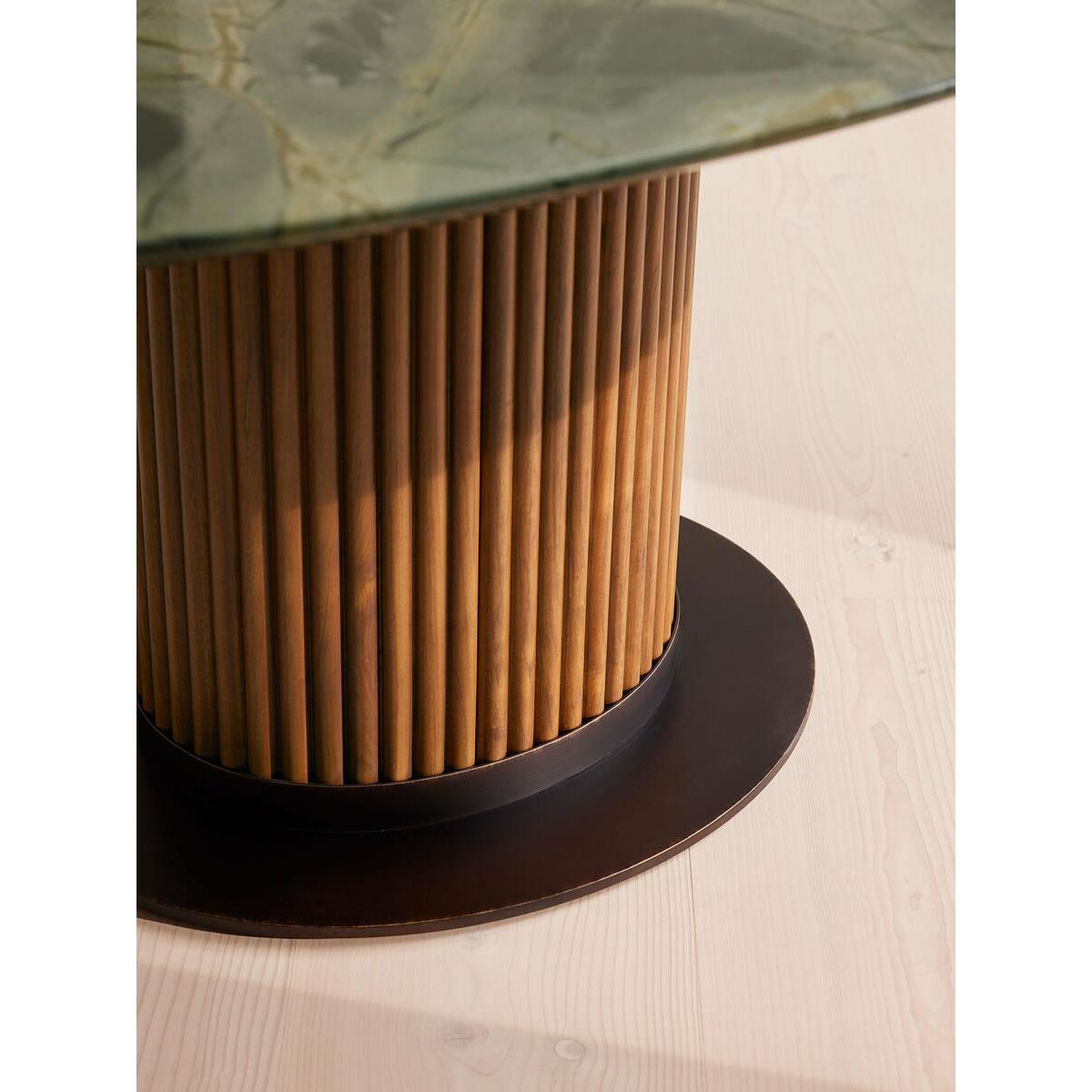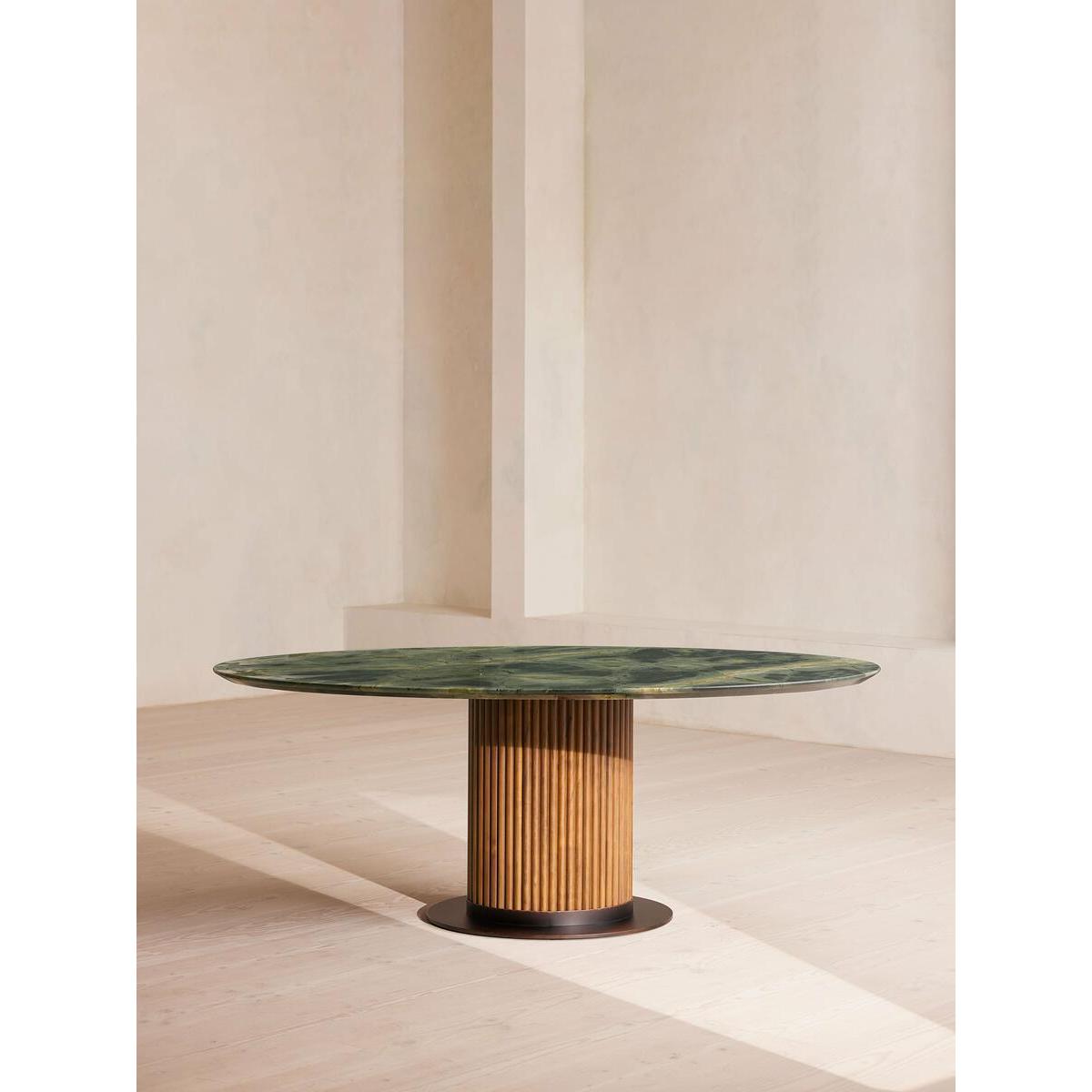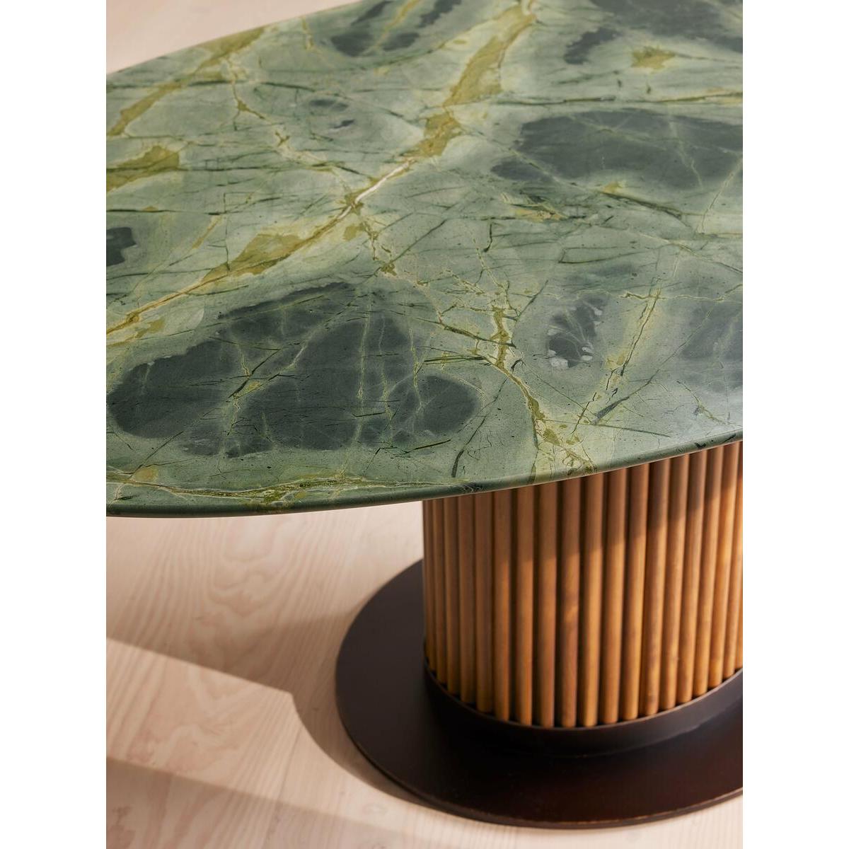 Referencing the marble pieces seen throughout Soho House Rome, this sleek dining table is constructed from a prominent green marble sourced from Brazil. Each piece of marble is unique to the next, with this design bearing a deep green colouring complemented with strong green veining and crystallised accents. Offset with a solid-oak-clad pillar base, the table counterbalances clean lines with warm tones. Make it the focal point of your dining room. Solid walnut and marble oval dining table Dark green marble top sourced from Brazil Strong green veining and crystallised accents Wooden cylinder base Variations in the marble make each piece unique Seats six to eight people Marble sourced from Italy Inspired by Soho House Rome