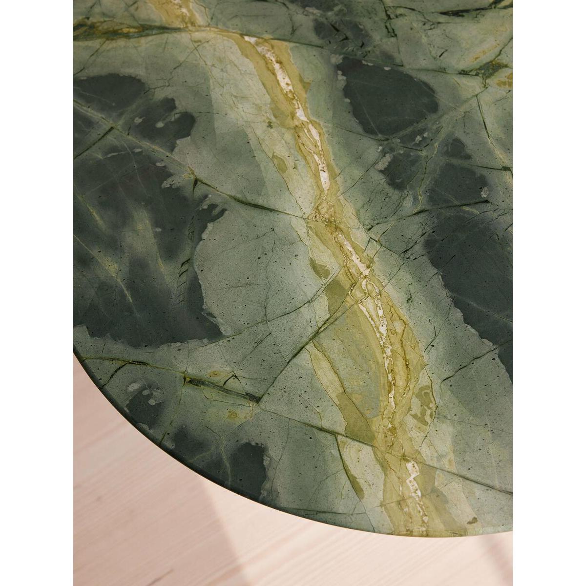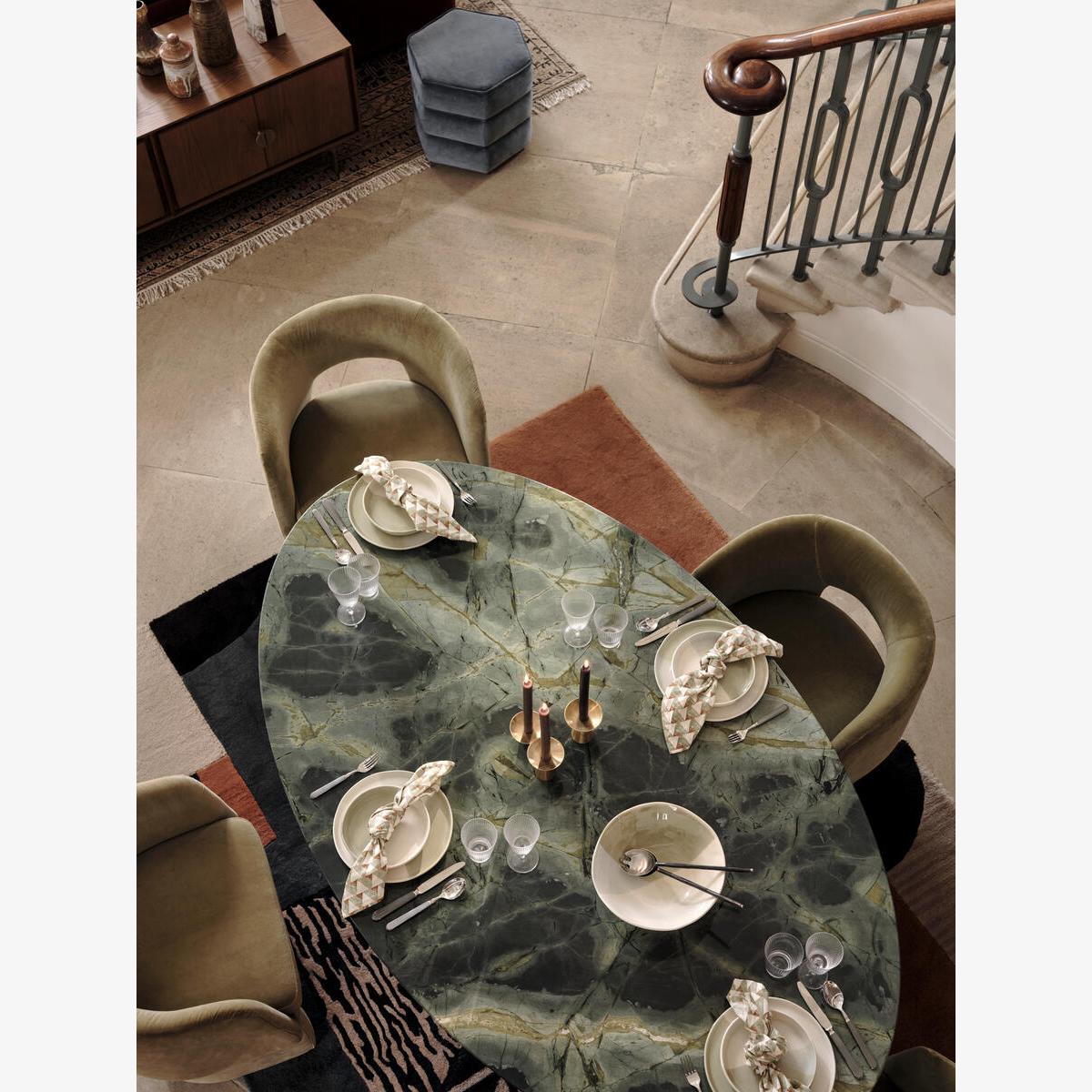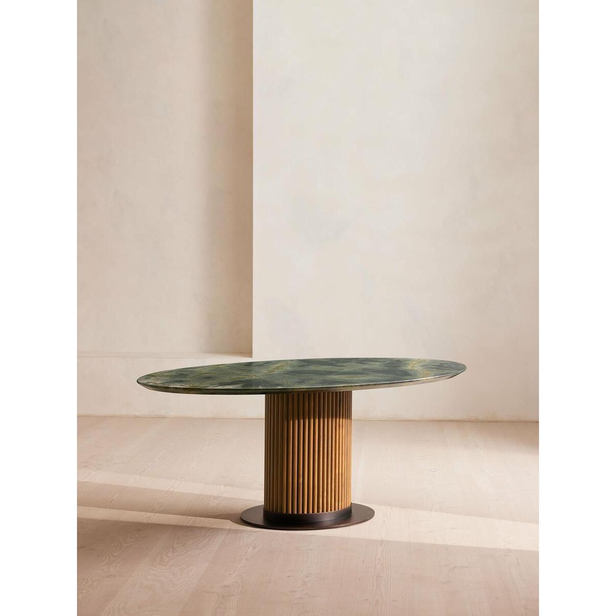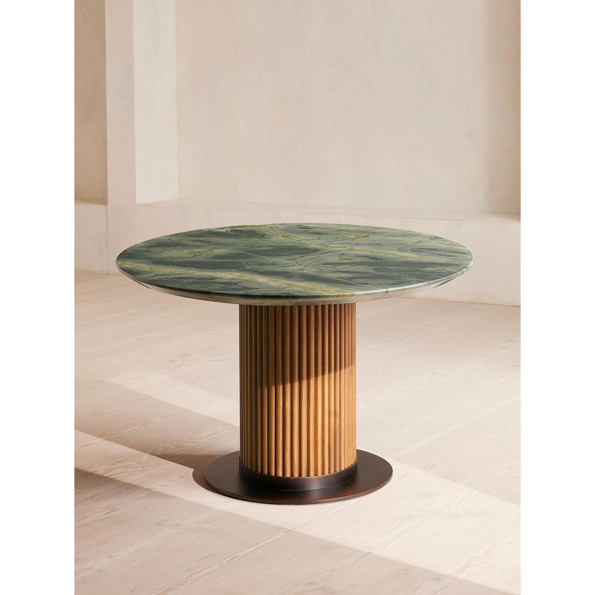 Referencing the marble pieces seen throughout Soho House Rome, this sleek dining table is constructed from a prominent green marble sourced from Brazil. Each piece of marble is unique to the next, with this design bearing a deep green colouring complemented with strong green veining and crystallised accents. Offset with a solid-oak-clad pillar base, the table counterbalances clean lines with warm tones. Make it the focal point of your dining room. Solid walnut and marble oval dining table Dark green marble top sourced from Brazil Strong green veining and crystallised accents Wooden cylinder base Variations in the marble make each piece unique Seats six to eight people Marble sourced from Italy Inspired by Soho House Rome