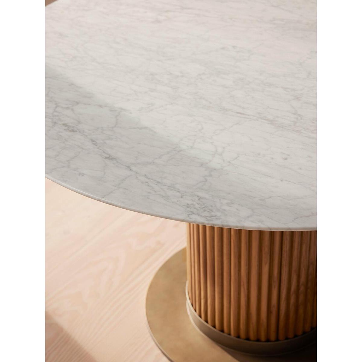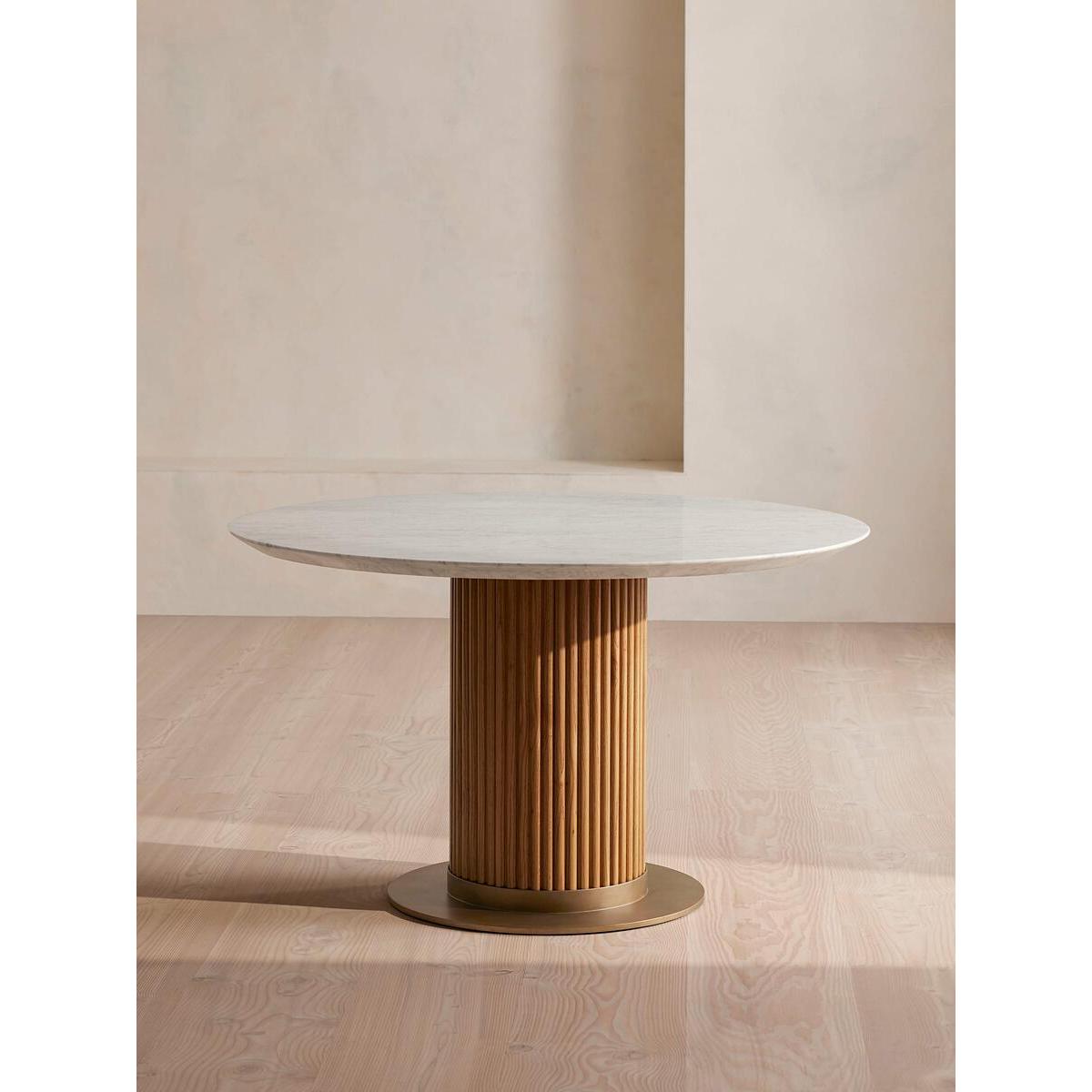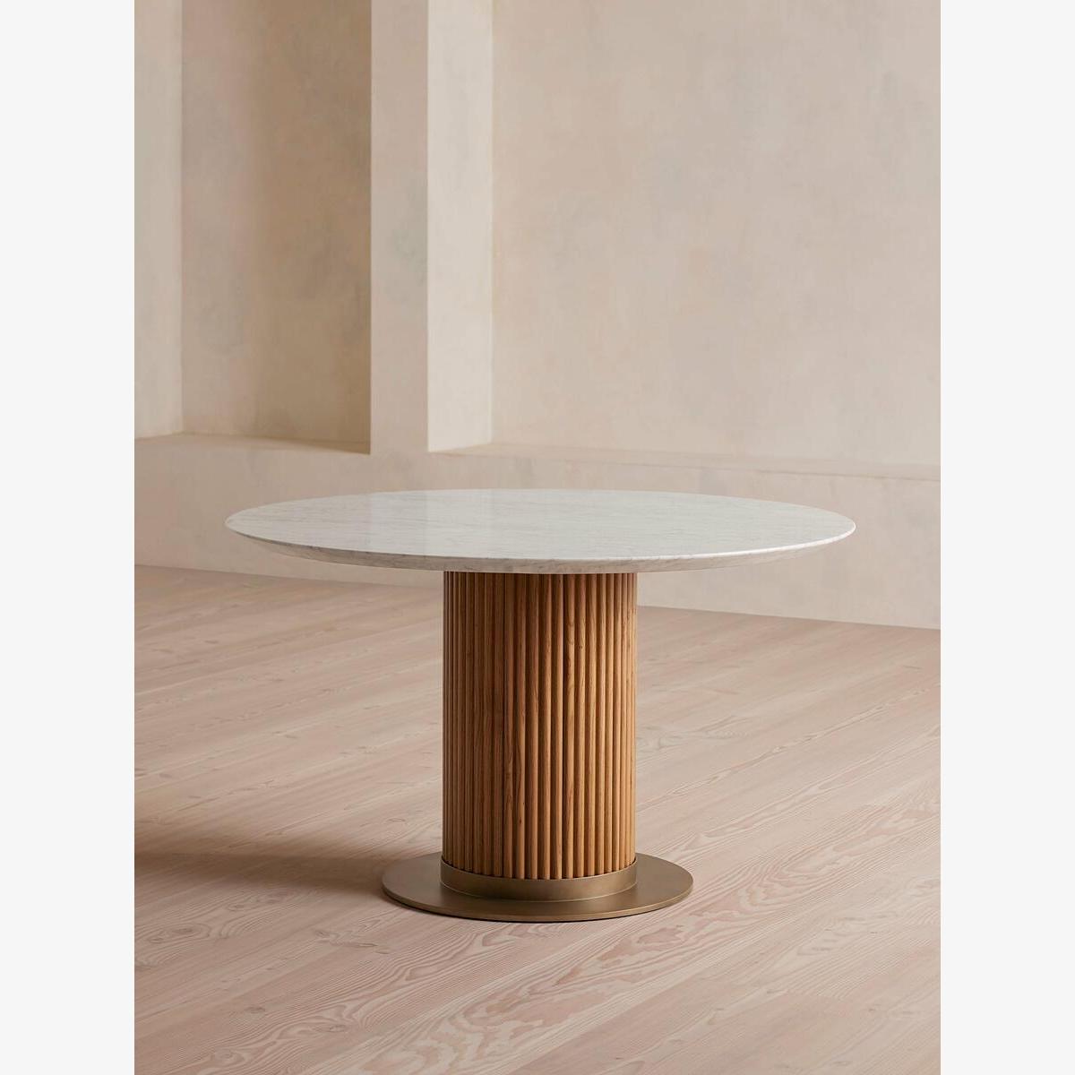 I’m a fan of how the crisp Carrara top sits lightly on that fluted timber column - it feels both refined and inviting. Its neutral palette and clean silhouette work particularly well in contemporary, Scandi-inspired or pared-back modern schemes, bringing a touch of luxury without overpowering the room. For styling, mix in mid-century or woven-seat dining chairs to introduce texture, then ground the table with a low-pile, natural-fibre rug. Keep your centrepiece simple - perhaps a single sculptural vase or shallow ceramic bowl - and add slim linen placemats or a muted runner so the marble surface remains the real star.