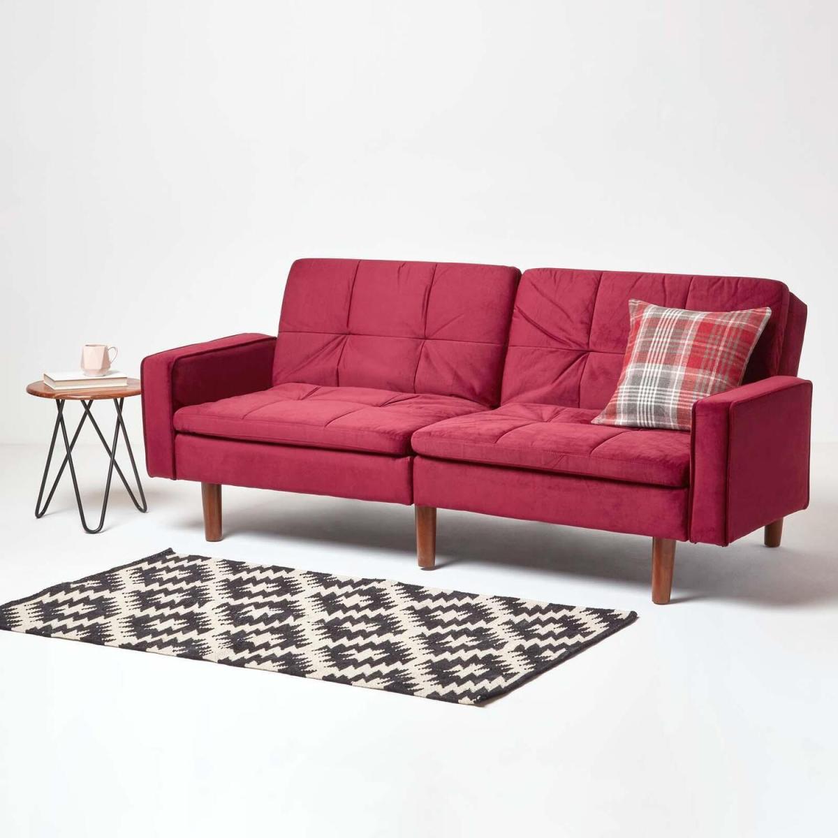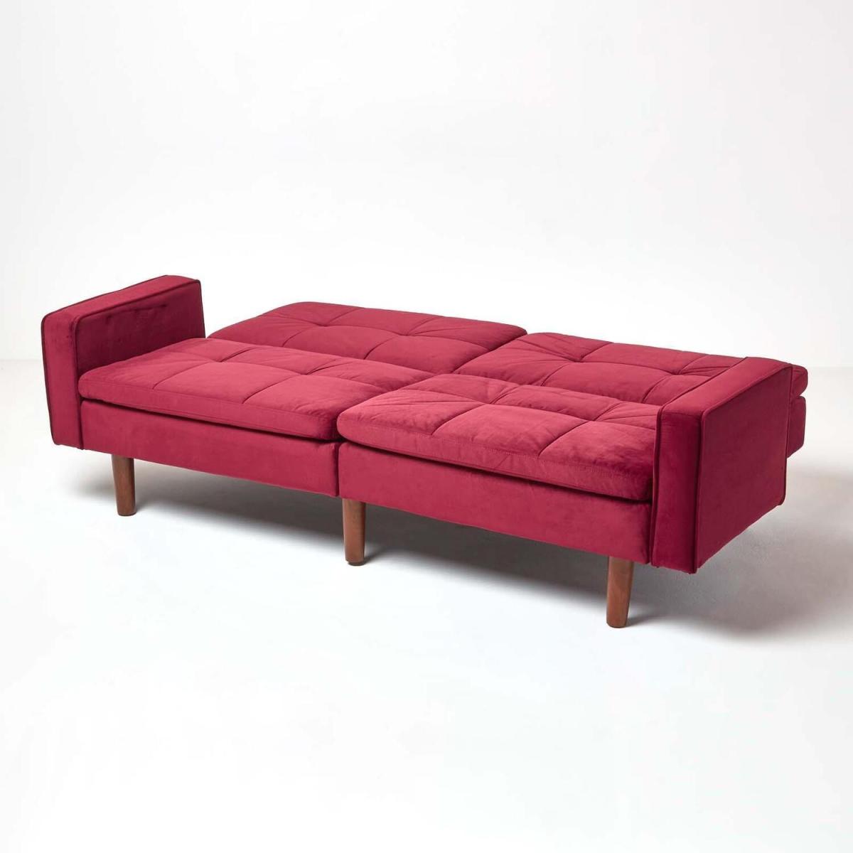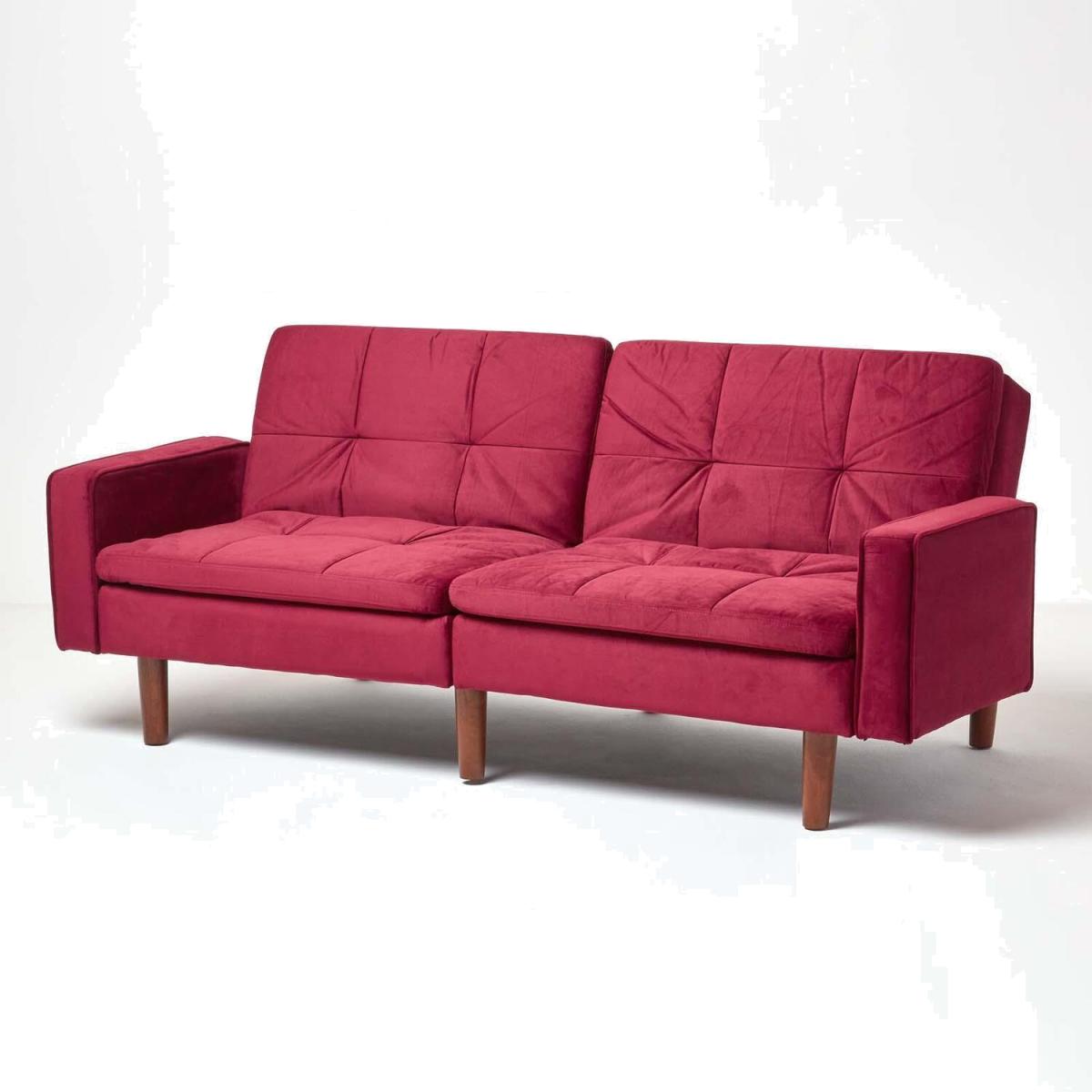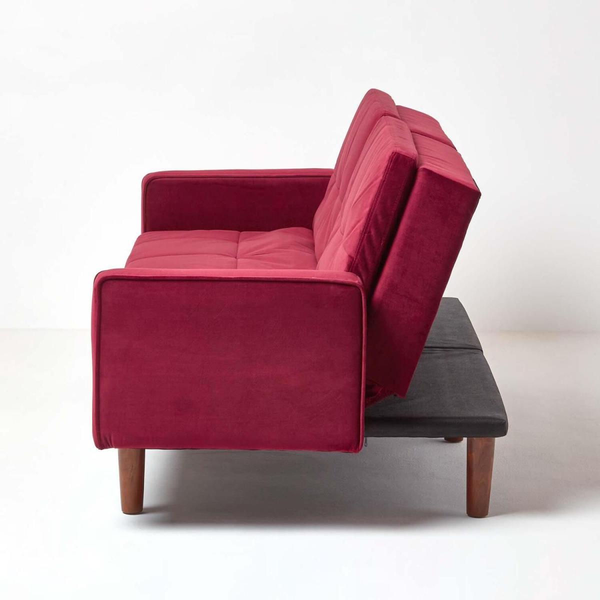 A luxurious 3-seater sofa bed which can be transformed with the easy click-clack mechanism into a single bed for one. Upholstered with a super-soft sleek dusky pink velvet, this velvet sofa bed is handstitched in a quilted design for added texture and cushioning. Featuring two handy armrests when in use as a sofa, this pink sofa bed is perfect for using in your living room, bedroom or even office. If you dont have the pleasure of a spare room you might find having guests over to stop the night is difficult. However, with our collection of sofa beds youre able to turn your sofa into a single bed for one, conveniently transforming your living spaces into a handy spare room. In a subtle dusky pink, this sofa is a perfect shade for spring or summer to brighten up your interiors and make them feel fresh. Generously cushioned for additional support the Murphy sofa bed features springs to provide lasting comfort for both sitting and sleeping. Supported by five solid wooden legs the Murphy sofa bed is 197 cm wide and 90 cm deep extending to 107 cm deep when used as a bed. Also available in dark red, dark grey and navy blue.