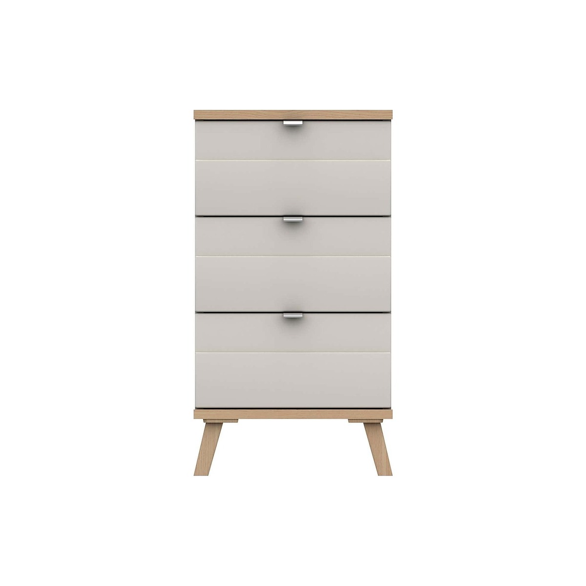 With its modern, clean-cut design, the Murray 3 Drawer Bedside Table is perfect for adding a contemporary touch to any bedroom and is supplied fully assembled for added convenience. This bedside unit is finished in a stylish off-white colourway with natural oak-effect tops and feet and a trendy inset design to give a framed look. Boasting plenty of storage space, this piece features three large drawers complete with metal effect J-pull handles, heavy duty drawer bases, easy-glide runners and a stylish linen-look inside.