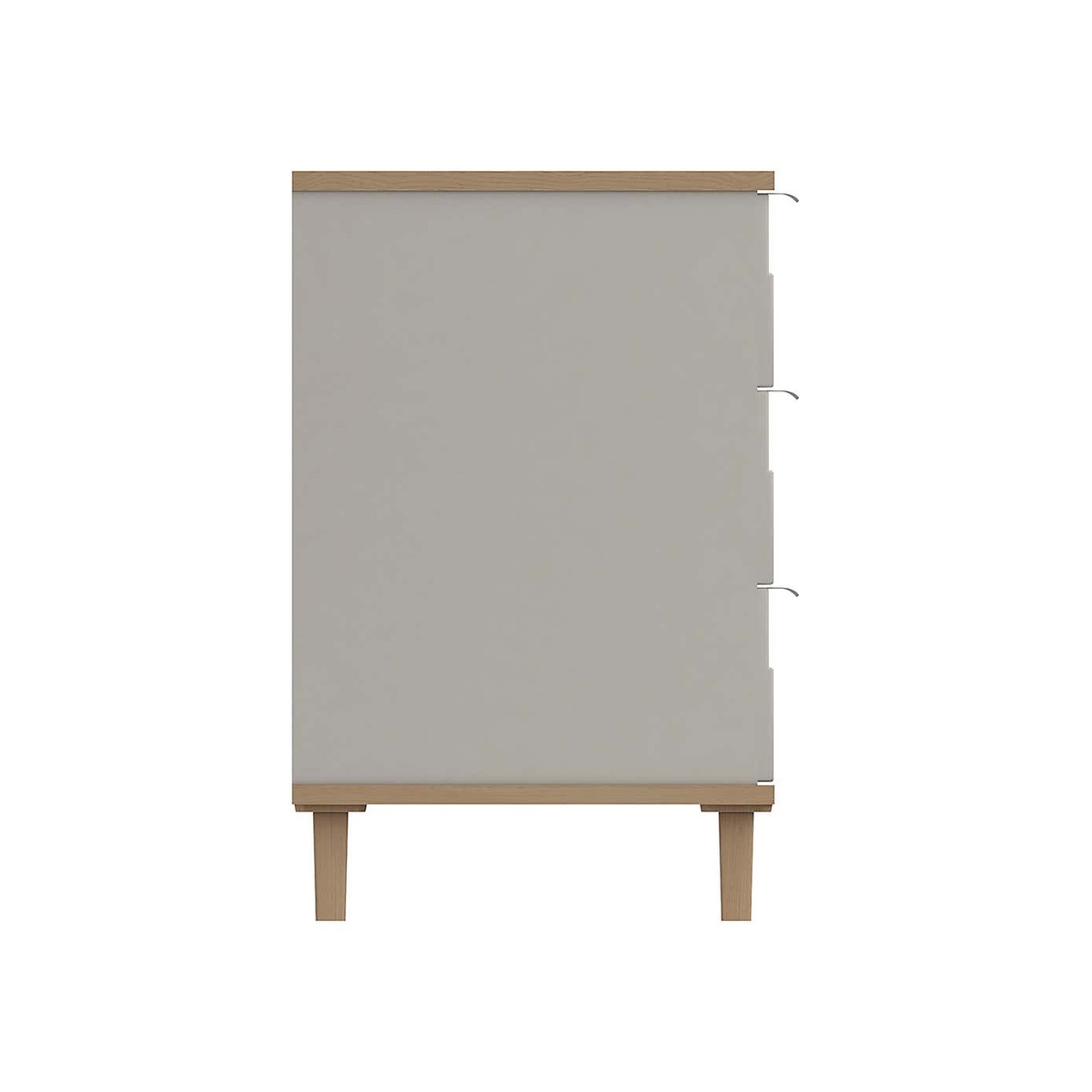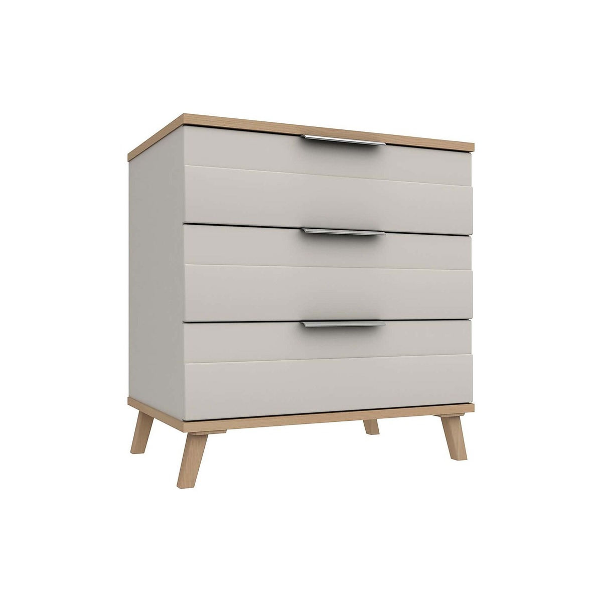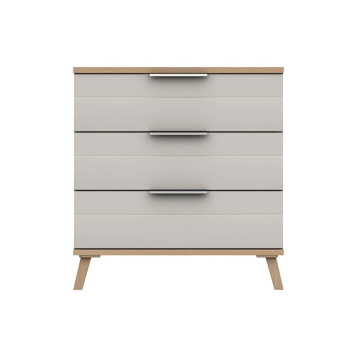 With its modern, clean-cut design, the Murray 3 Drawer Chest is perfect for adding a contemporary touch to any bedroom and is supplied fully assembled for added convenience. This chest of drawers is finished in a stylish off-white colourway with natural oak-effect tops and feet and a trendy inset design to give a framed look. Boasting plenty of storage space, this piece features three large drawers complete with metal effect J-pull handles, heavy duty drawer bases, easy-glide runners and a stylish linen-look inside.