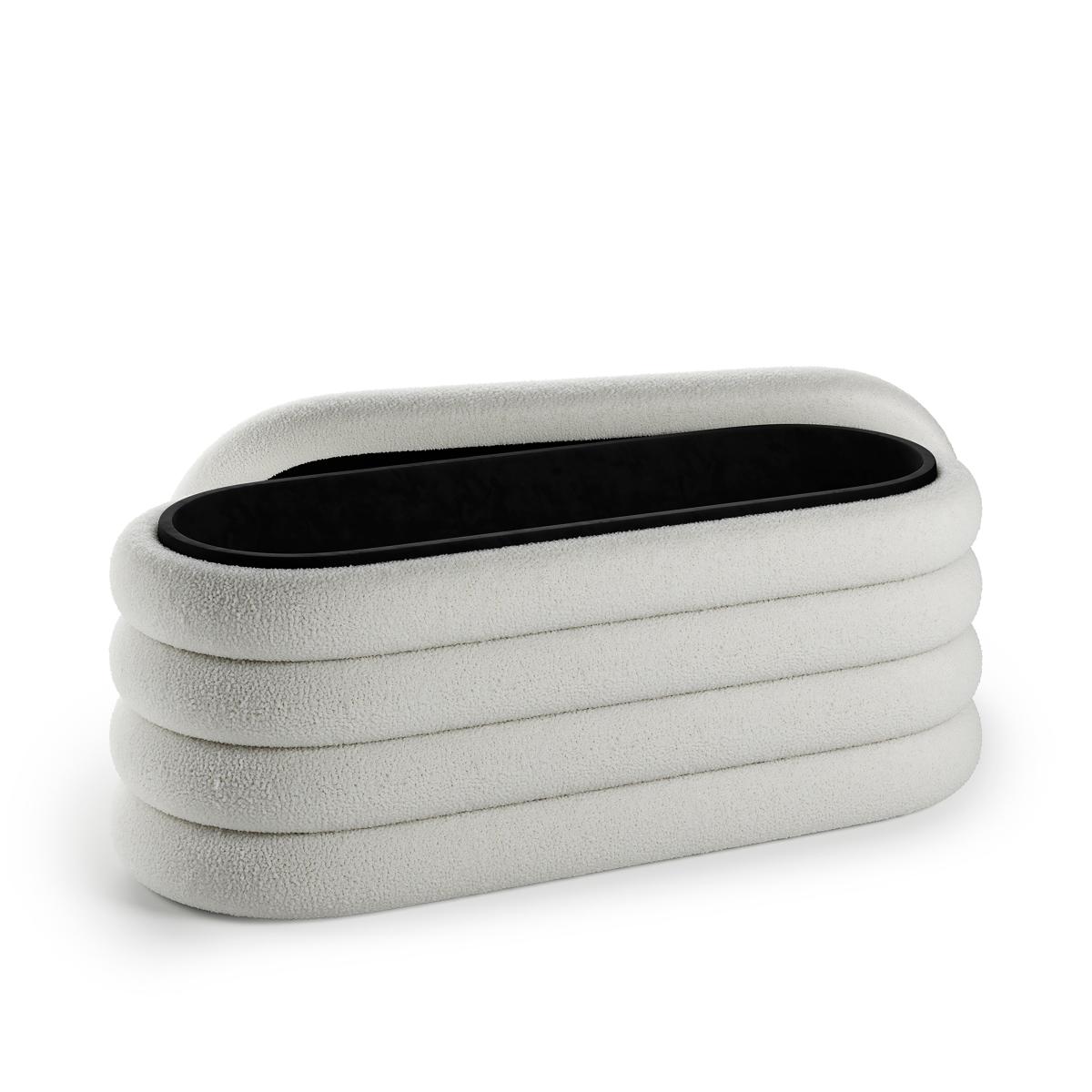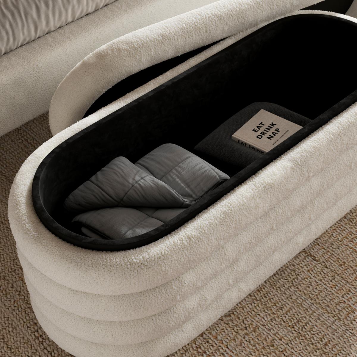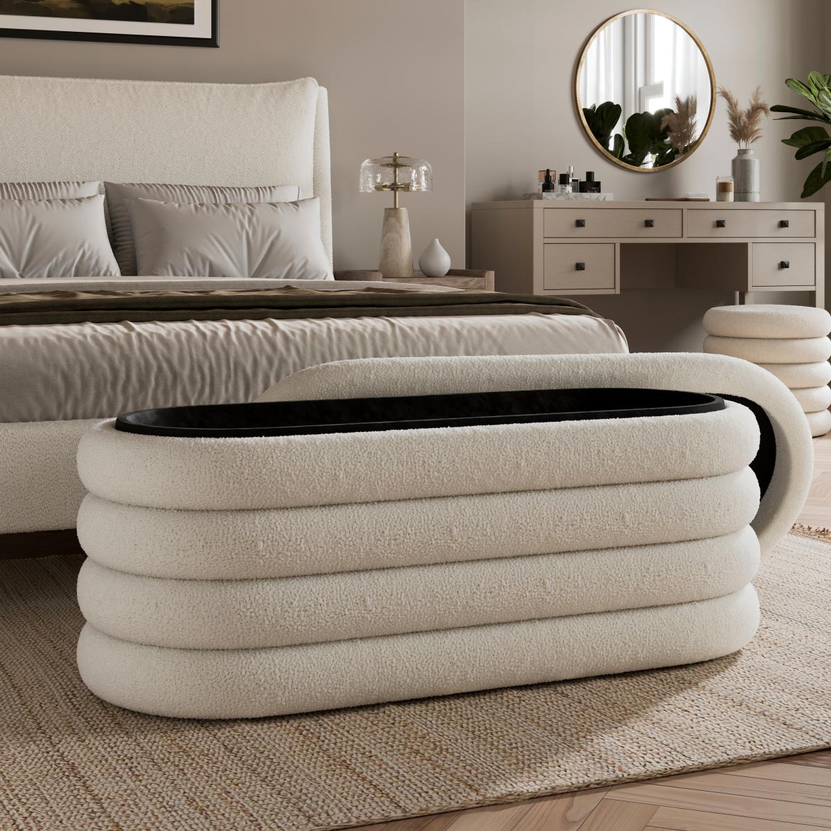 * Large Storage* Plush Sherpa* Modern Design This storage ottoman combines comfort with functionality, offering a plush seating surface and ample storage space in one stylish package. Upholstered in soft sherpa fabric in a soothing ivory hue, it adds warmth and texture to any room. The generous storage compartment provides the perfect solution for tidying away blankets, pillows, or other household items, helping you maintain a clutter-free environment.