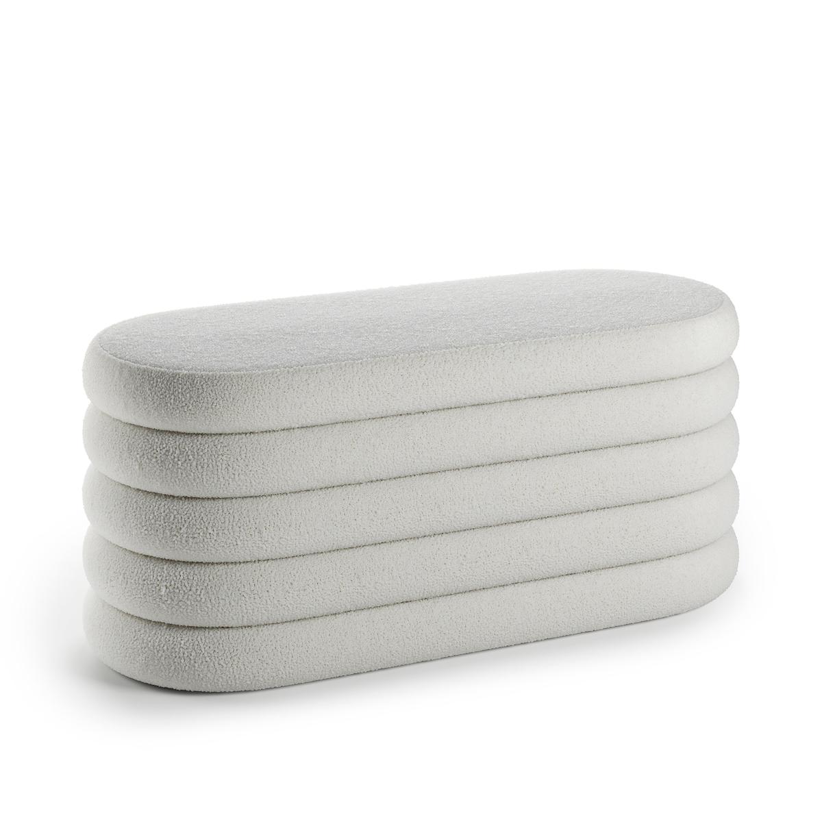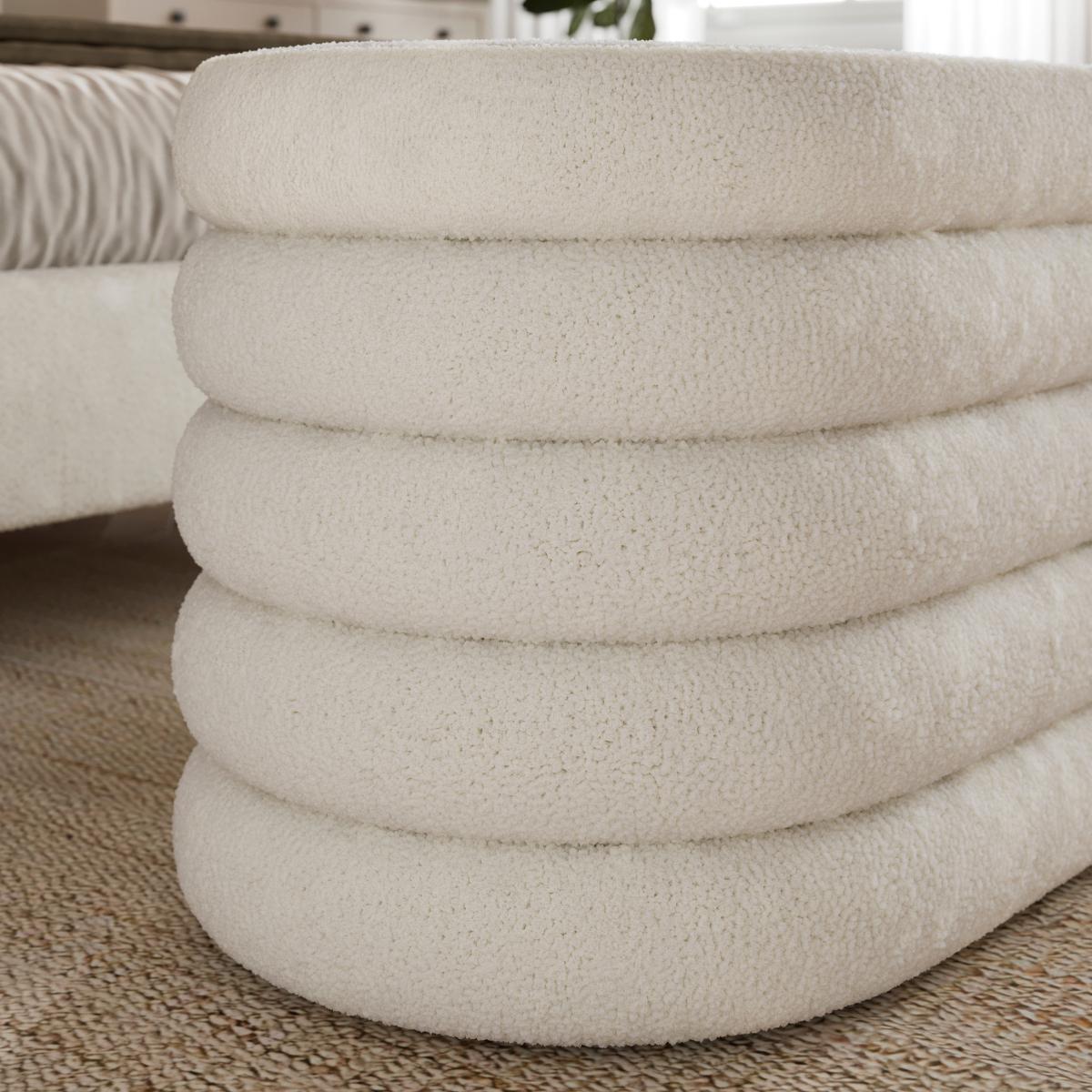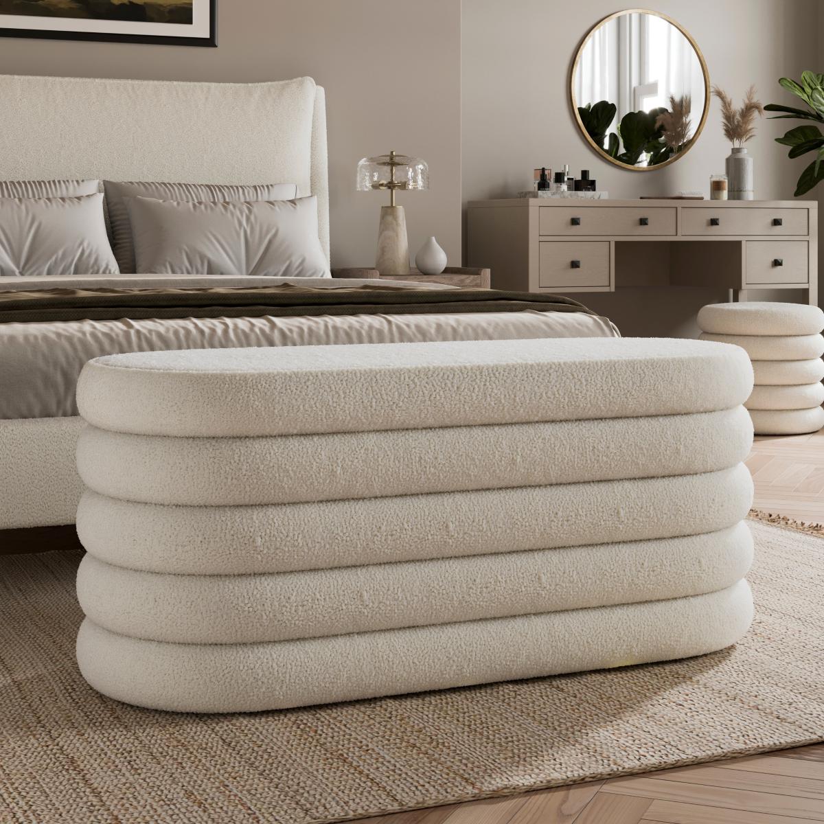 I love this ottoman for its contemporary yet cosy aesthetic, thanks to the plush Sherpa fabric that adds texture and warmth. Its neutral ivory shade makes it versatile, working well in both modern and more traditional interiors, particularly in neutral, light, or Scandinavian-style spaces. Practical styling tips include using it as a multifunctional piece - ideal for extra seating, a centrepiece, or even a footrest in a living room or bedroom. Layer it with soft throws and cushions for added comfort and visual interest, or position it near a statement armchair for a cosy reading nook. Its rounded, bold form also lends itself well to minimal or boutique-style settings, creating a tactile focal point without overwhelming the space.