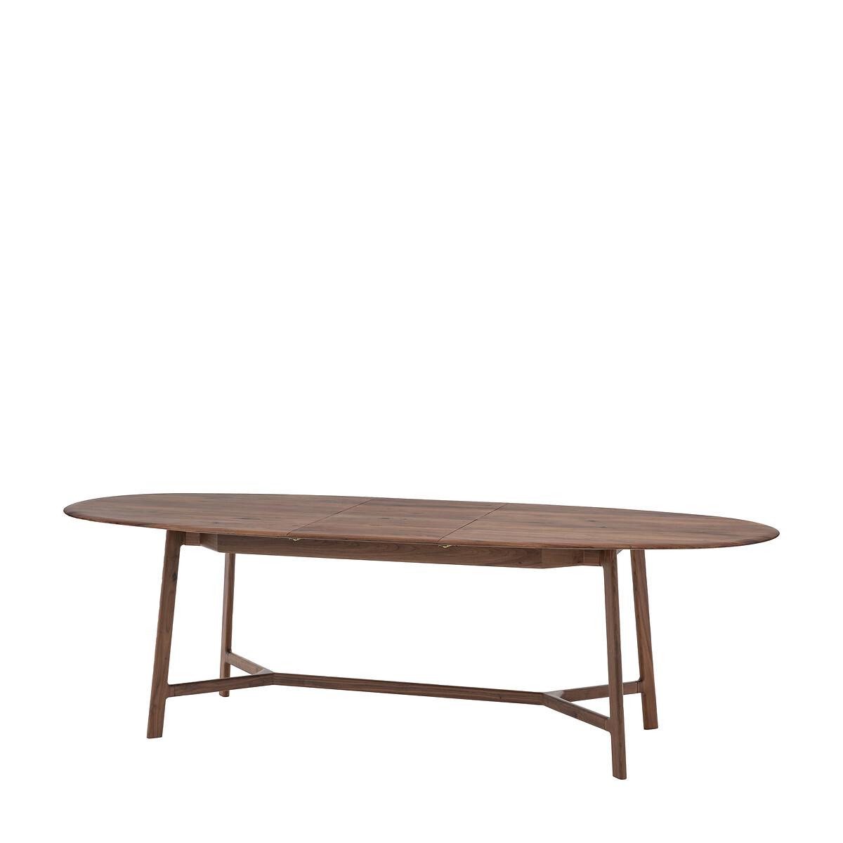 Designed for both everyday dining and effortless entertaining, this walnut extendable dining table is a stylish centrepiece for any home. Its sleek oval shape and soft curves bring a warm, inviting feel, while the smooth extending mechanism makes it easy to accommodate extra guests. The slim, tapered legs add a refined, Scandinavian-inspired touch, keeping the design light and elegant. Finished in rich walnut, it showcases the natural beauty of the wood grain, making it a perfect match for both contemporary and classic interiors. Product Details:• Solid walnut construction• Oval shape• Seats up to 8 people with drop leaf extensions• Partial assembly required• Extension can be stored under the table top• 12 months manufacturers warranty. Product Composition - Solid Walnut. Product Dimensions• Overall Dimensions 100 cm x 200 cm x 76 cm, Weight - 57 kg• Length of table 200cm / 250cm with extension• Clearance to floor 74.2cm. Package Dimensions - 207 cm x 107 cm x 20 cm, Weight - 64 kg. This product will be dispatched by one of our trusted suppliers. You’ll be contacted by their selected courier about your delivery. Please note: this product cannot be delivered to all Offshore Islands, Northern Ireland or Republic of Ireland.