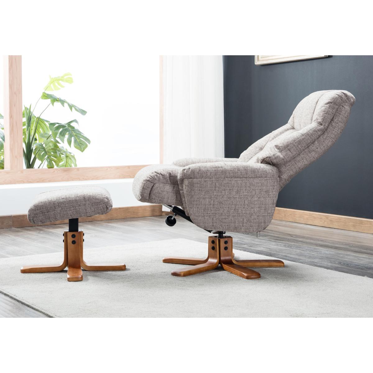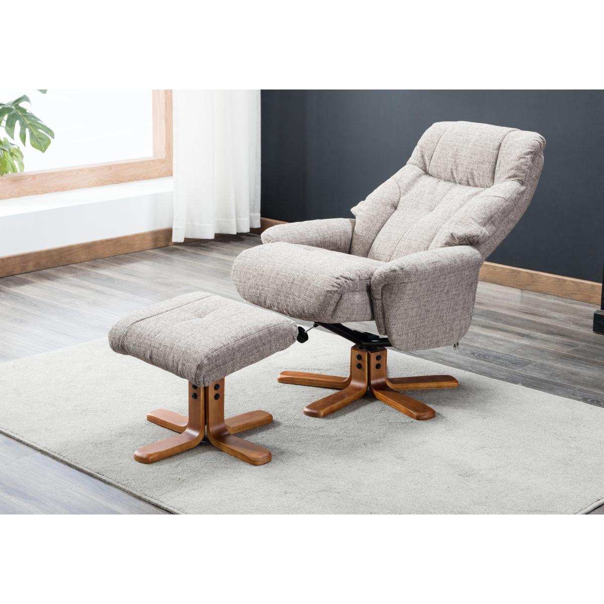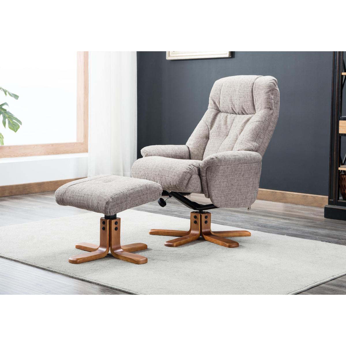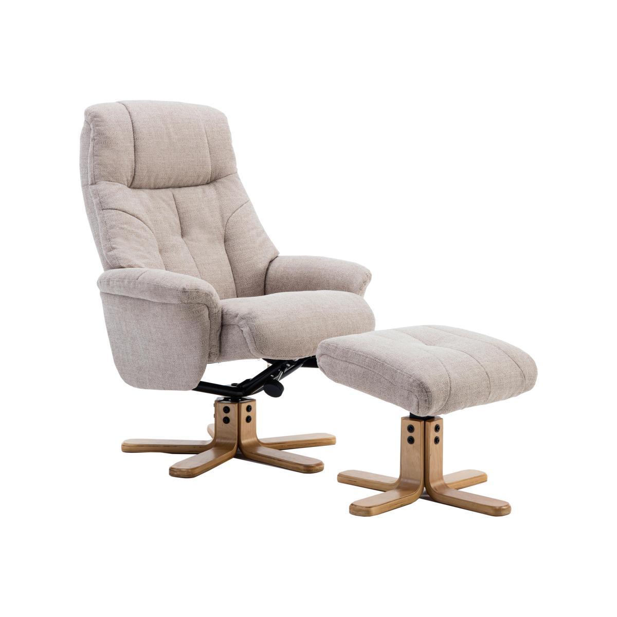 This product requires self- assembly. Style and incredible high- backed comfort comes at a price youll love with the Muscat swivel recliner chairs and footstools. Just twist the easy to operate handles and recline with ease. Choose a colour to complement your dcor, in soft fabric or plush faux leather. The star bases have plenty of retro- modern appeal, in curved wood with an oak finish. Enjoy the comfort of foam with fibre cushioning, beautifully stitched to cocoon you in comfort. Why youll love it High- backed and incredibly comfortable. Beautifully tailored contemporary style. Compact scale suits smaller spaces. Soft- touch fabric upholstery in a choice of textures and colours. Deep cushioning, with a padded headrest and arm cushions. Easy twist handle operates the manual recliner. Chair and footstool have stylishly curved wooden star bases. What you need to know Strong metal frame, wooden arms. Resilient foam and fibre cushioning. Star shaped bases in an attractive oak finish. Some fabrics can show wear on areas of more use or in direct sunlight. Please read our upholstery care guide for more advice. Allow time for recliners to settle. Minor gaps for motion vary by floor type. Manual recliners may feel stiff at first, but will ease with use.