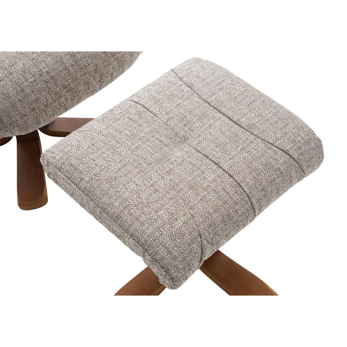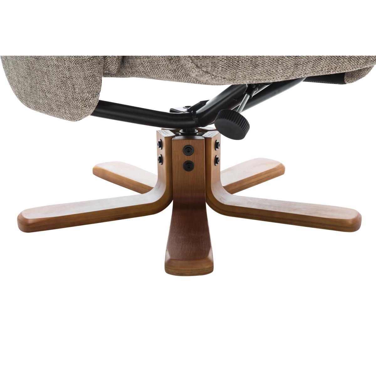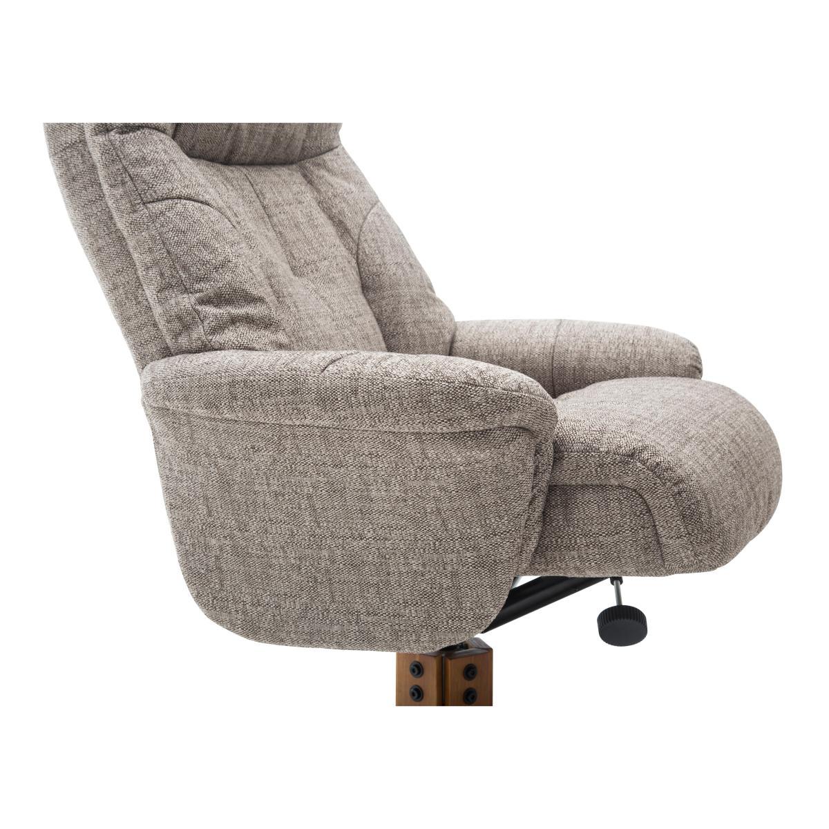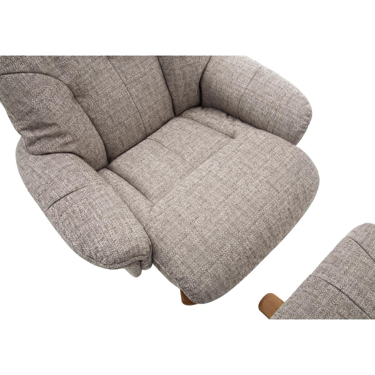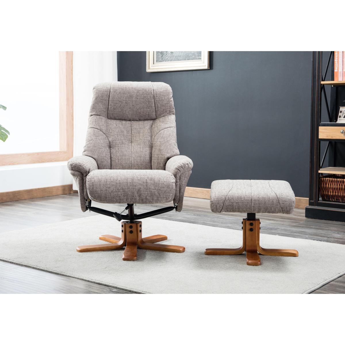 This product requires self- assembly. Style and incredible high- backed comfort comes at a price youll love with the Muscat swivel recliner chairs and footstools. Just twist the easy to operate handles and recline with ease. Choose a colour to complement your dcor, in soft fabric or plush faux leather. The star bases have plenty of retro- modern appeal, in curved wood with an oak finish. Enjoy the comfort of foam with fibre cushioning, beautifully stitched to cocoon you in comfort. Why youll love it High- backed and incredibly comfortable. Beautifully tailored contemporary style. Compact scale suits smaller spaces. Soft- touch fabric upholstery in a choice of textures and colours. Deep cushioning, with a padded headrest and arm cushions. Easy twist handle operates the manual recliner. Chair and footstool have stylishly curved wooden star bases. What you need to know Strong metal frame, wooden arms. Resilient foam and fibre cushioning. Star shaped bases in an attractive oak finish. Some fabrics can show wear on areas of more use or in direct sunlight. Please read our upholstery care guide for more advice. Allow time for recliners to settle. Minor gaps for motion vary by floor type. Manual recliners may feel stiff at first, but will ease with use.