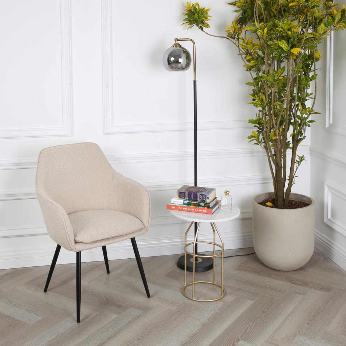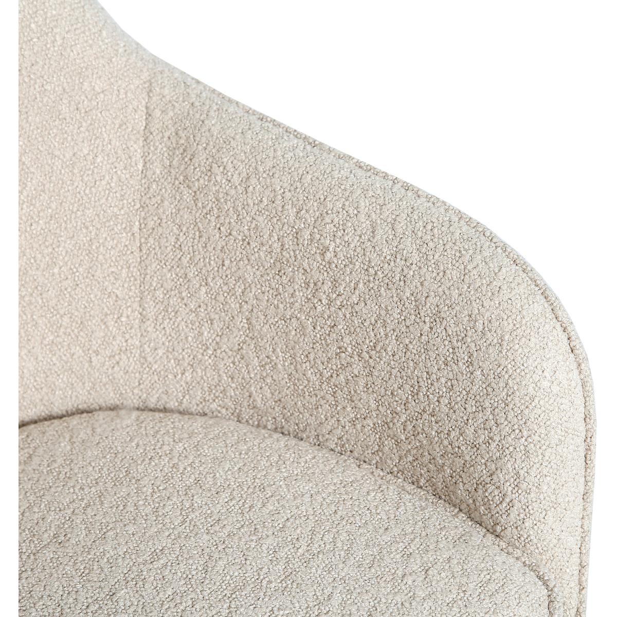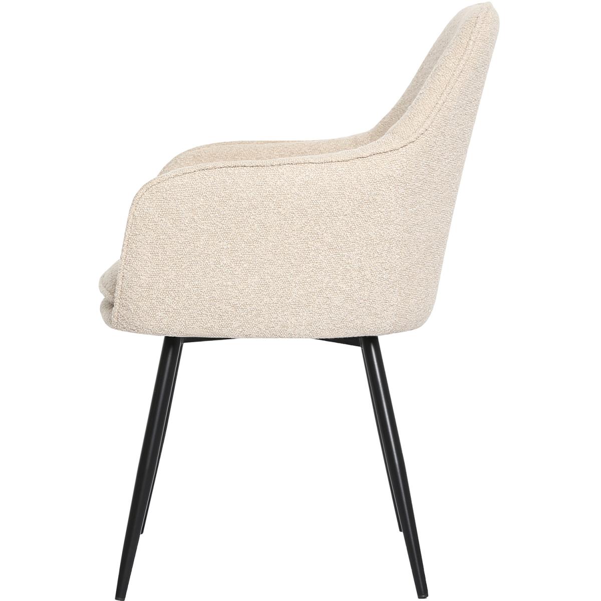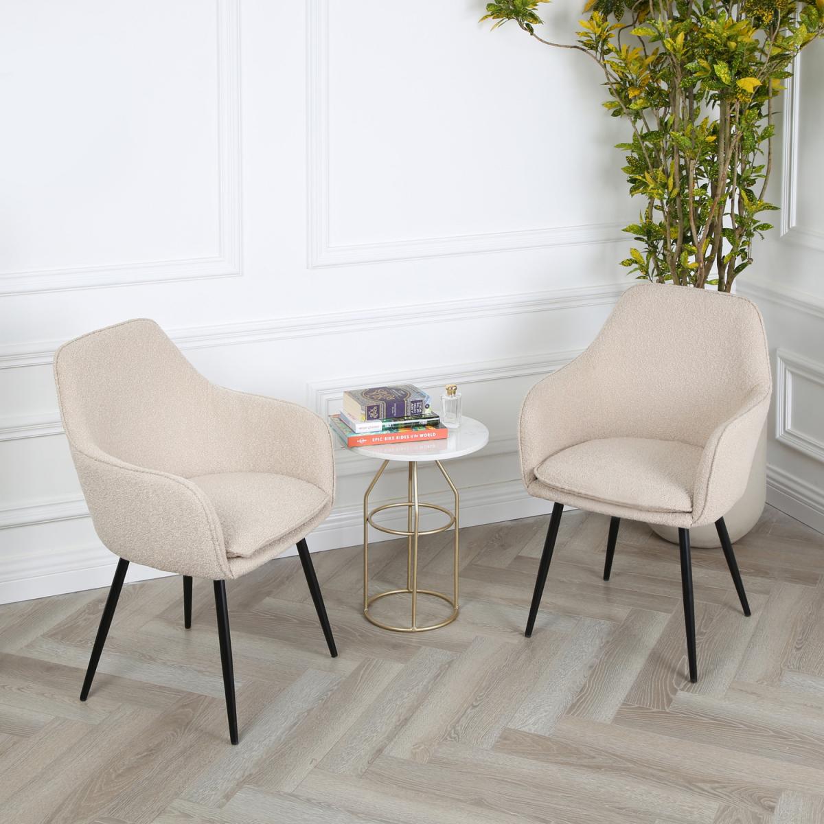 Crafted with mid-century style, this sophisticated Muse boucle accent chair features a softly curved back with armrest that provides improved comfortability. Boosting sleek design, high quality materials and four tapered legs, this teddy bear fabric chair adds that unique majestic touch to any indoor or dining space. If you are looking for a statement piece to improve your room's aesthetics while maximising comfort, this Muse boucle dining chair is the right choice. The cut out detail on the backrest also gives it a contemporary look that stands out and the top level relaxation it provides is owed to its well padded seats.