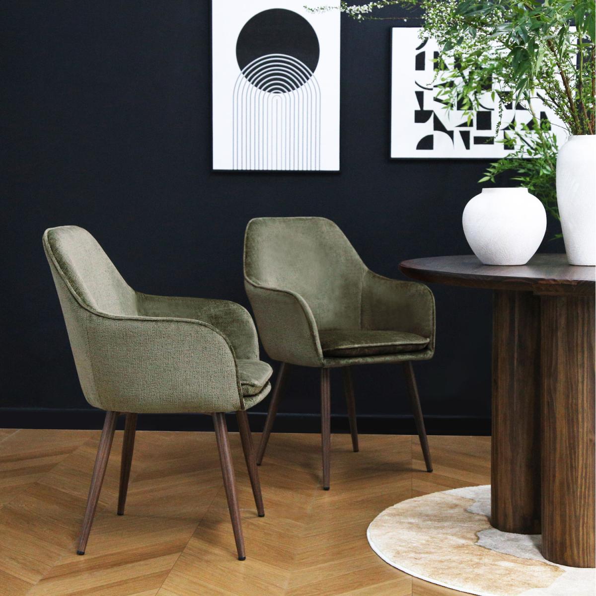 I’m a big fan of these woven green chairs with walnut-effect legs because they strike a neat balance between texture and warmth. The woven fabric adds a subtle tactile layer, while the rich green tone and dark wood finish work brilliantly in mid-century, Scandi or contemporary schemes. To style them practically, group a pair around a round oak or walnut table for intimate dining, then layer in a neutral jute rug to ground the seating area. Accent with brass or matte black accessories and a handful of leafy plants to reinforce that natural colour palette and keep the look fresh without feeling fussy.