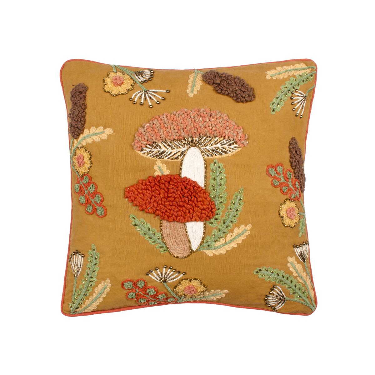 Mushroom Dell Embroidered Cotton Cushion - Autumn Gold / 80 Feather 20 Polyester