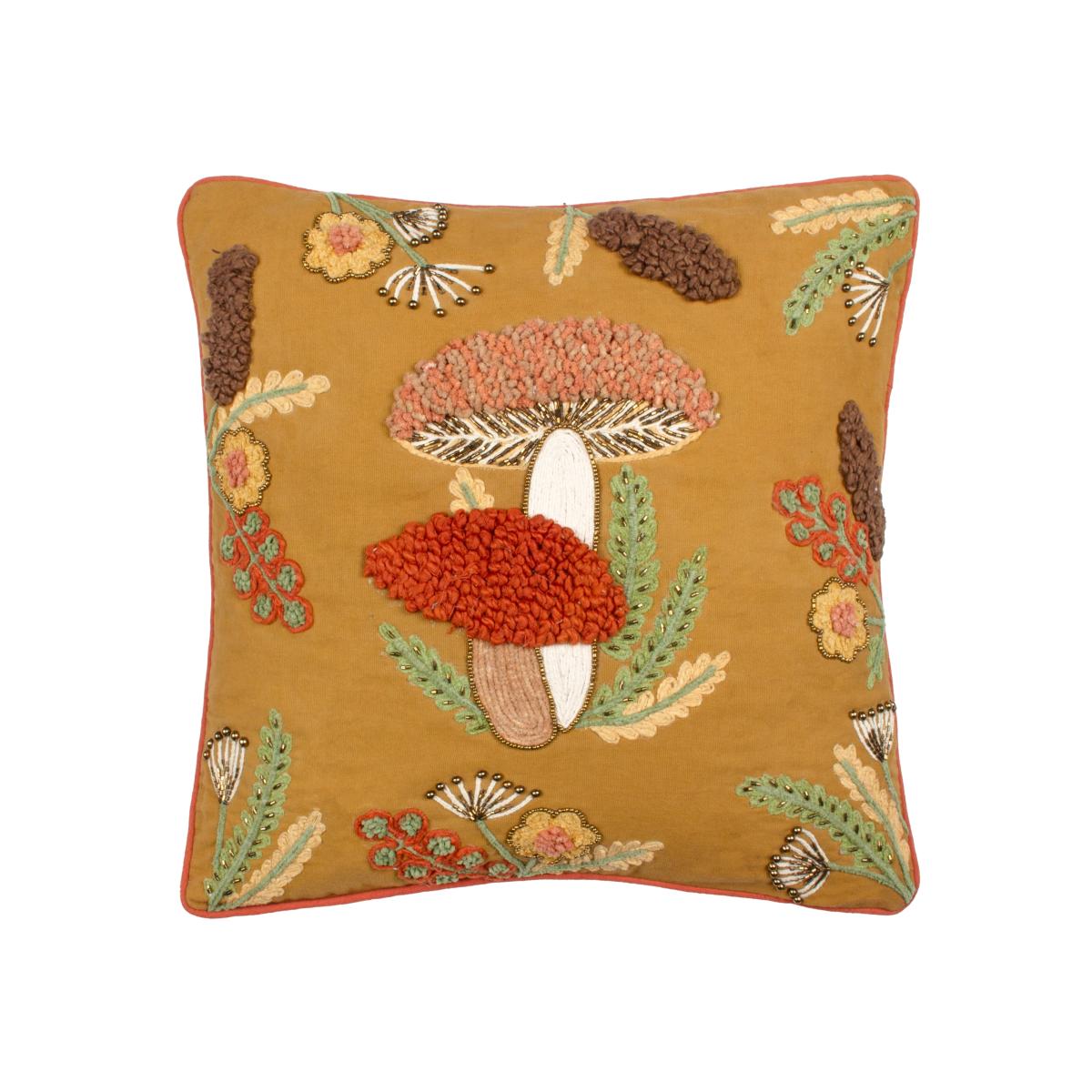 * Nature inspired design* Intricate beading and embroidery* Plain contrasting reverse* Zip fastening* Choice of fillings Bring nature into your living room with this Mushroom Dell cushion. With its intricate embroidery and beading, it will make a striking feature in your space. The rich gold and earthy tones with contrasting vibrant reverse come together perfectly to create a cosy, nature-inspired atmosphere. With a choice of fillings and removable cover with zip fastening, this is a great addition to any room.