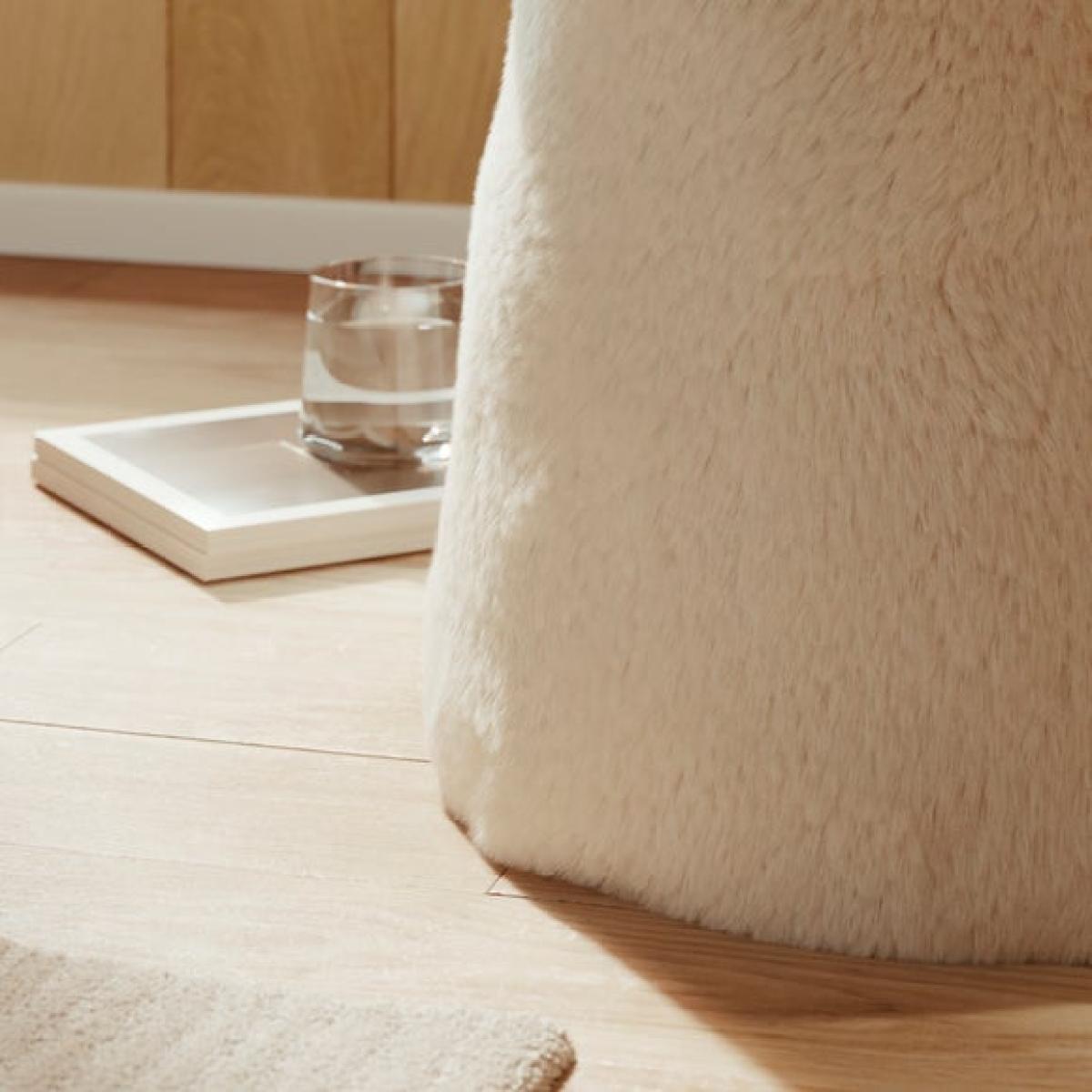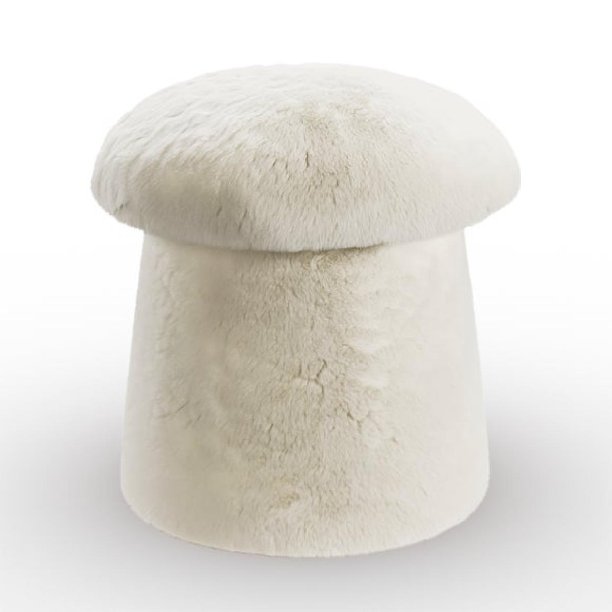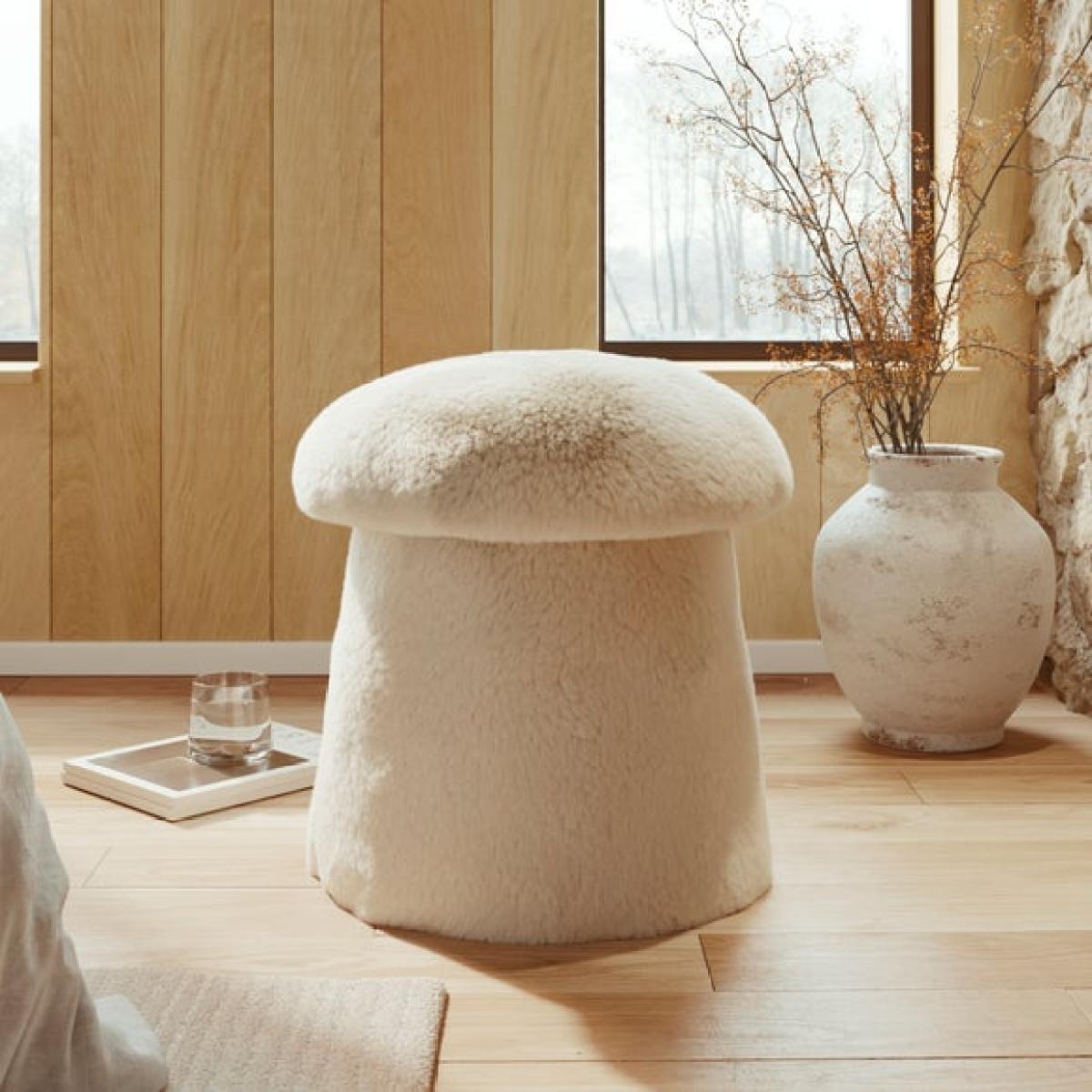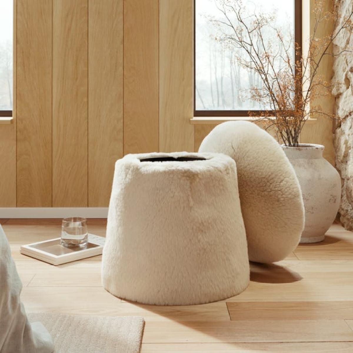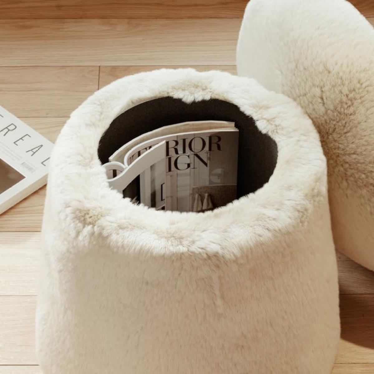 * Modern footstool * Hidden storage * Super soft fax fur This footstool is a playful yet practical piece that brings style and functionality to any room. With its soft, rounded shape inspired by nature, this footstool doubles as a clever storage solution, perfect for tucking away blankets, books, or everyday essentials. Upholstered in super soft faux fur, it adds a touch of texture and warmth to your space.