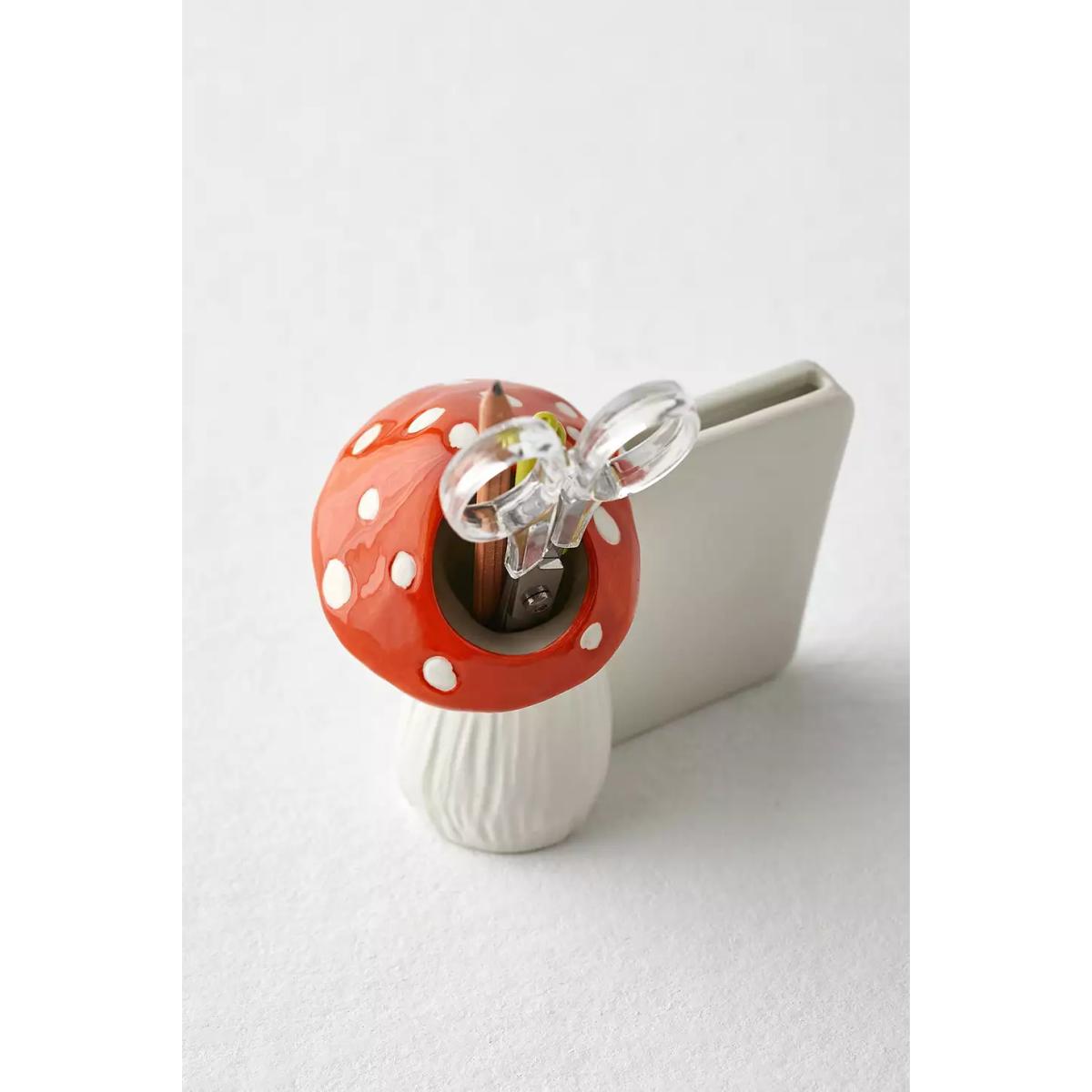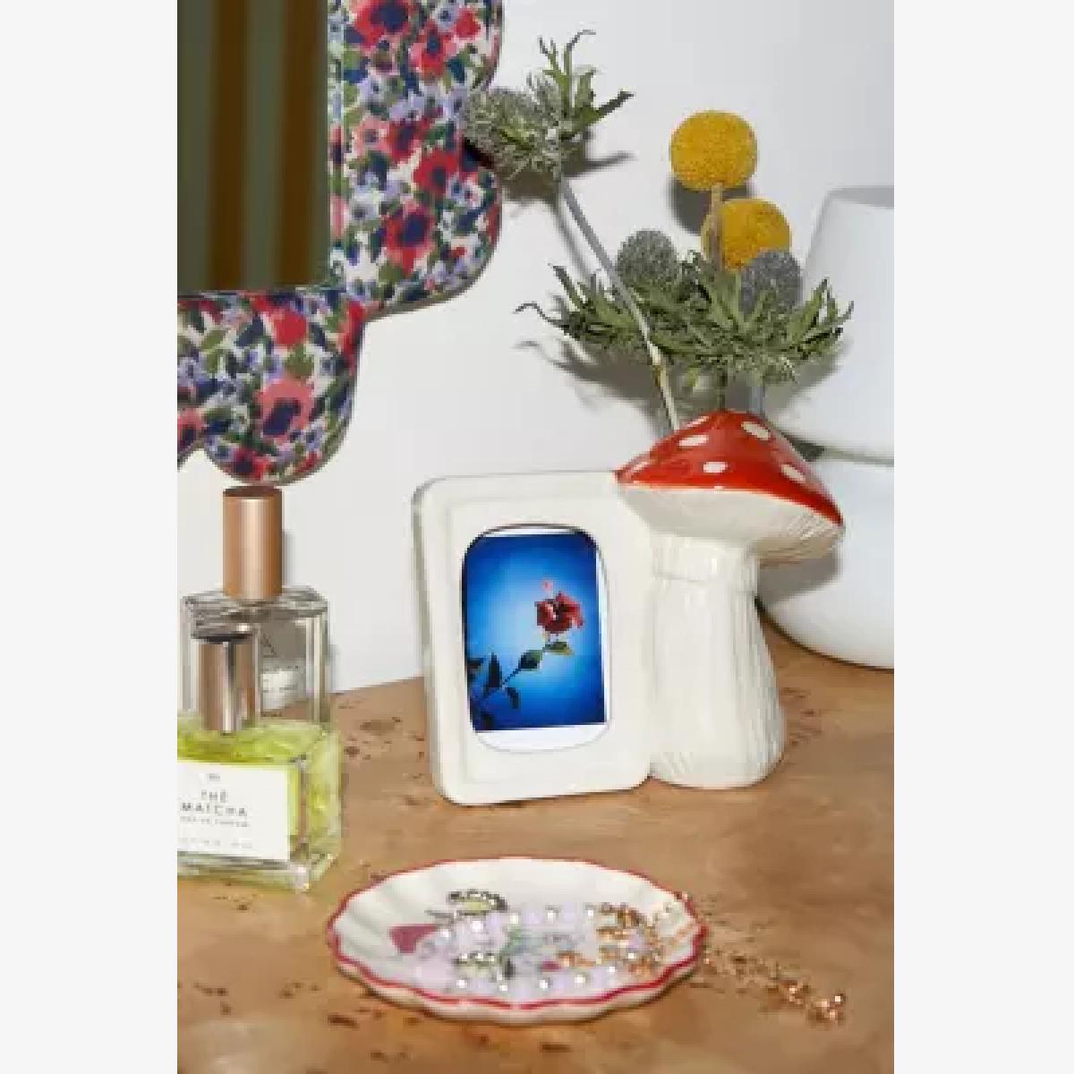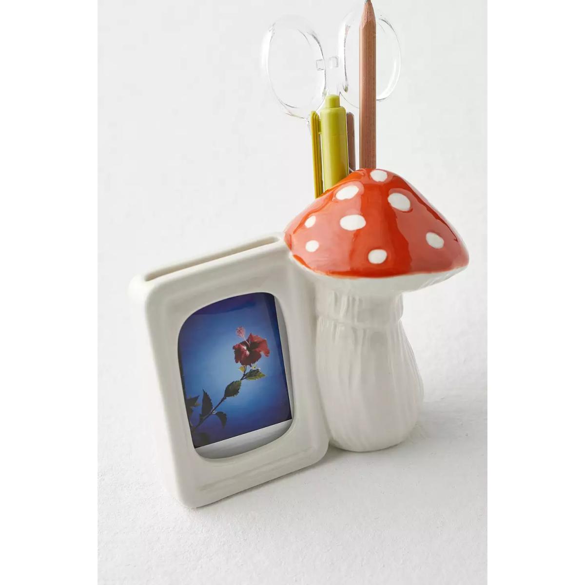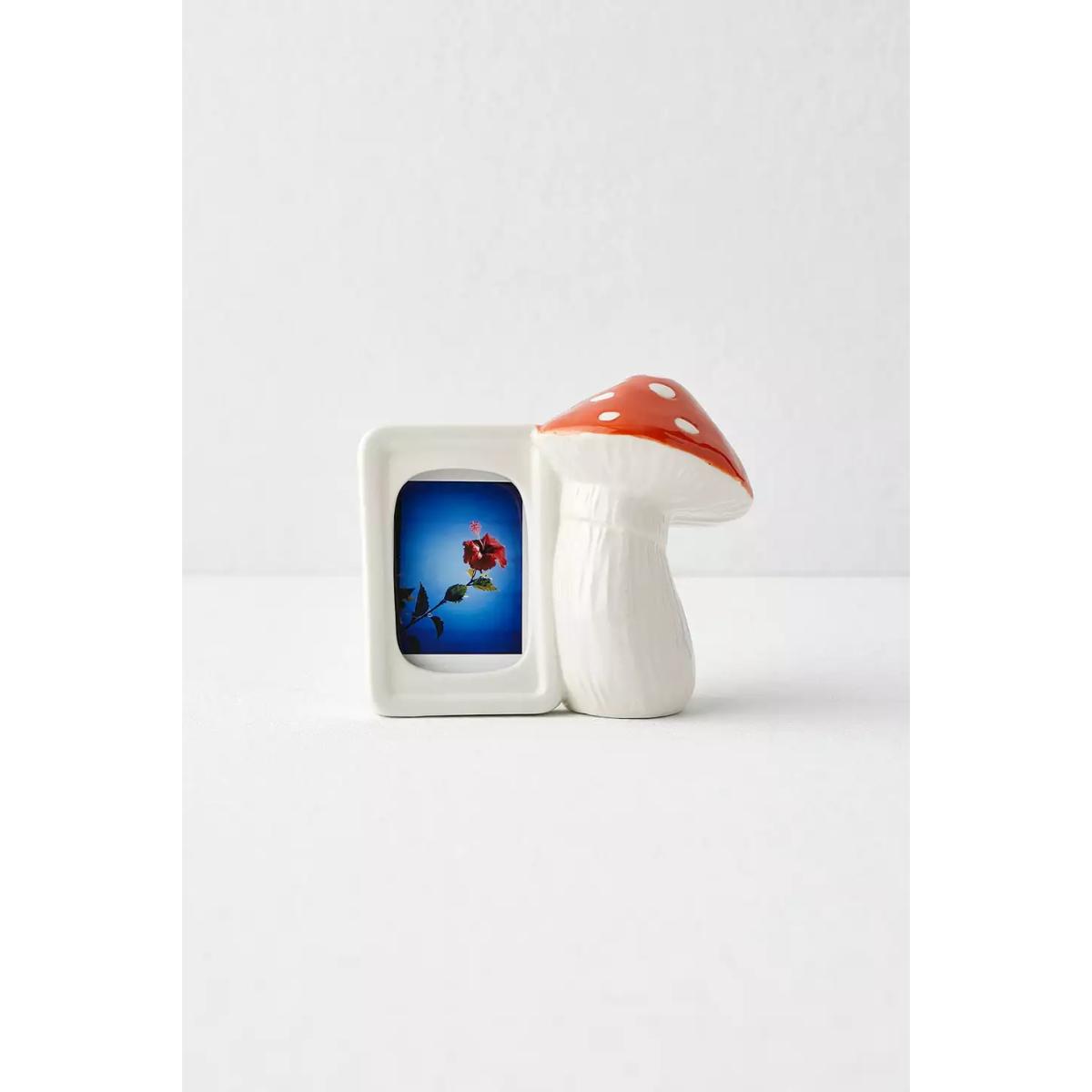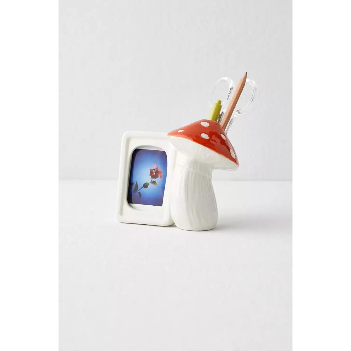 Add a cottage-core touch to your space with this shroomy photo frame. Glazed ceramic construction complete with a square photo frame and mushroom detail with a hole at the top for storing pens or displaying flowers. **Content + Care** \- Ceramic \- Wipe clean