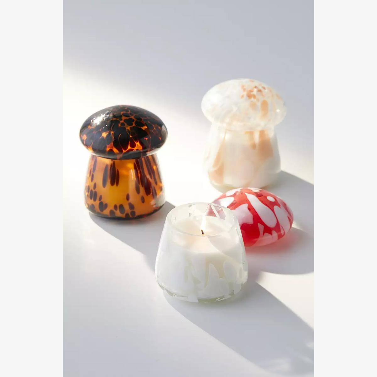 Add a decorative and scented candle to your space with this mushroom-shaped style. Designed with a mushroom-shaped glass vessel with a removable mushroom cap top and scented wax inside. **Content + Care** \- Scent: Sun-warmed wood, balsamic amber, tonka, earthy hay \- 47hr burn time \- Glass, Wax \- Wipe clean **Size** \- Dimensions:Dia: 10.8cm x H: 12.7cm