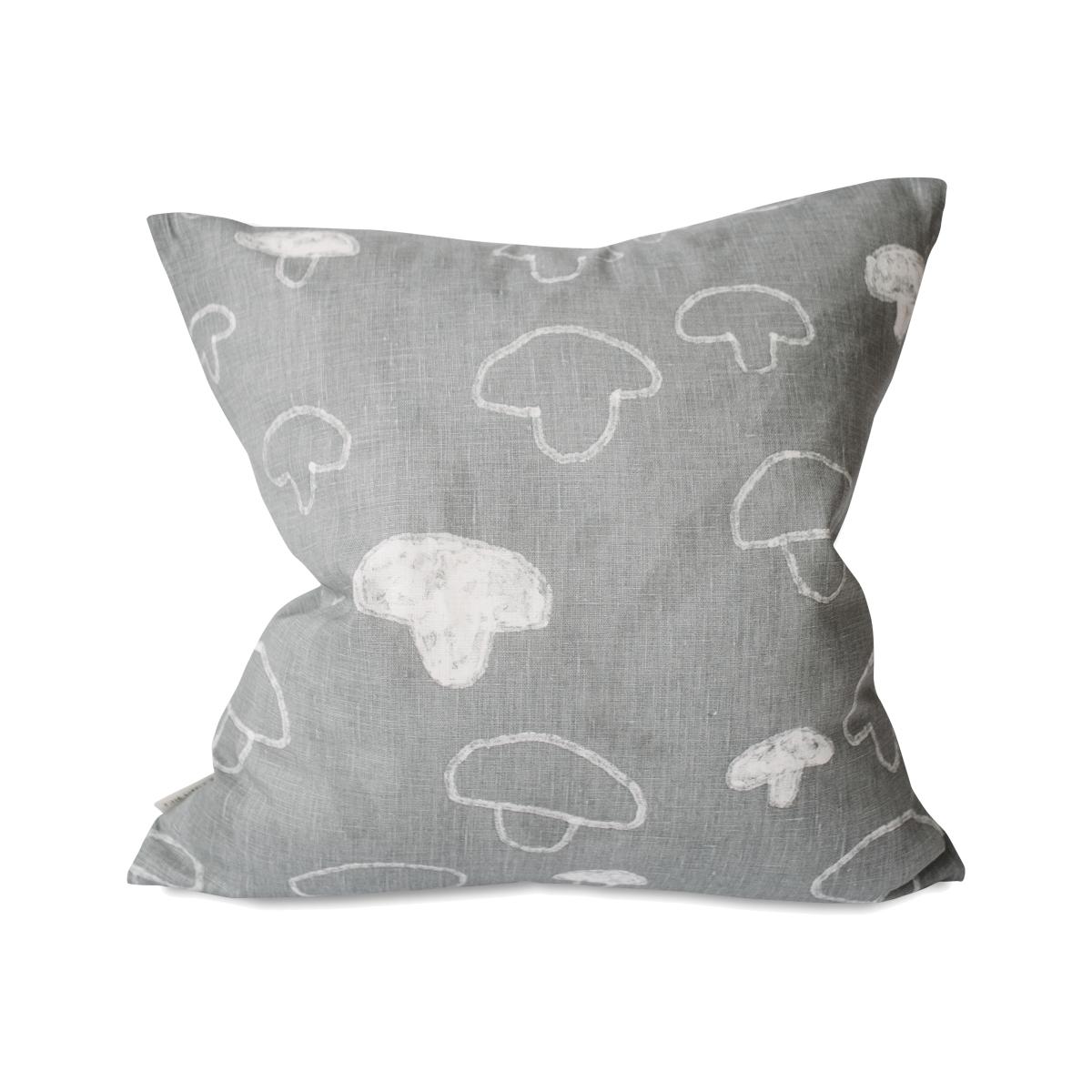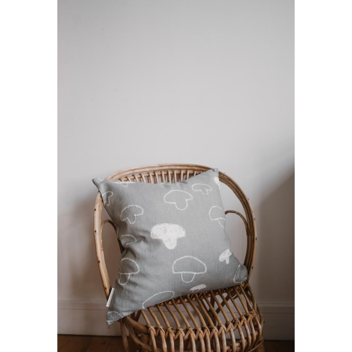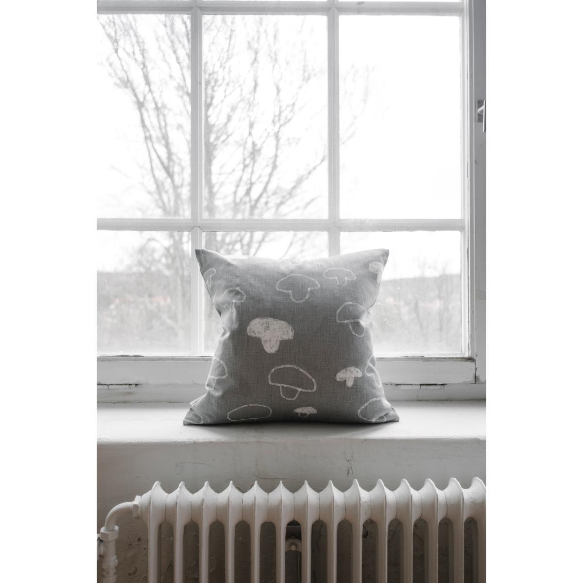 Mushroom pillowcase 48x48 cm from Swedish brand Fine Little Day is a square pillowcase with a printed mushroom pattern designed by Elisabeth Dunker. The pillowcase, which is made of linen, has a zip along the bottom for easy insertion and removal of an inner pillow.