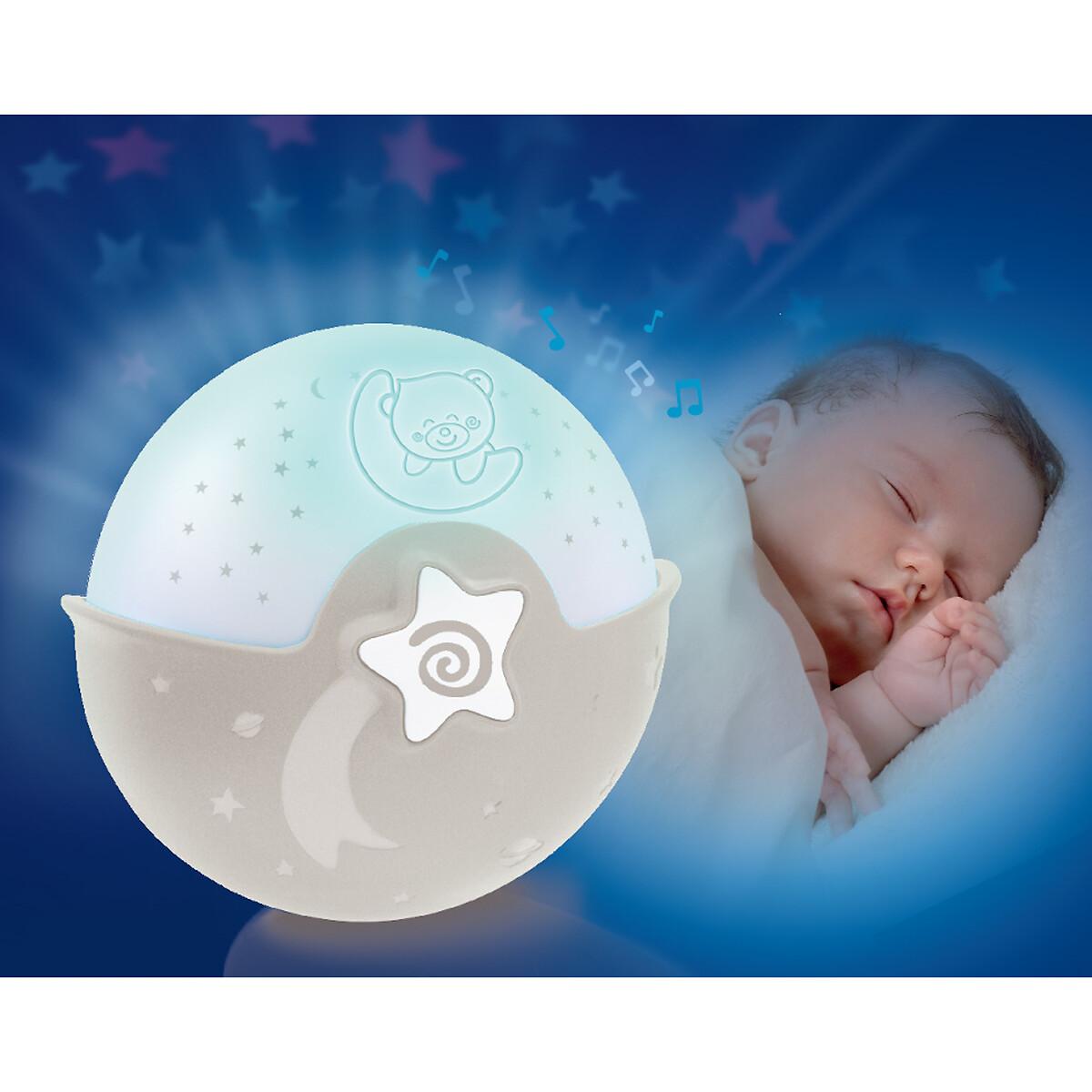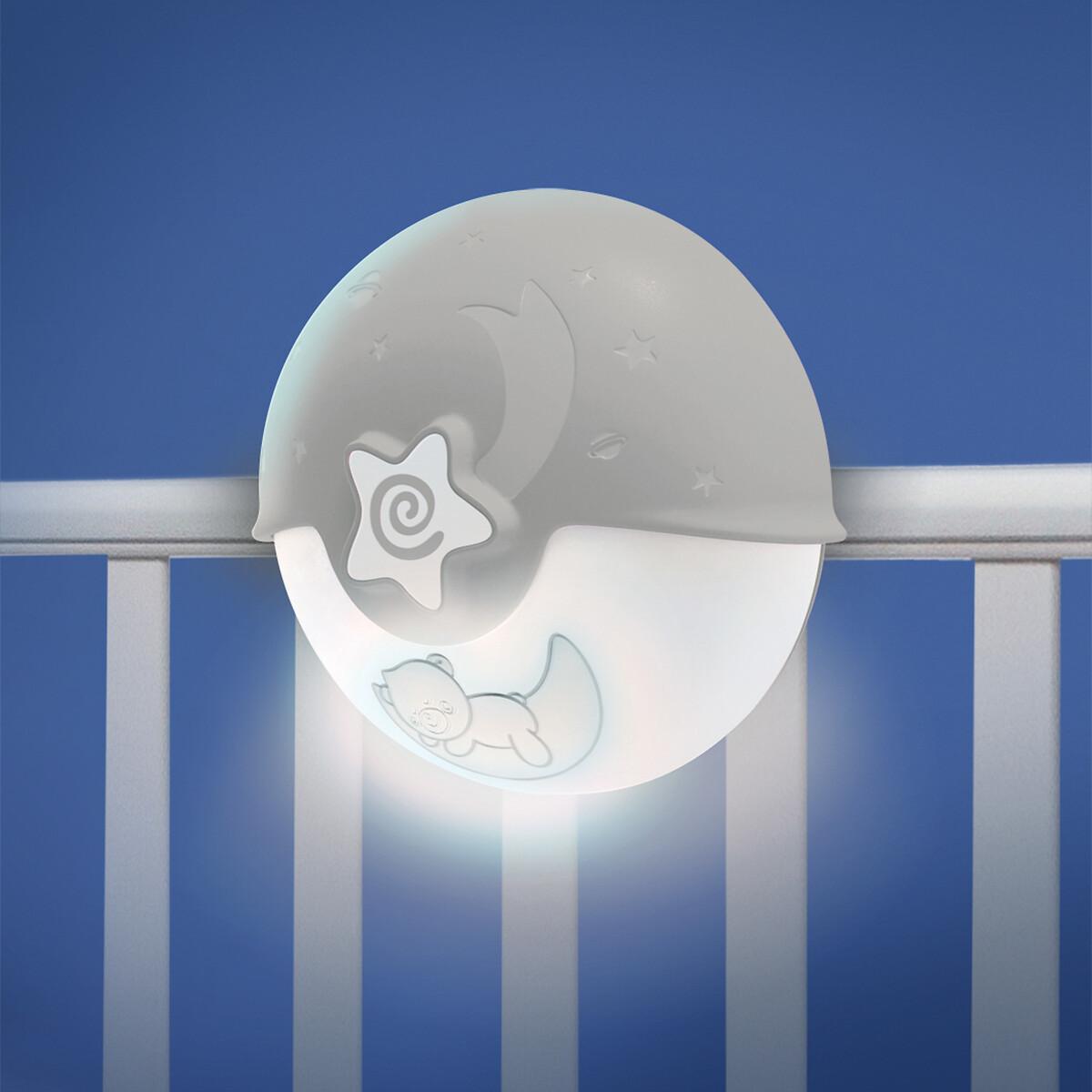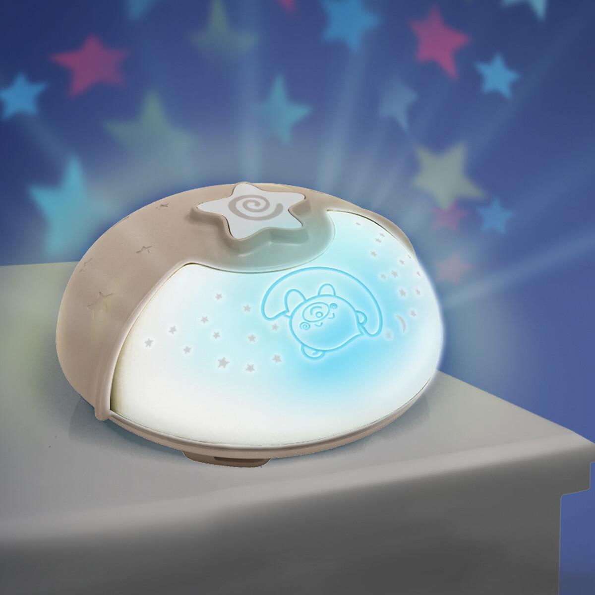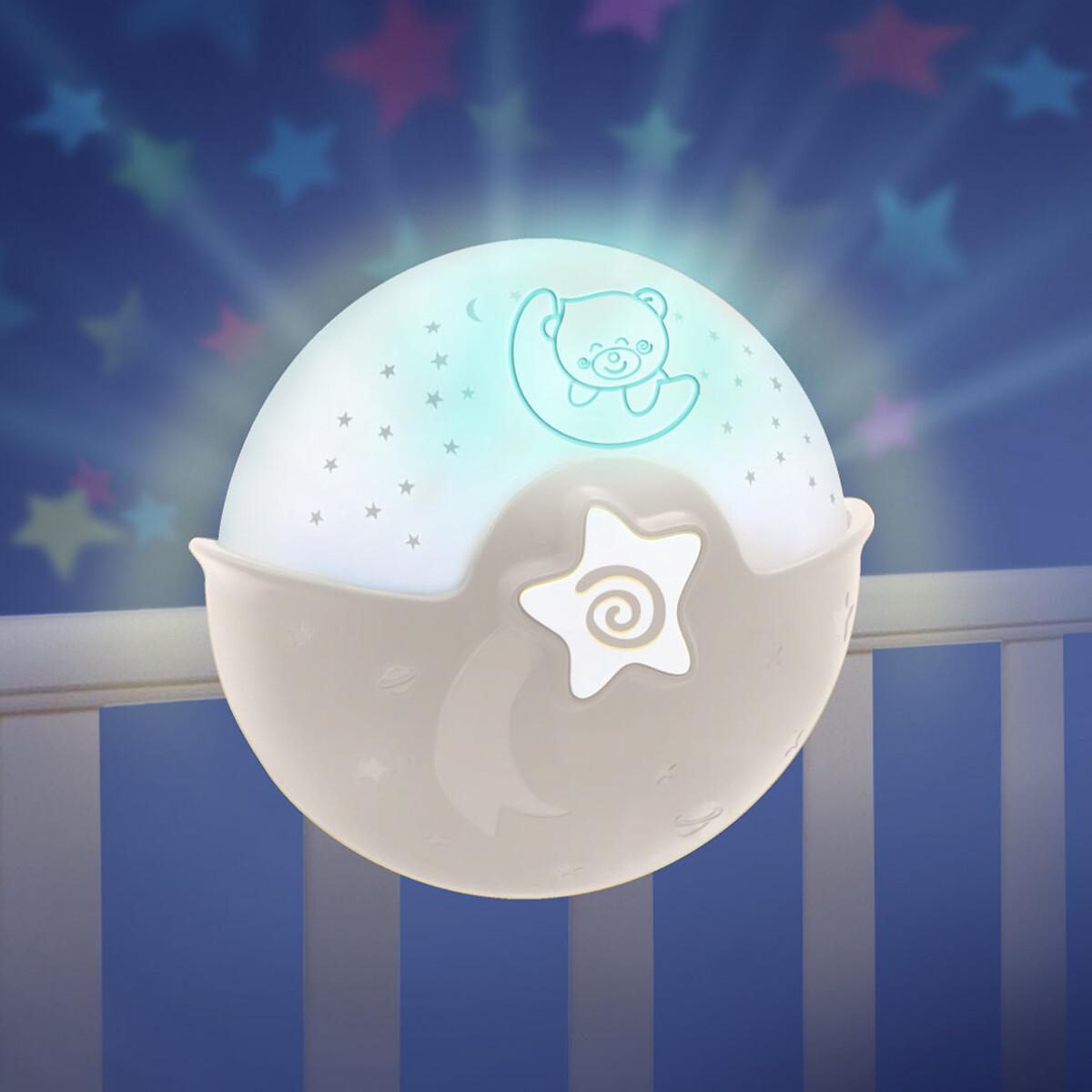 Nightlight, spotlight and Bedside table lamp, the Floor Lamp is a complete nightlight to lull baby to sleep and take him to dreamland. ! A simple gesture to rotate the cover and automatically switch from one mode to another ! Thanks to its multi-coloured projection system and gentle lullabies and sounds of nature, the Floor Lamp will help baby drift off to a peaceful sleep. Thanks to its Night Light function, Projecto Floor Lamp will keep an eye on baby's sleep. With its built-in sound sensor, the Night Light goes off automatically when baby cries ! As baby grows, Projecto Floor Lamp can also be used as a small Bedside table lamp. Operates on 3 LR06 batteries (not included) • Design:The Night Light projects a starry sky onto the ceiling and walls, helping babies and young children to feel safe in the dark and sleep through the night; • Advantages: when the baby cries, the wake-up mode is activated by sound sensors - parents are alerted by a soothing melody and light projections; • Use: The Night Light attaches easily to any Cot, grows with the child and can be used as a Bedside lamp - providing projections to keep the little ones entertained; • Cleaning: The Floor Lamp can be simply wiped clean / The Night Light is suitable from birth; • Intelligently developed products for happy parents : At Infantino we are delighted to create ingenious products that are used & appreciated by parents all over the world